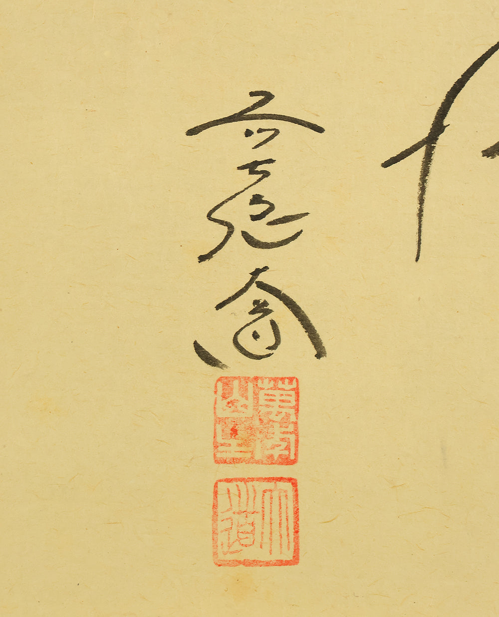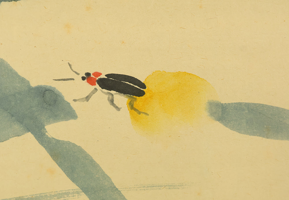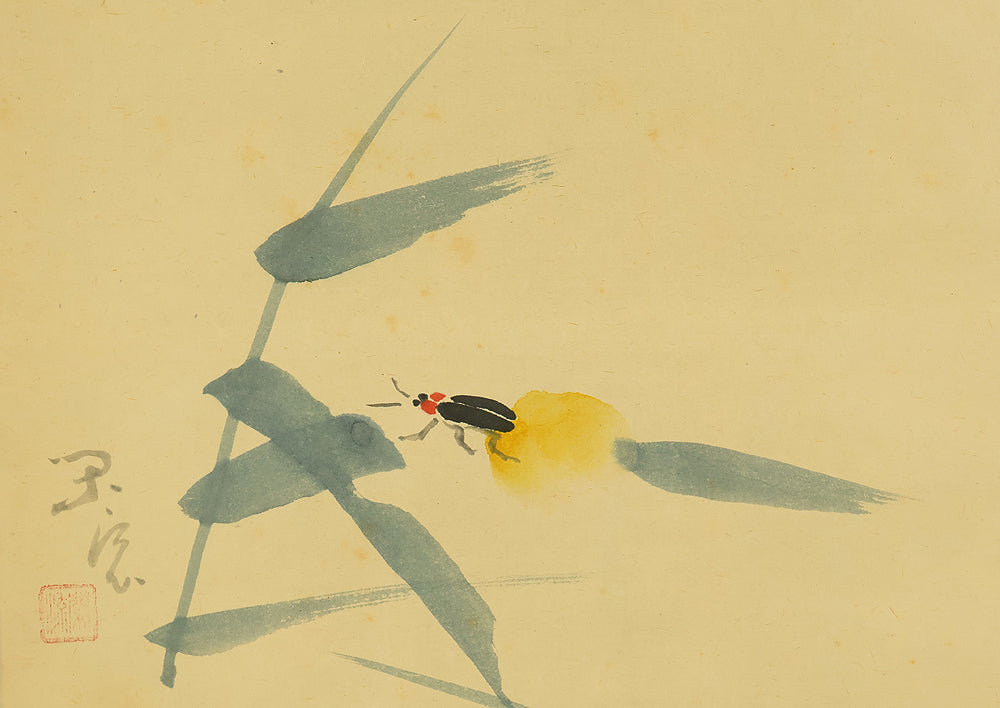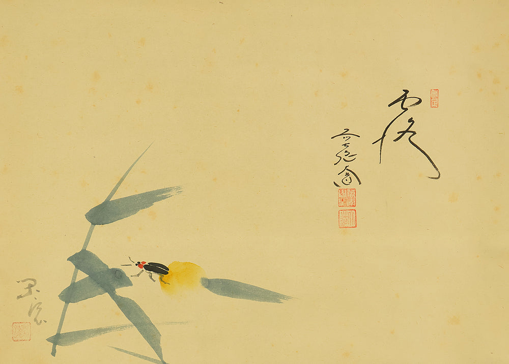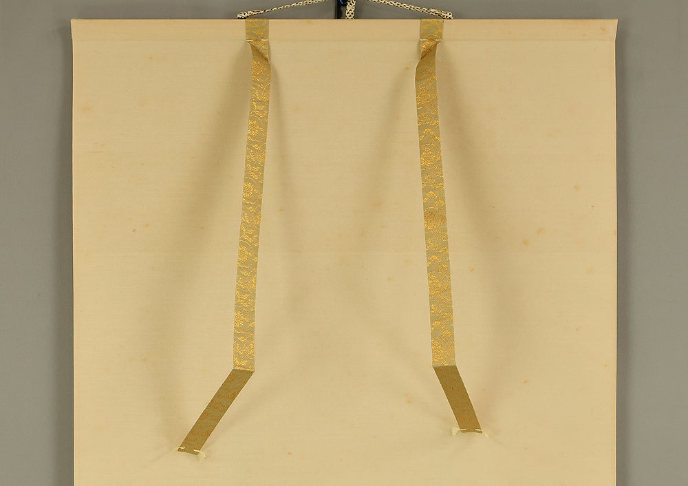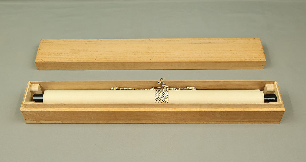 This Zen hanging scroll by Nishigaki Daido (西垣大道, b.1942)—chief priest of Gokurakuzen-ji, Daitoku-ji—features the evocative inscription “露” (Tsuyu, Dew), paired with a delicate depiction of a firefly, symbolizing fleeting brilliance and quiet revelation. In Zen thought, Tsuyu represents the emergence of truth from the unseen, much like dew forming from vapor—an analogy for the Buddha-nature manifesting in the most ordinary moments and actions. Signed “Zen Daitoku Daido” (前大徳 大道) and sealed “Mannen sanshu” (萬年山主) and “Daido” (大道), the scroll is accompanied by its original box (tomobako), affirming its authenticity and reverent preservation. This piece embodies the contemplative clarity and poetic subtlety of modern Rinzai Zen calligraphy, offering a quiet yet profound focal point for meditation, tea practice, or interior display.