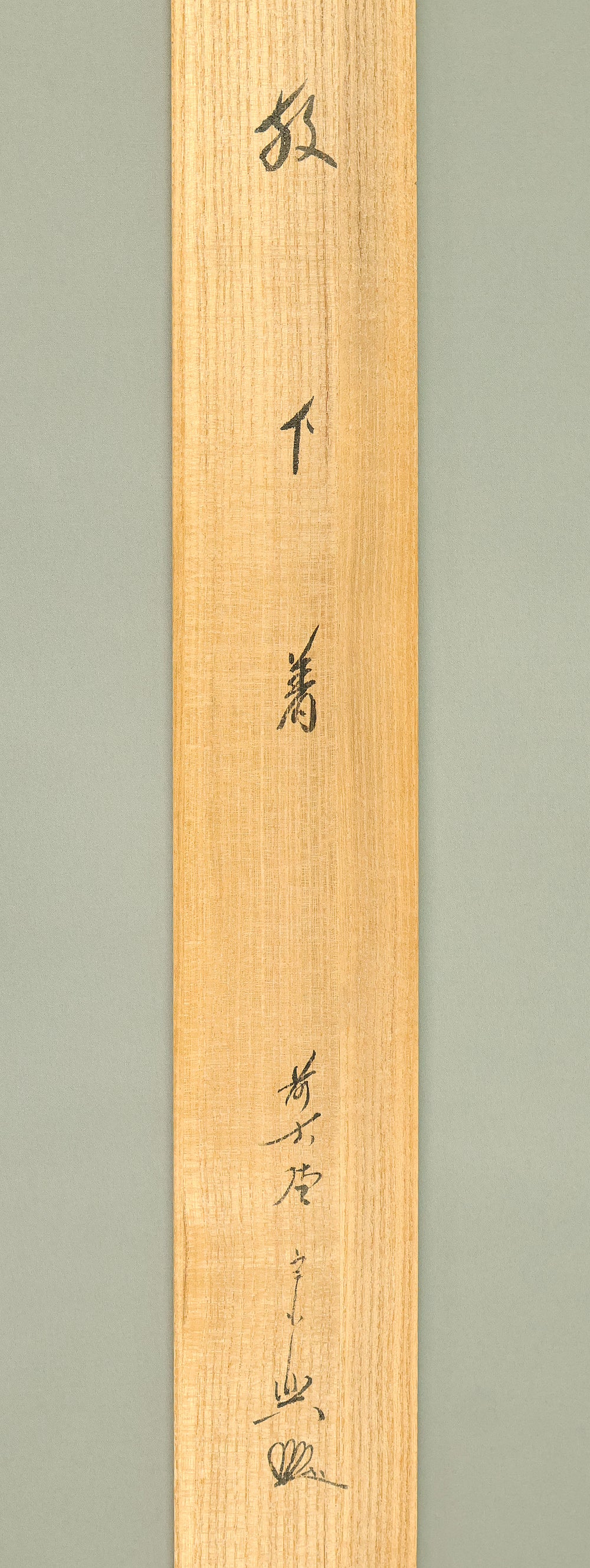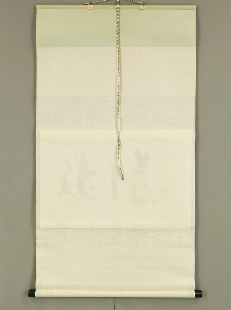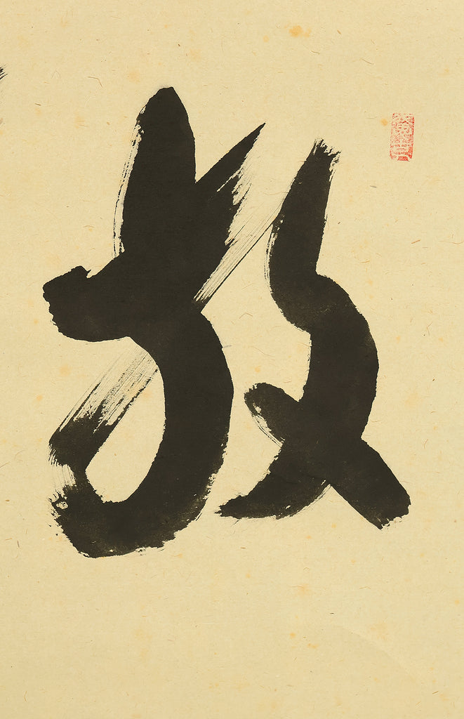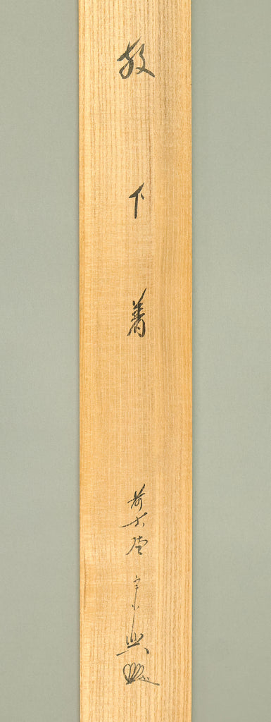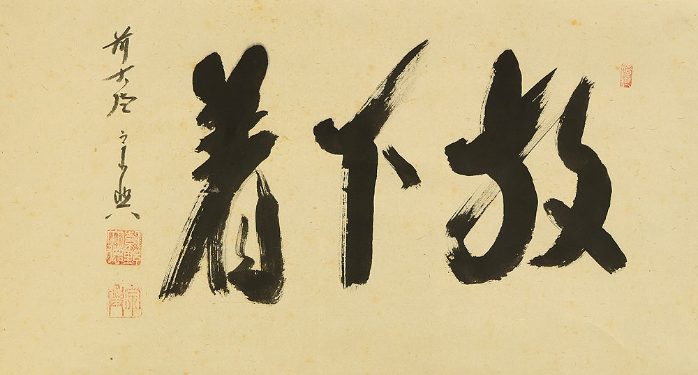 This Zen hanging scroll by Nishigaki Soko (1908–1985), former abbot of Shinjuan at Daitoku-ji Temple, features the powerful inscription “Hogejaku” (放下着)—a core Zen teaching meaning “cast off everything” or “let go of all attachments.” Boldly brushed in expressive calligraphy, the phrase invites deep reflection on the nature of liberation, urging one to release pride, regret, fixation, and preconception in pursuit of a mind free in the present moment. The scroll bears the signature “Zen Daitoku Soko” (前大徳宗興) and seals “Murasakino Daitoku” (紫野大徳) and “Soko” (宗興), affirming its origin within the Daitoku-ji Zen tradition. Housed in its original tomobako, the scroll shows stains and creases, consistent with age and use, adding to its contemplative character and historical depth.