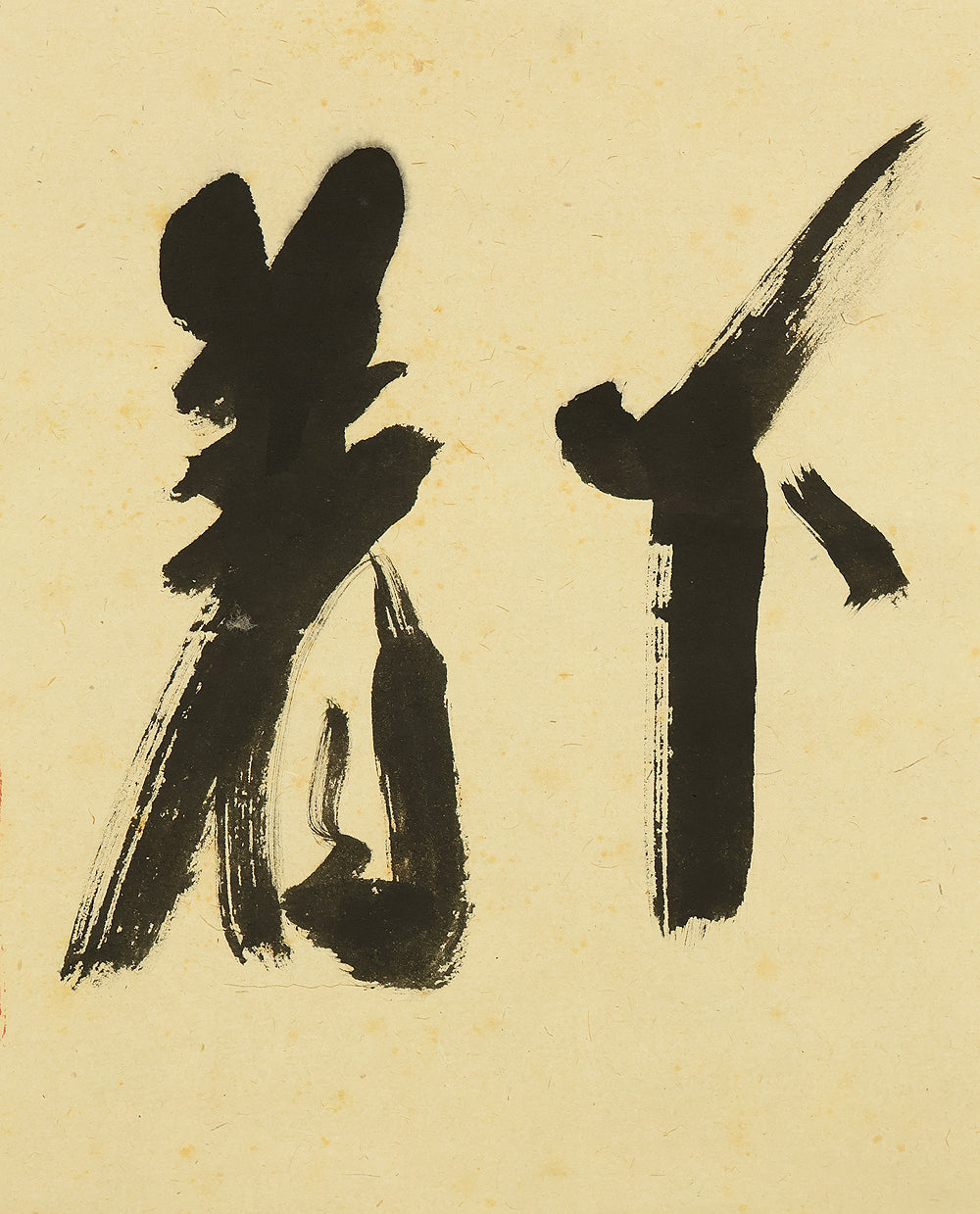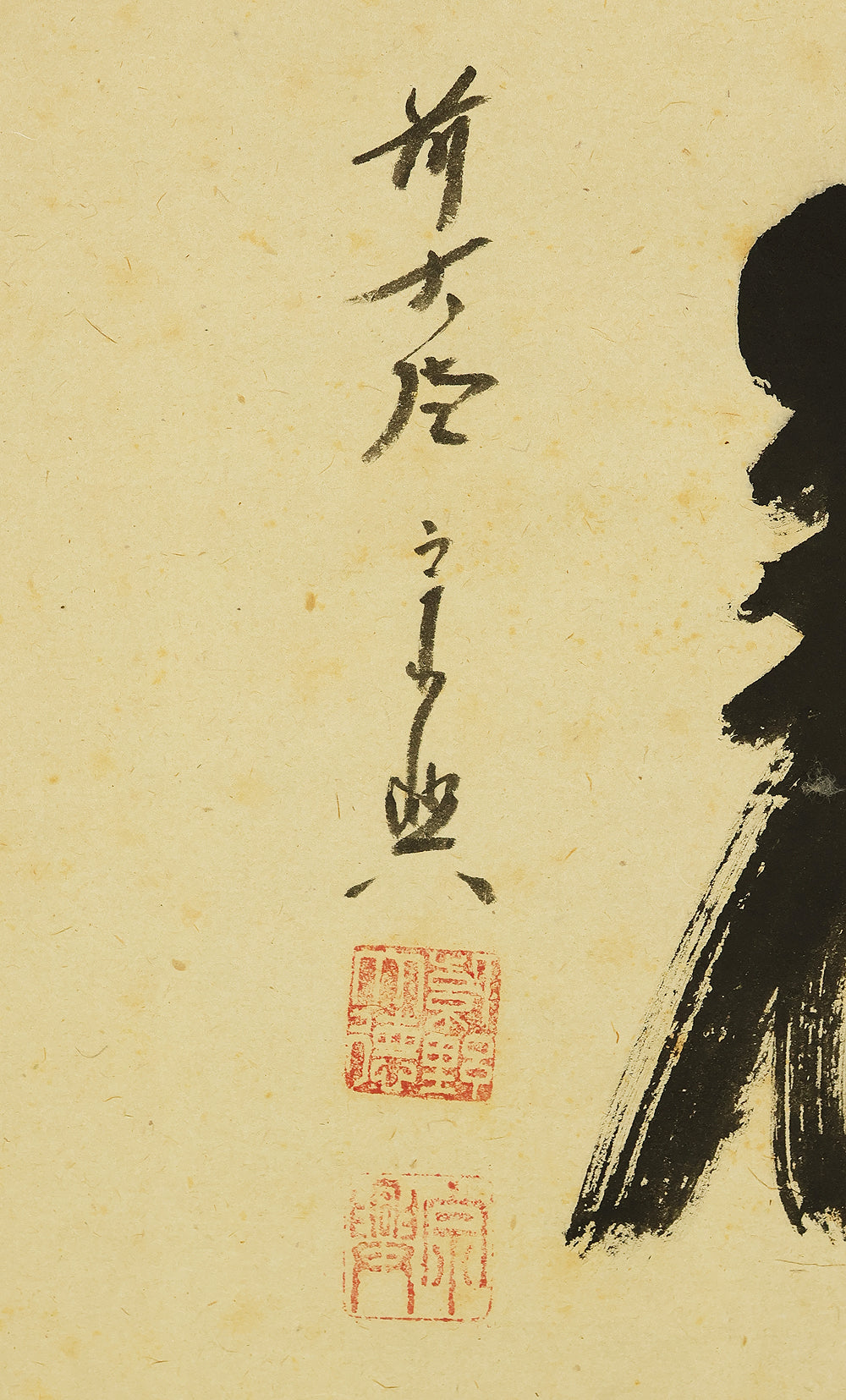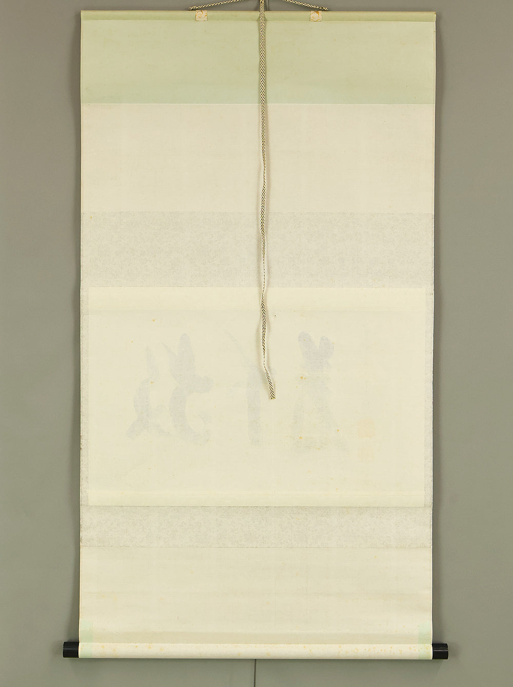 This Zen hanging scroll by Nishigaki Soko (1908–1985), former abbot of Shinjuan at Daitoku-ji Temple, features the powerful inscription “Hogejaku” (放下着)—a core Zen teaching meaning “cast off everything” or “let go of all attachments.” Boldly brushed in expressive calligraphy, the phrase invites deep reflection on the nature of liberation, urging one to release pride, regret, fixation, and preconception in pursuit of a mind free in the present moment. The scroll bears the signature “Zen Daitoku Soko” (前大徳宗興) and seals “Murasakino Daitoku” (紫野大徳) and “Soko” (宗興), affirming its origin within the Daitoku-ji Zen tradition. Housed in its original tomobako, the scroll shows stains and creases, consistent with age and use, adding to its contemplative character and historical depth.