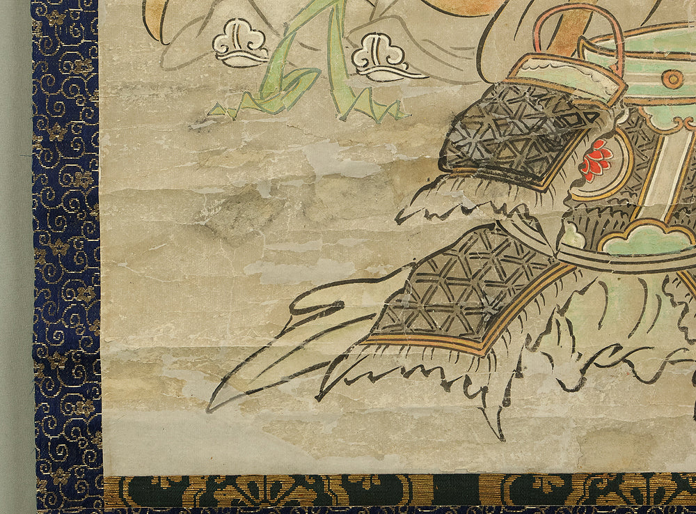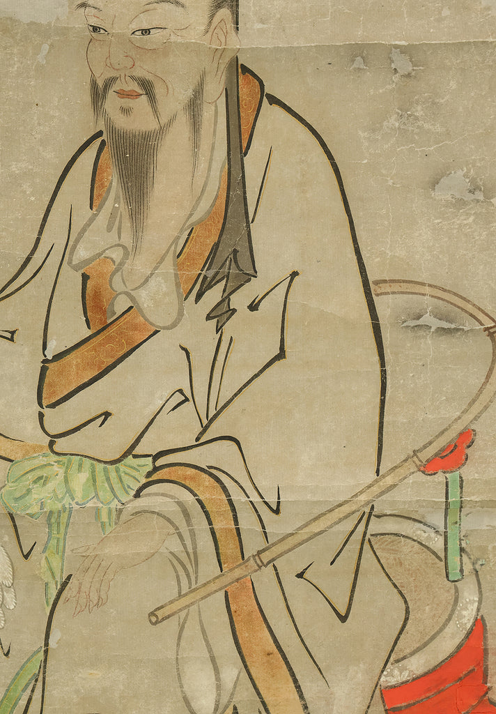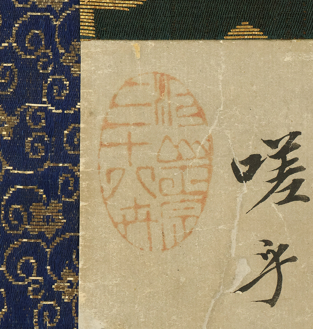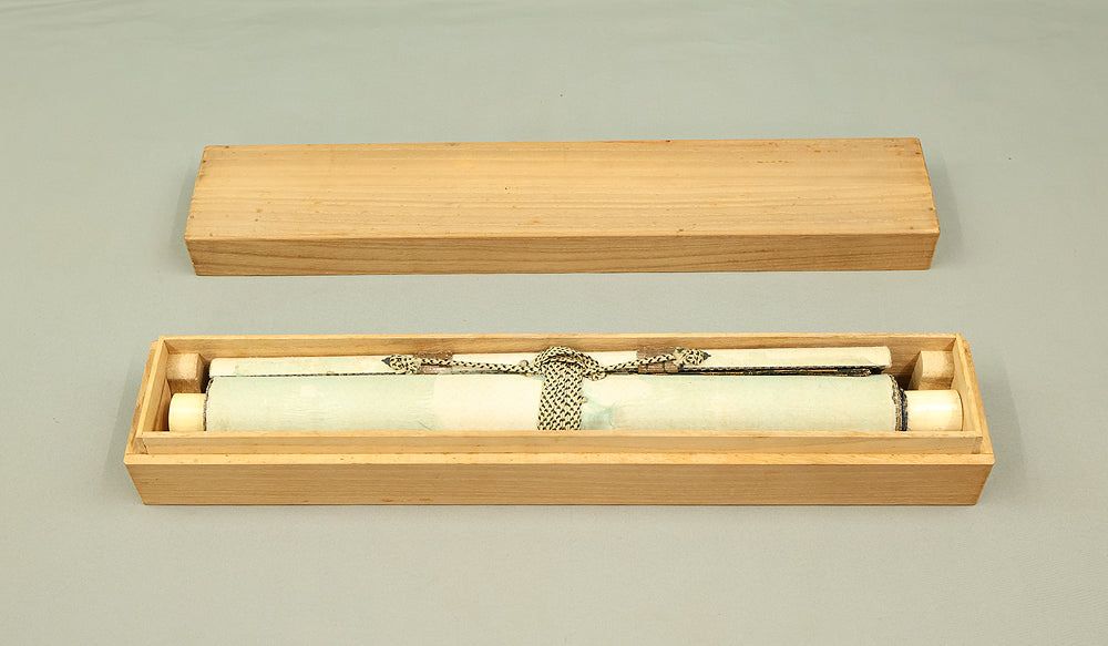 This hanging scroll, attributed to Miyamoto Musashi (1584–1645), features a portrait of Confucius (Kōshi), the revered Chinese philosopher and founder of Confucianism. Rendered in expressive ink and accompanied by classical calligraphy, the figure is depicted with dignified serenity, embodying the ideals of wisdom and moral cultivation. Musashi, famed as a swordsman, strategist, and founder of the Niten Ichiryu school of two-sword technique, was also a gifted painter and calligrapher in his later years. This work bears the seal “Niten” (二天), a name Musashi adopted in his final period, reflecting his philosophical evolution and artistic maturity. The scroll is housed in a box and represents the rare intersection of martial and scholarly traditions in early Edo-period Japan.