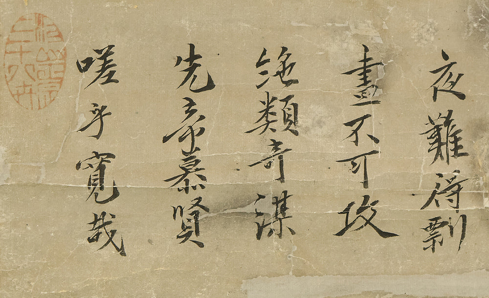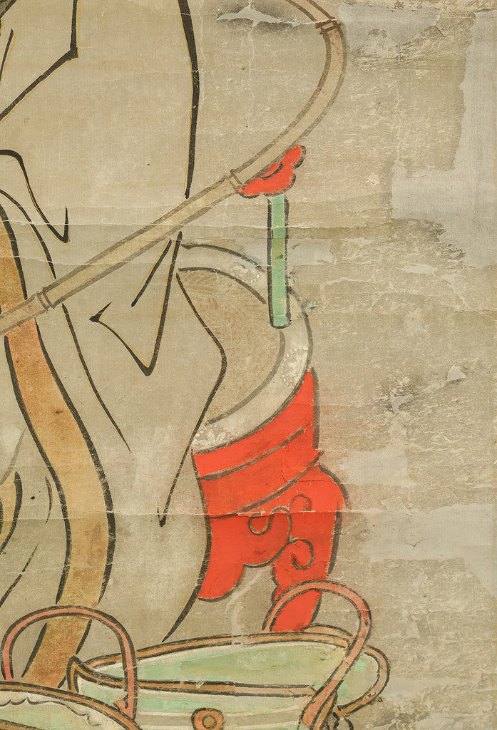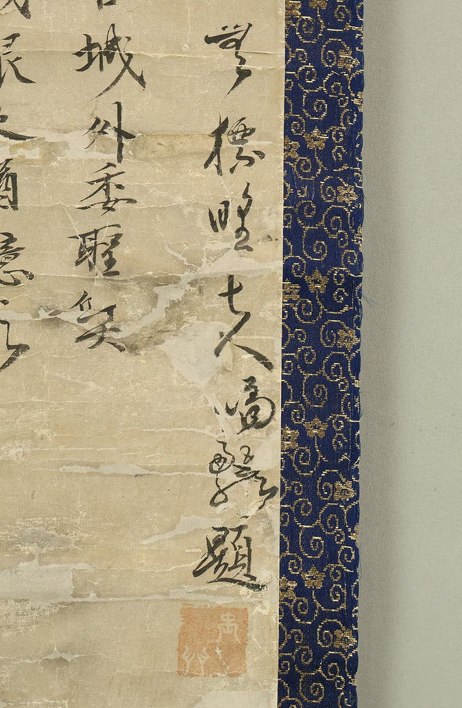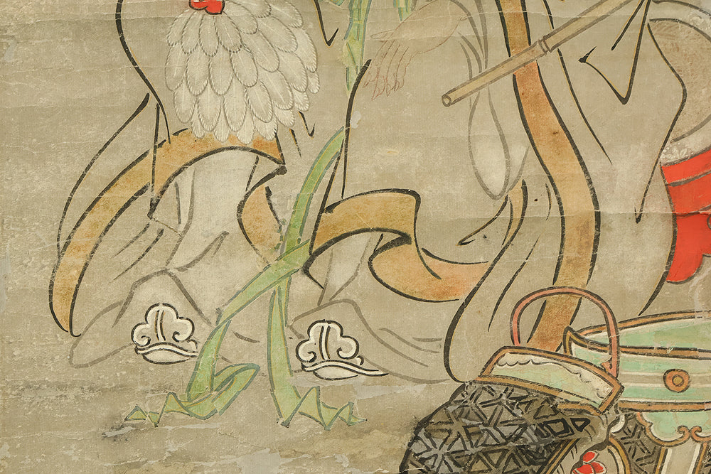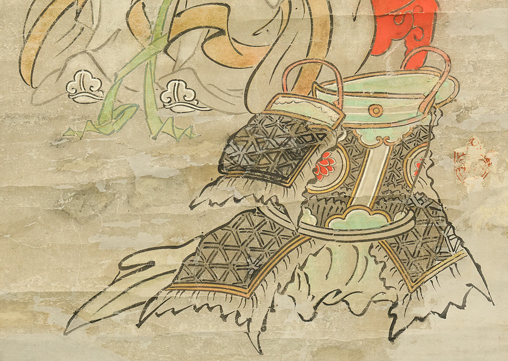 This hanging scroll, attributed to Miyamoto Musashi (1584–1645), features a portrait of Confucius (Kōshi), the revered Chinese philosopher and founder of Confucianism. Rendered in expressive ink and accompanied by classical calligraphy, the figure is depicted with dignified serenity, embodying the ideals of wisdom and moral cultivation. Musashi, famed as a swordsman, strategist, and founder of the Niten Ichiryu school of two-sword technique, was also a gifted painter and calligrapher in his later years. This work bears the seal “Niten” (二天), a name Musashi adopted in his final period, reflecting his philosophical evolution and artistic maturity. The scroll is housed in a box and represents the rare intersection of martial and scholarly traditions in early Edo-period Japan.