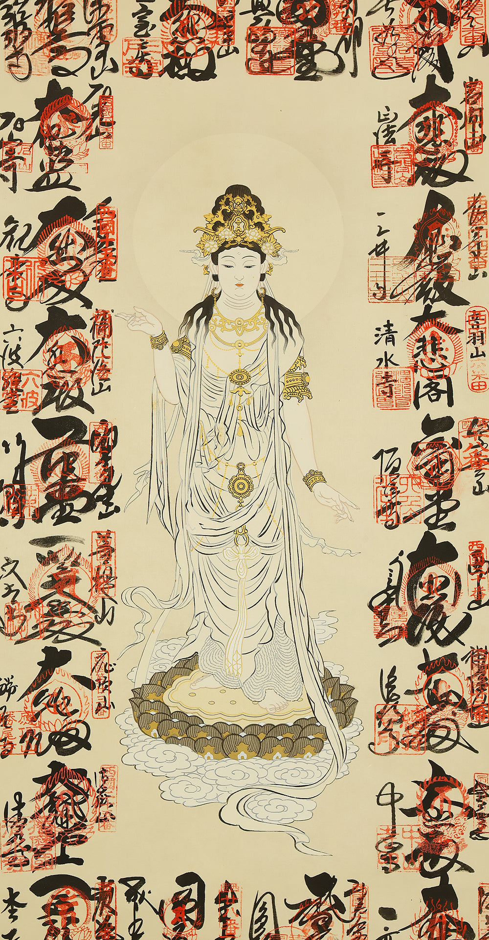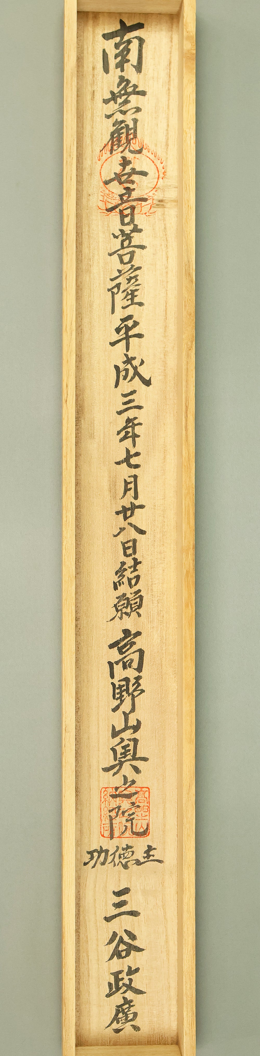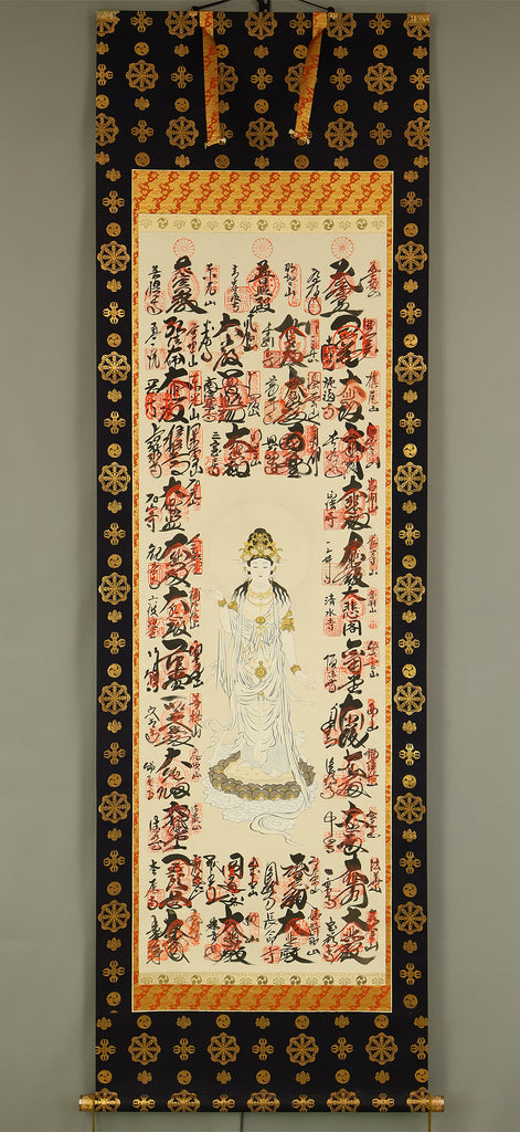 This traditional hanging scroll features Unjō Shōkannon (雲上聖観音)—Avalokitesvara Bodhisattva standing upon a cloud, a serene and compassionate figure central to Japanese Buddhist devotion. Depicted in graceful posture atop a lotus pedestal and drifting cloud, this form of Kannon Bosatsu symbolizes divine presence descending to aid sentient beings, embodying the vow to respond instantly to cries for help. The imagery evokes both spiritual elevation and immediacy of salvation. The scroll is associated with the Saigoku Sanjūsanjo (西国三十三所) pilgrimage, a revered circuit of thirty-three temples across the Kansai region dedicated to Kannon. Pilgrims traditionally collect temple seals (goshuin) around a central image like this, forming a visual record of their spiritual journey. This piece likely served as both devotional icon and commemorative artifact. The scroll is housed in its original box, dated July 1991 (平成三年 七月), affirming its role in late 20th-century Buddhist practice. With its refined brushwork, balanced composition, and sacred symbolism, the work embodies the enduring reverence for Kannon and the transformative spirit of pilgrimage.