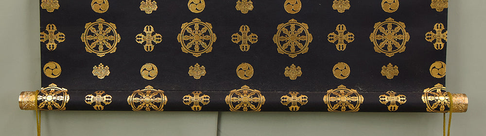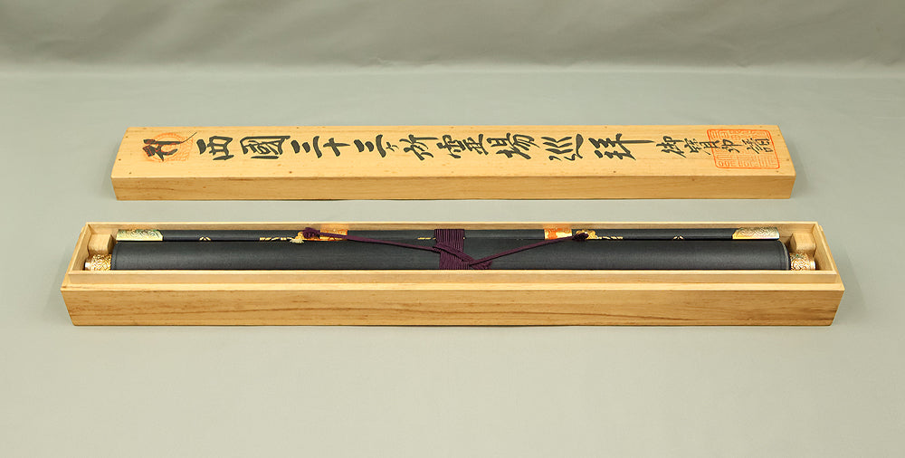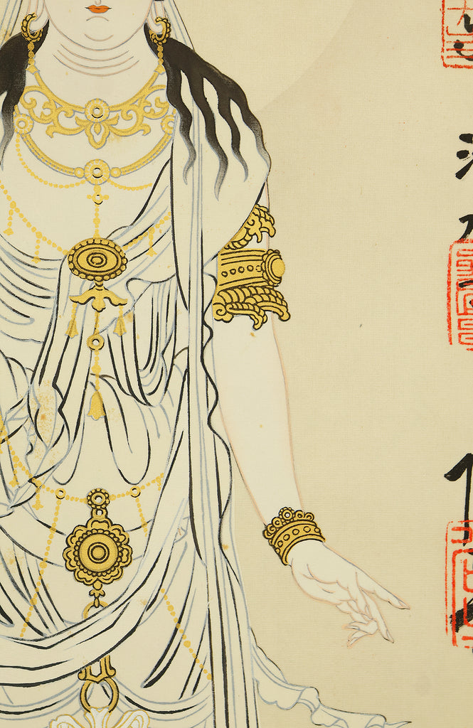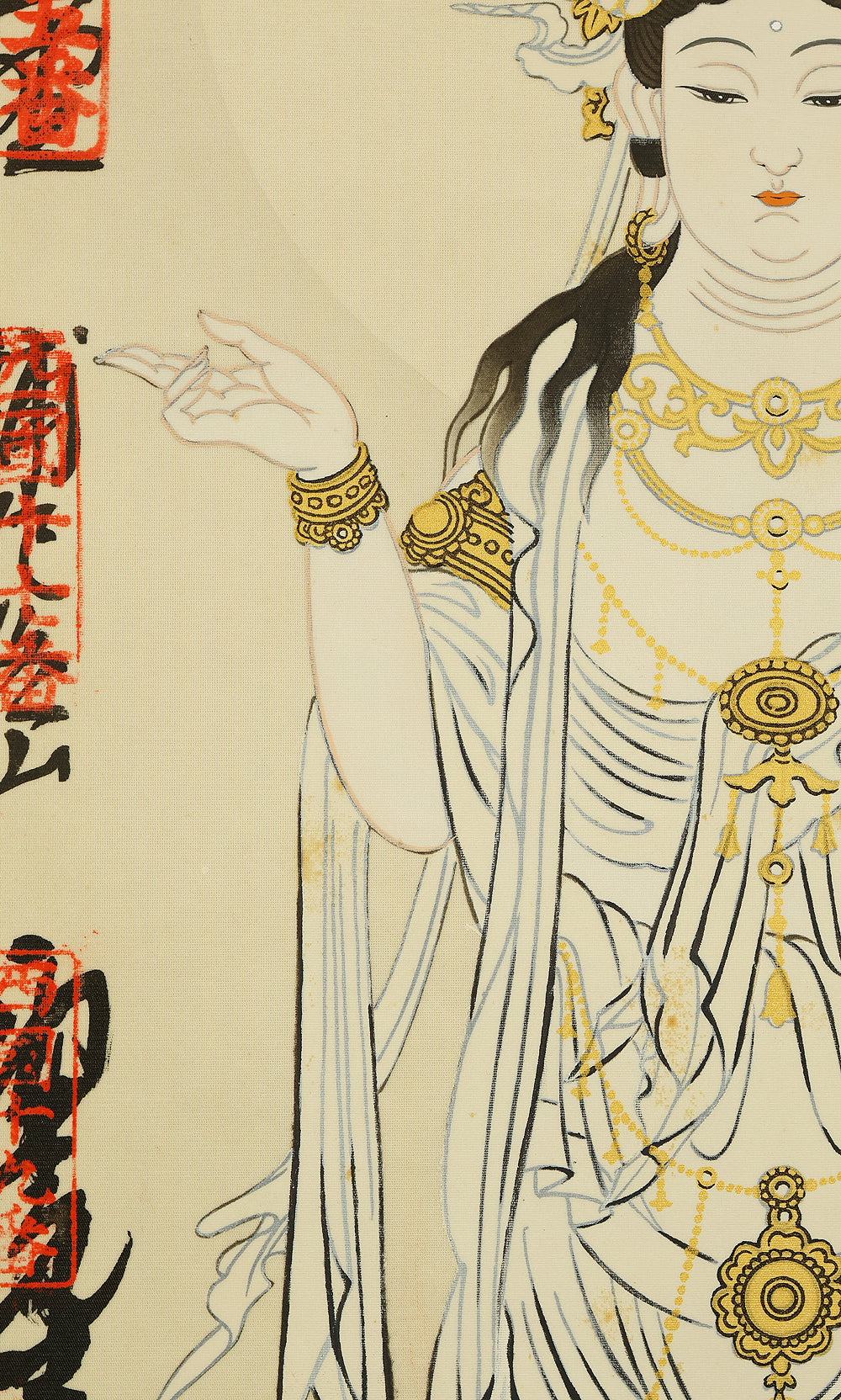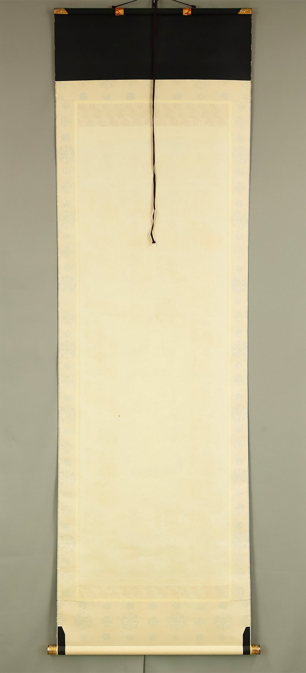 This traditional hanging scroll features Unjō Shōkannon (雲上聖観音)—Avalokitesvara Bodhisattva standing upon a cloud, a serene and compassionate figure central to Japanese Buddhist devotion. Depicted in graceful posture atop a lotus pedestal and drifting cloud, this form of Kannon Bosatsu symbolizes divine presence descending to aid sentient beings, embodying the vow to respond instantly to cries for help. The imagery evokes both spiritual elevation and immediacy of salvation. The scroll is associated with the Saigoku Sanjūsanjo (西国三十三所) pilgrimage, a revered circuit of thirty-three temples across the Kansai region dedicated to Kannon. Pilgrims traditionally collect temple seals (goshuin) around a central image like this, forming a visual record of their spiritual journey. This piece likely served as both devotional icon and commemorative artifact. The scroll is housed in its original box, dated July 1991 (平成三年 七月), affirming its role in late 20th-century Buddhist practice. With its refined brushwork, balanced composition, and sacred symbolism, the work embodies the enduring reverence for Kannon and the transformative spirit of pilgrimage.