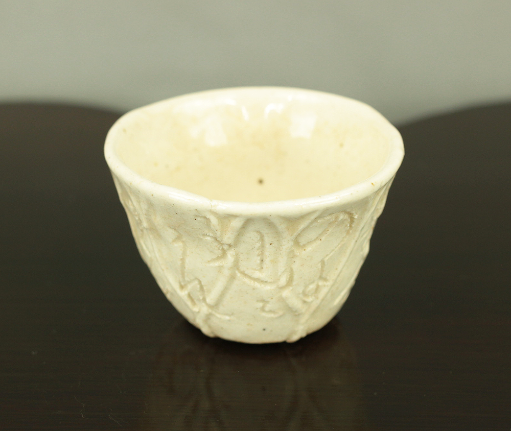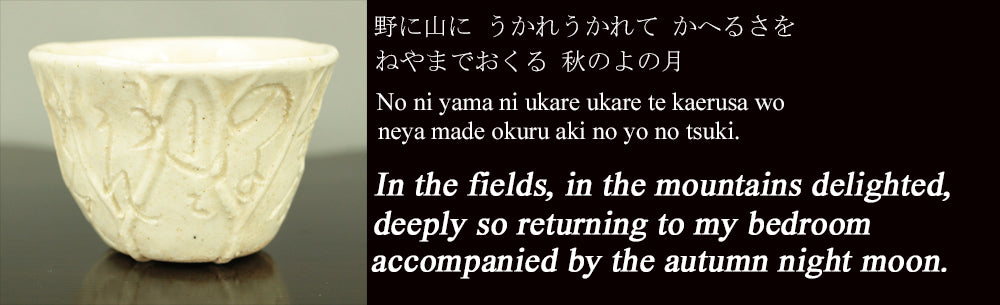 Shaped with the quiet intimacy characteristic of Otagaki Rengetsu (1791–1875), this small sake cup carries one of her gently reflective waka poems, carved directly into the clay with the unmistakable spontaneity of her nail‑incised script. The verse speaks of wandering through fields and mountains, returning home still accompanied by the autumn moon—a sentiment that resonates with Rengetsu’s life of movement, solitude, and poetic clarity. The cup’s soft glaze and subtly textured surface enhance the warmth of her handwork, giving the piece a presence that feels both humble and deeply personal. A fine example of Rengetsu‑yaki, where pottery and poetry merge into a single expression of her contemplative spirit.
