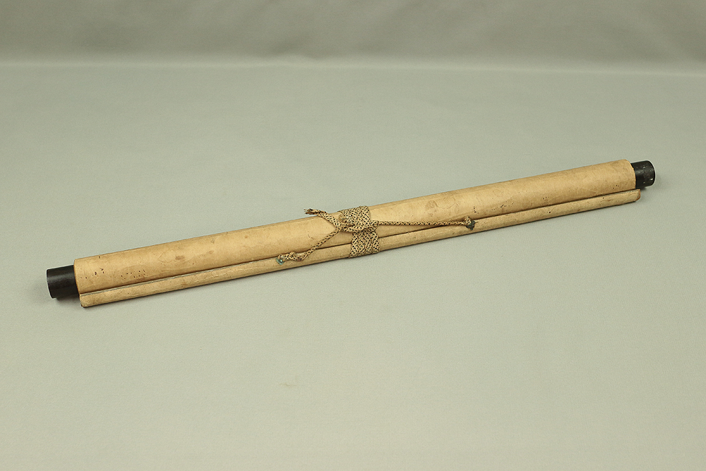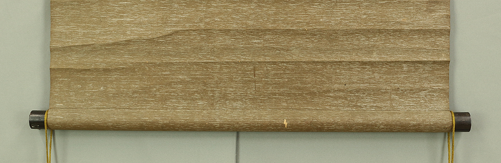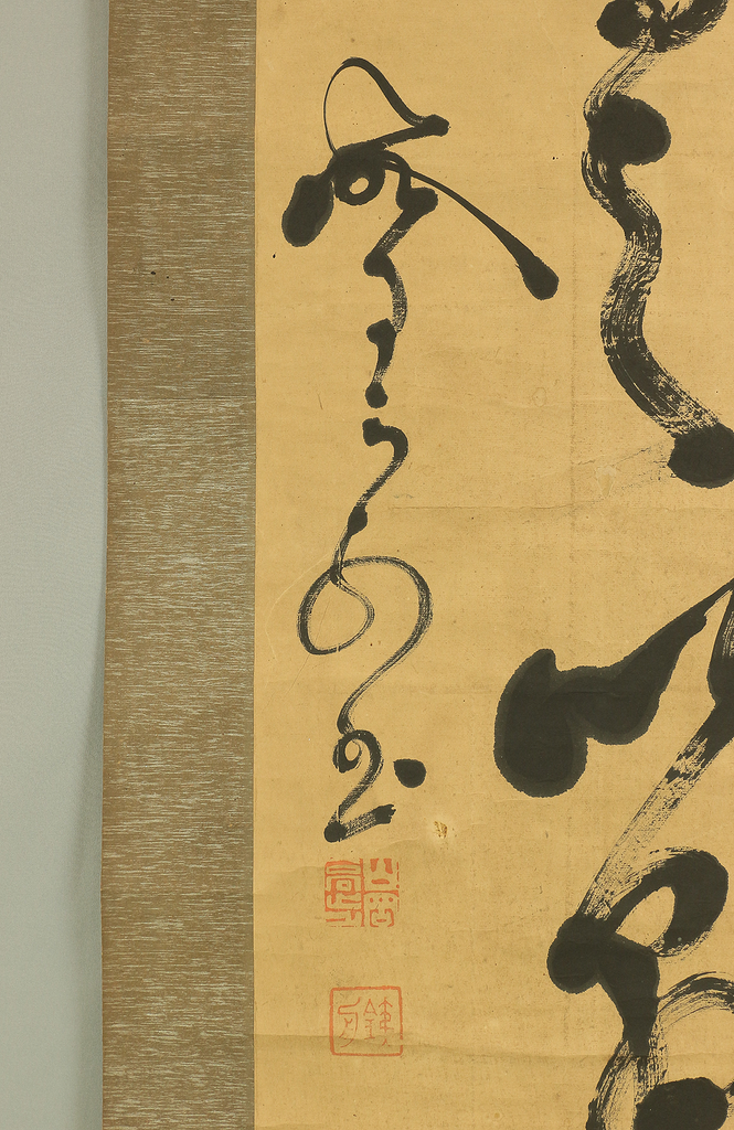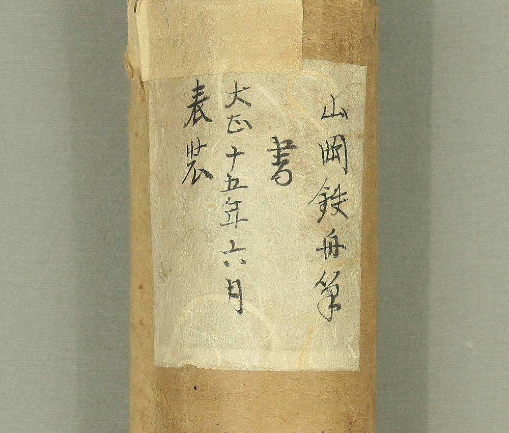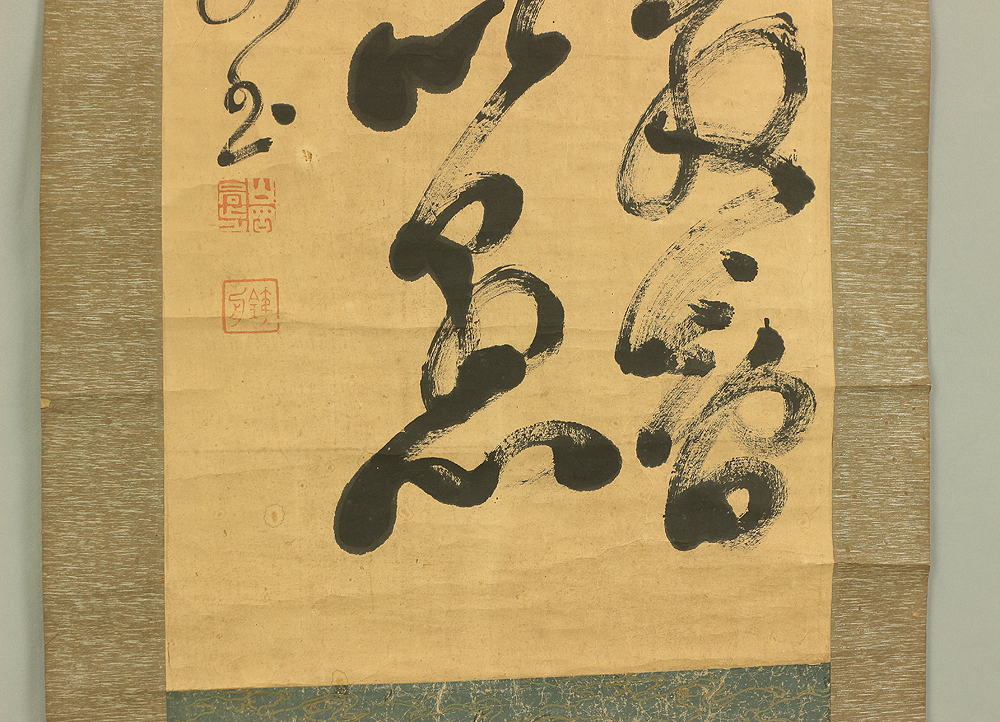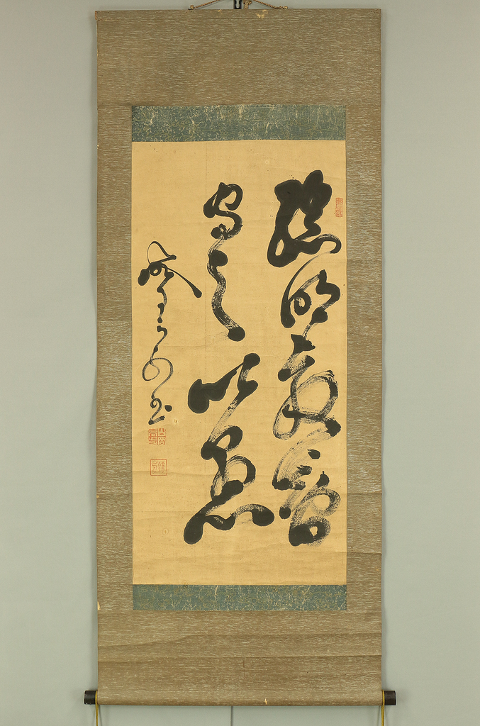 What gives this calligraphic hanging scroll its quiet authority is not only the strength of the brush but the depth of thought embedded in it, presenting the phrase “Sōmei Eichi, Mamoru ni Oite Gu o Motte Su” by Yamaoka Tesshū (1836–1888), a pivotal samurai-intellectual whose life unified Zen practice, swordsmanship, and calligraphy. The text conveys the idea that true intelligence and insight are preserved through humility and an outwardly unassuming attitude, a concept closely aligned with Tesshū’s own disciplined worldview. Powerful, confident strokes are balanced by areas of restraint, creating a composed rhythm that reflects inner stillness rather than ornamentation. A small paper label affixed to the reverse of the scroll records that the mounting was carried out in June of Taishō 15 (1926), providing a concrete historical reference to its presentation at that time.