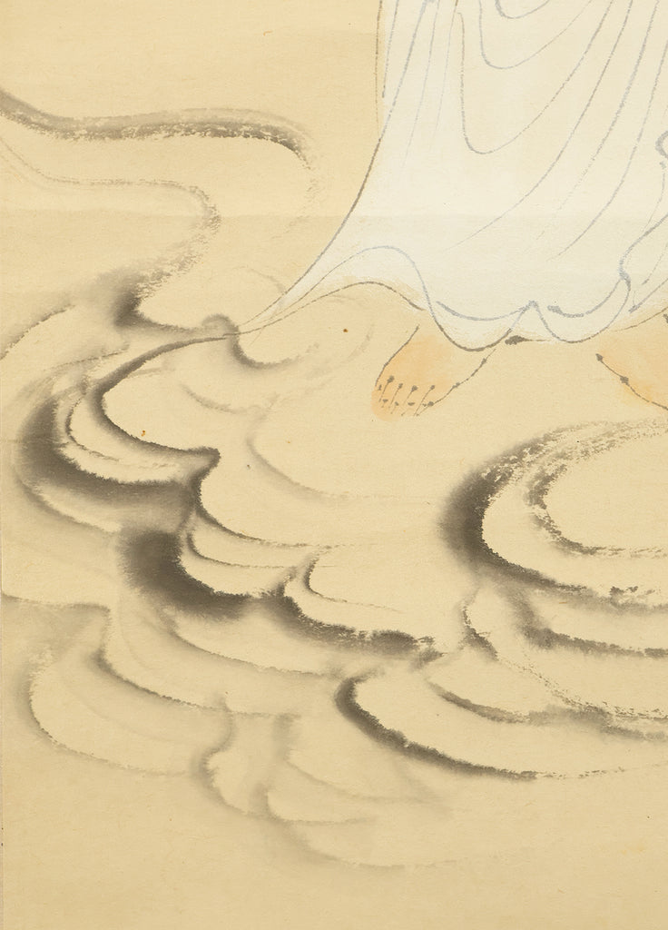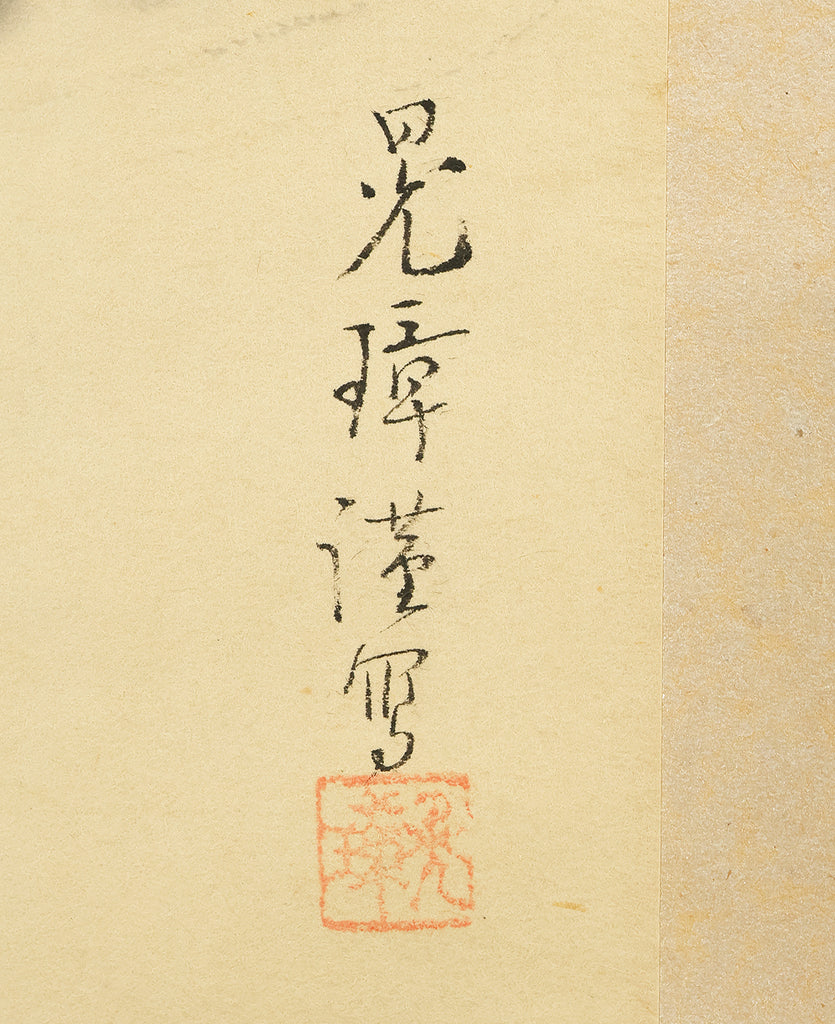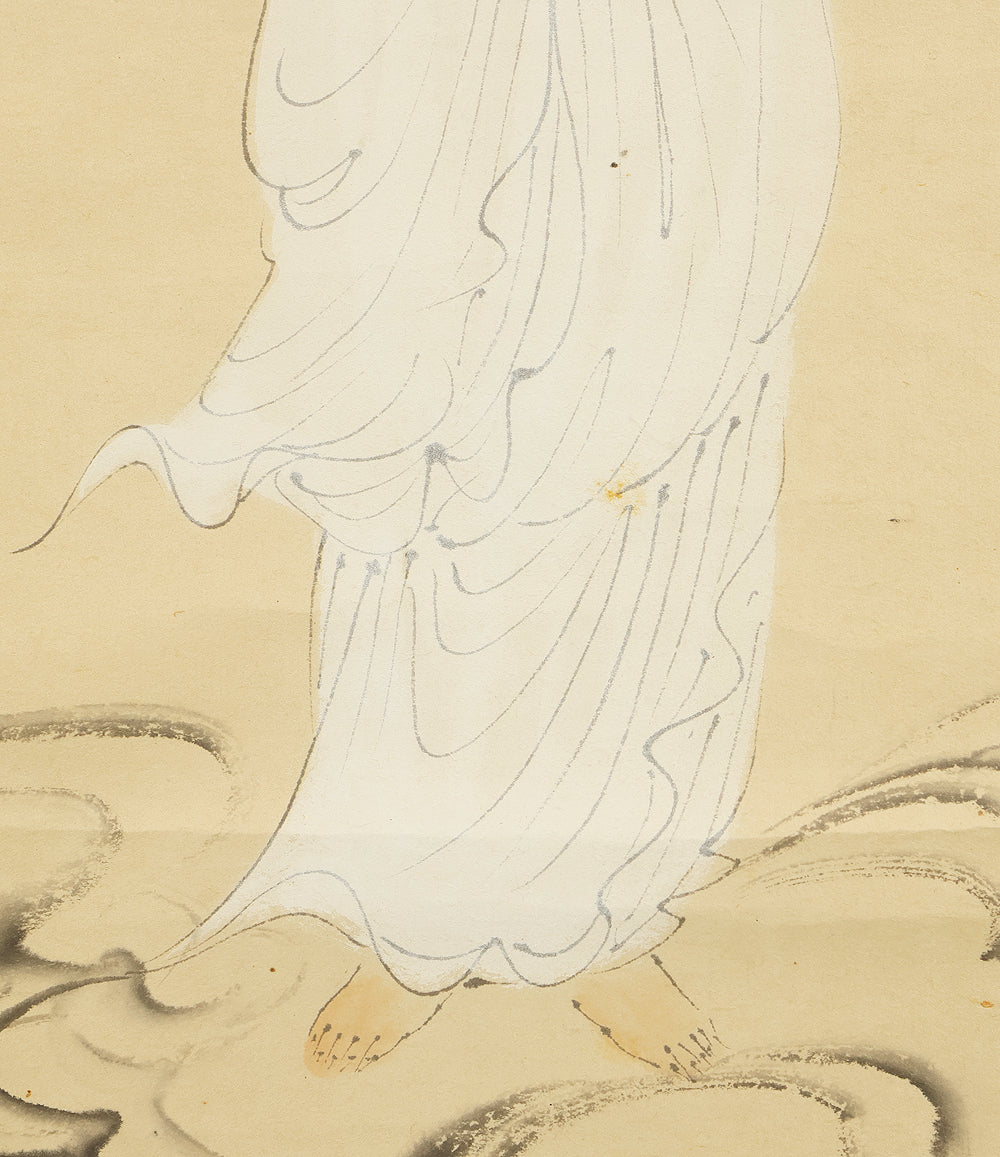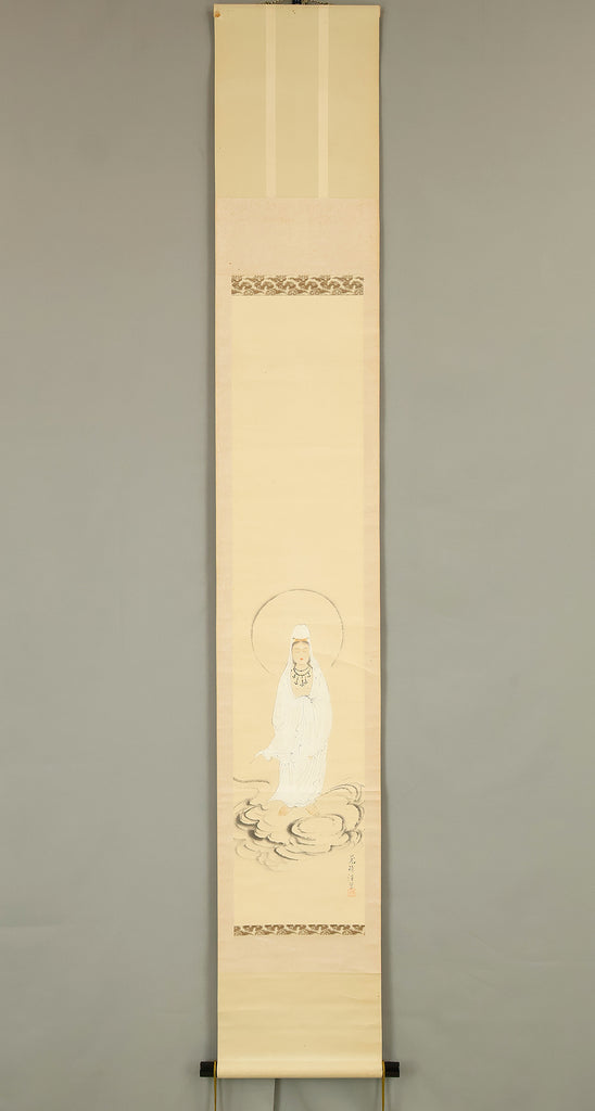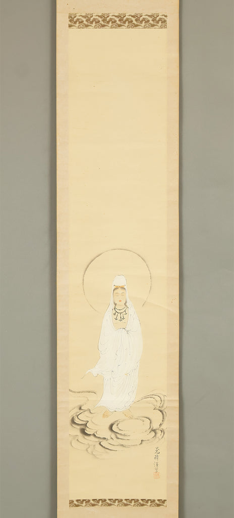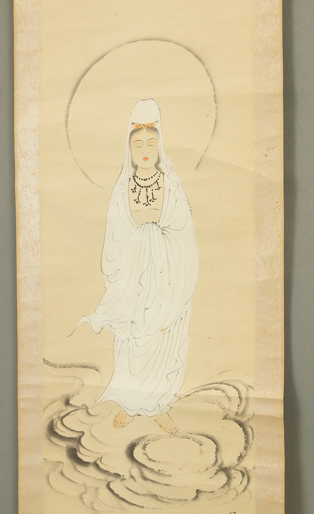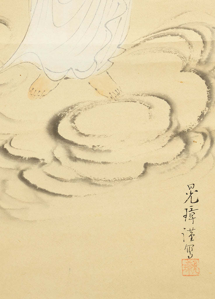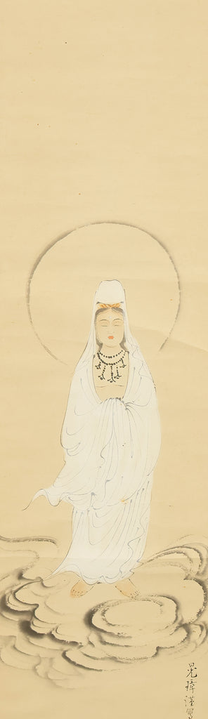 Rendered with quiet luminosity, this hanging scroll by Kosho presents a serene image of Kannon Bosatsu dressed in flowing white robes, standing lightly upon stylized clouds with a gentle radiance encircling the figure. The restrained palette and delicate brushwork emphasize purity and compassion, while the soft transitions of ink and color give the composition an ethereal stillness. Kosho’s handling of line—subtle in the robes, firmer in the facial features—creates a balance between grace and presence, allowing the bodhisattva to appear both approachable and transcendent. The inscription and seal “Kosho” affirm the work’s authorship and devotional intent. Within a collection or interior, the scroll introduces a calm, contemplative atmosphere—its refined depiction of Kannon adding spiritual depth and a quietly luminous focal point to the surrounding space.