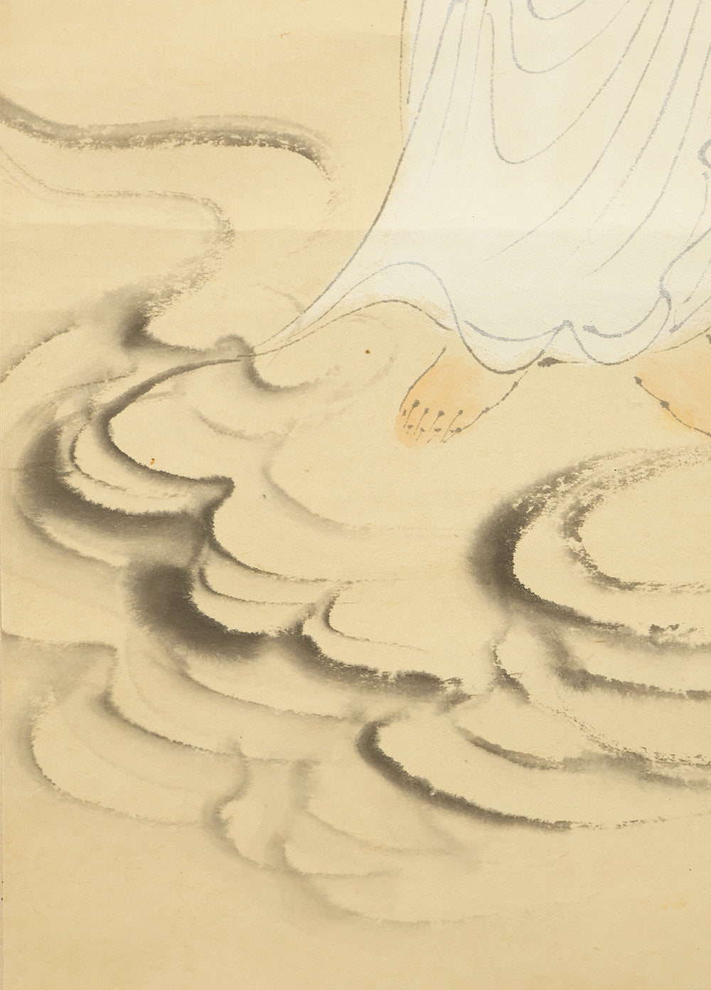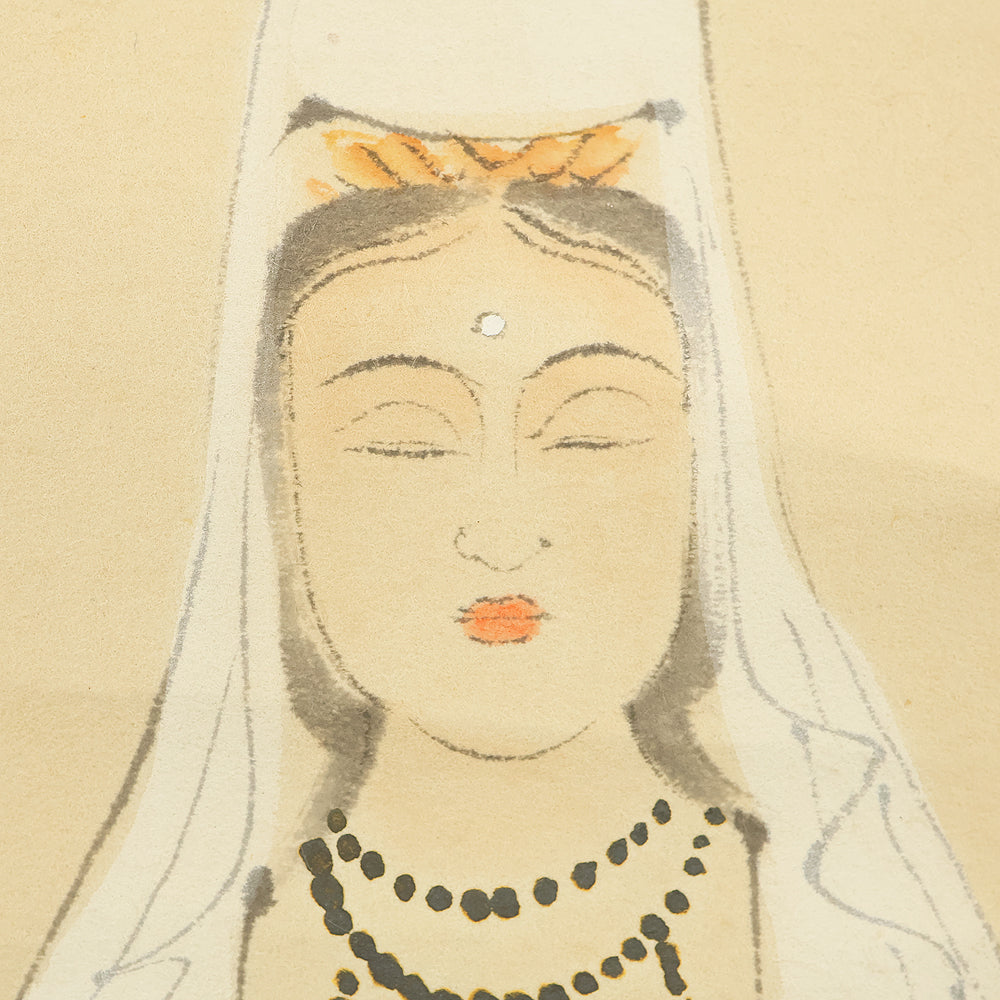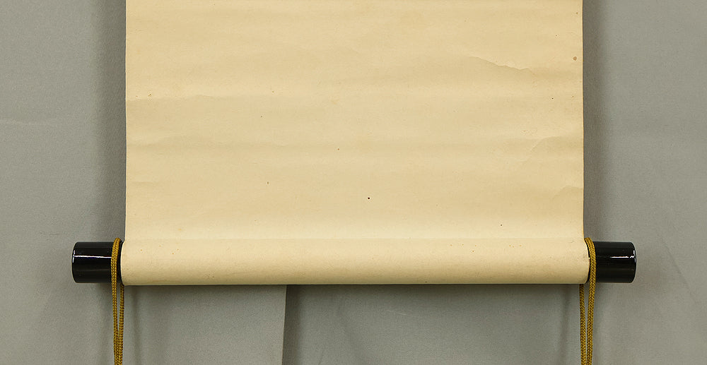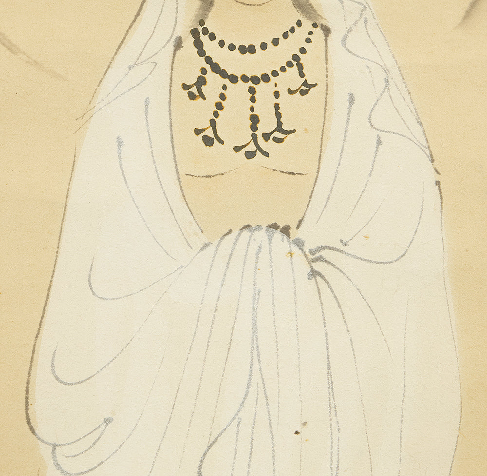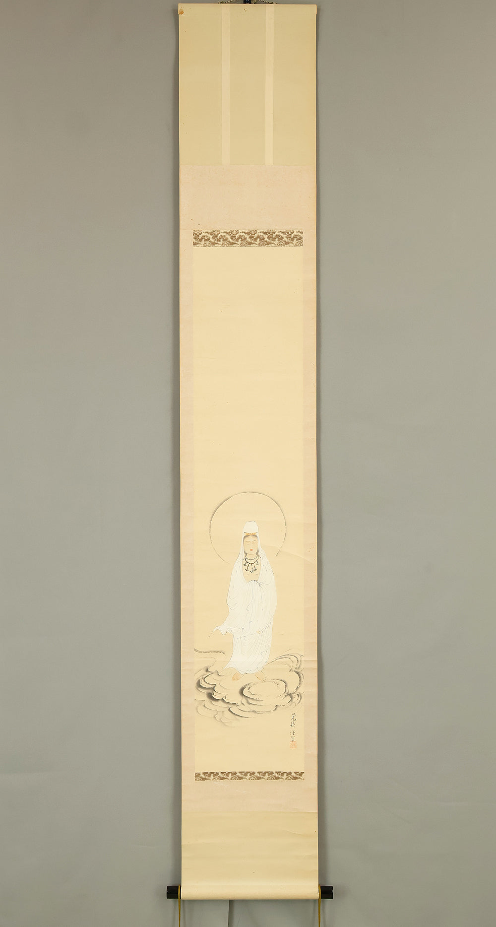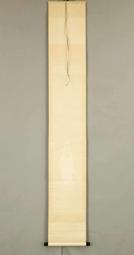 Rendered with quiet luminosity, this hanging scroll by Kosho presents a serene image of Kannon Bosatsu dressed in flowing white robes, standing lightly upon stylized clouds with a gentle radiance encircling the figure. The restrained palette and delicate brushwork emphasize purity and compassion, while the soft transitions of ink and color give the composition an ethereal stillness. Kosho’s handling of line—subtle in the robes, firmer in the facial features—creates a balance between grace and presence, allowing the bodhisattva to appear both approachable and transcendent. The inscription and seal “Kosho” affirm the work’s authorship and devotional intent. Within a collection or interior, the scroll introduces a calm, contemplative atmosphere—its refined depiction of Kannon adding spiritual depth and a quietly luminous focal point to the surrounding space.