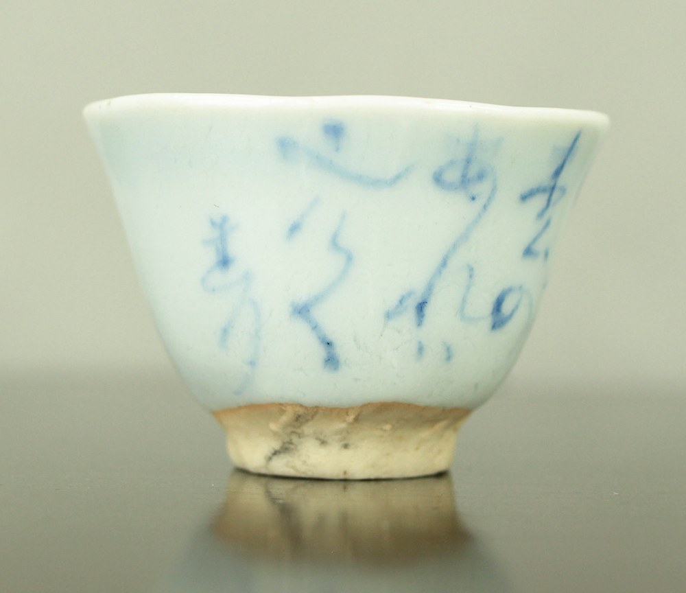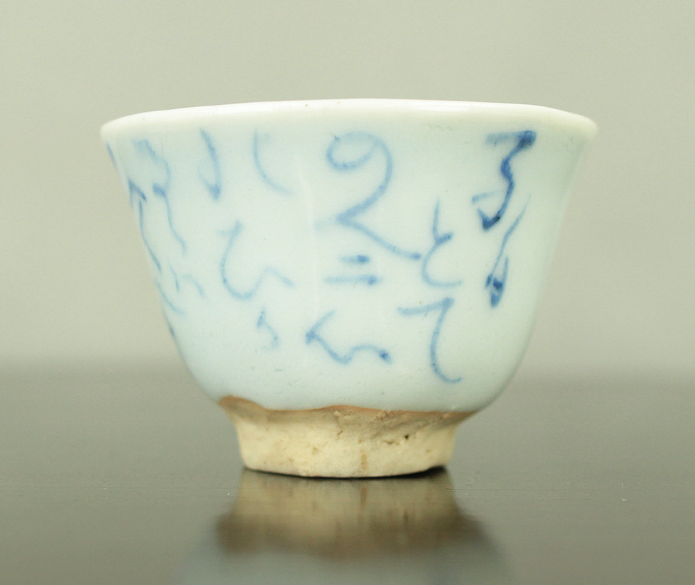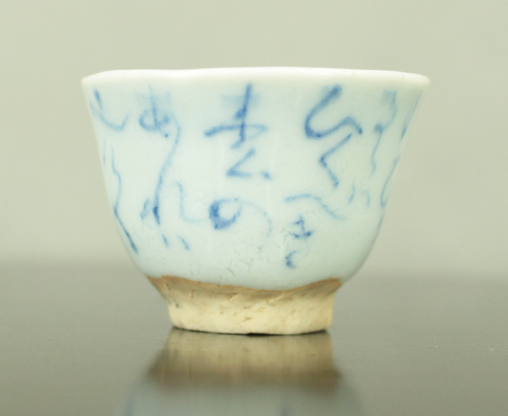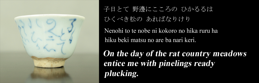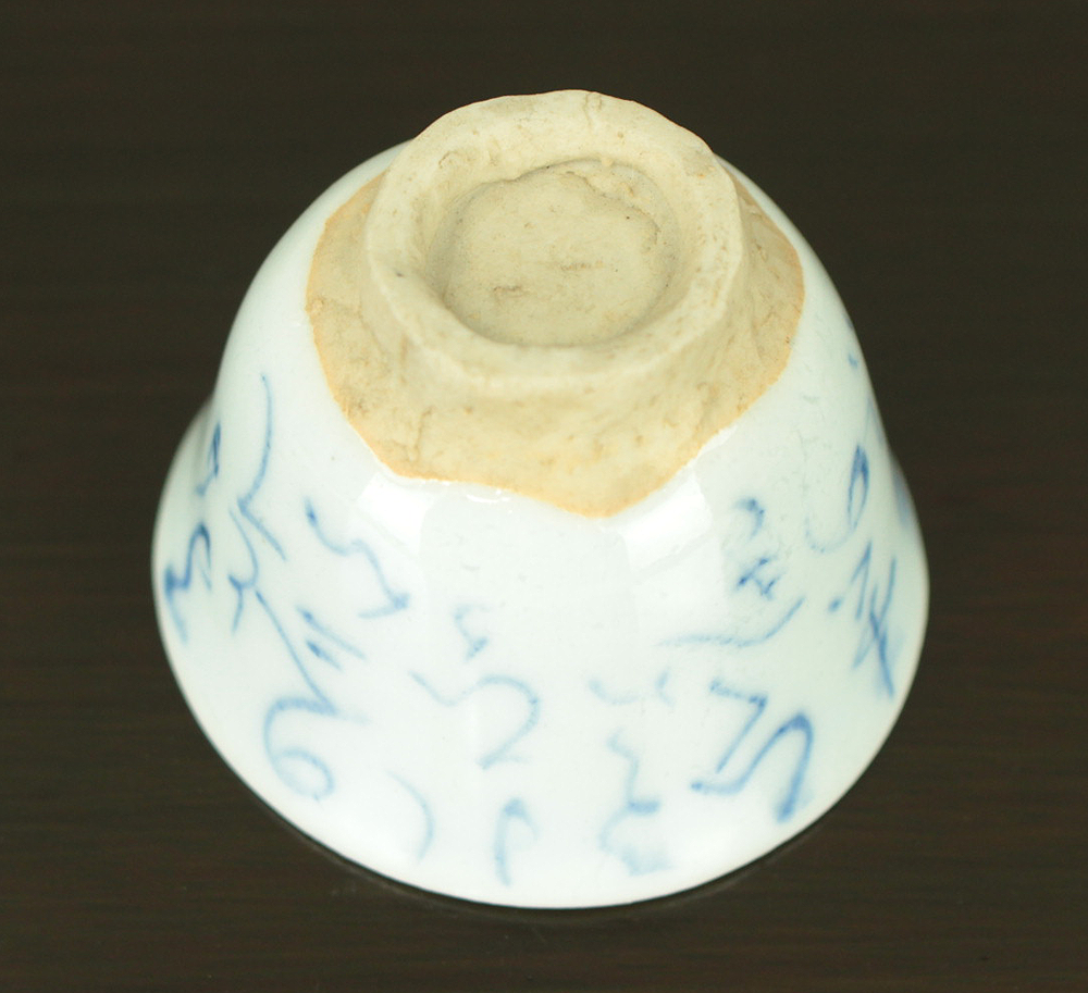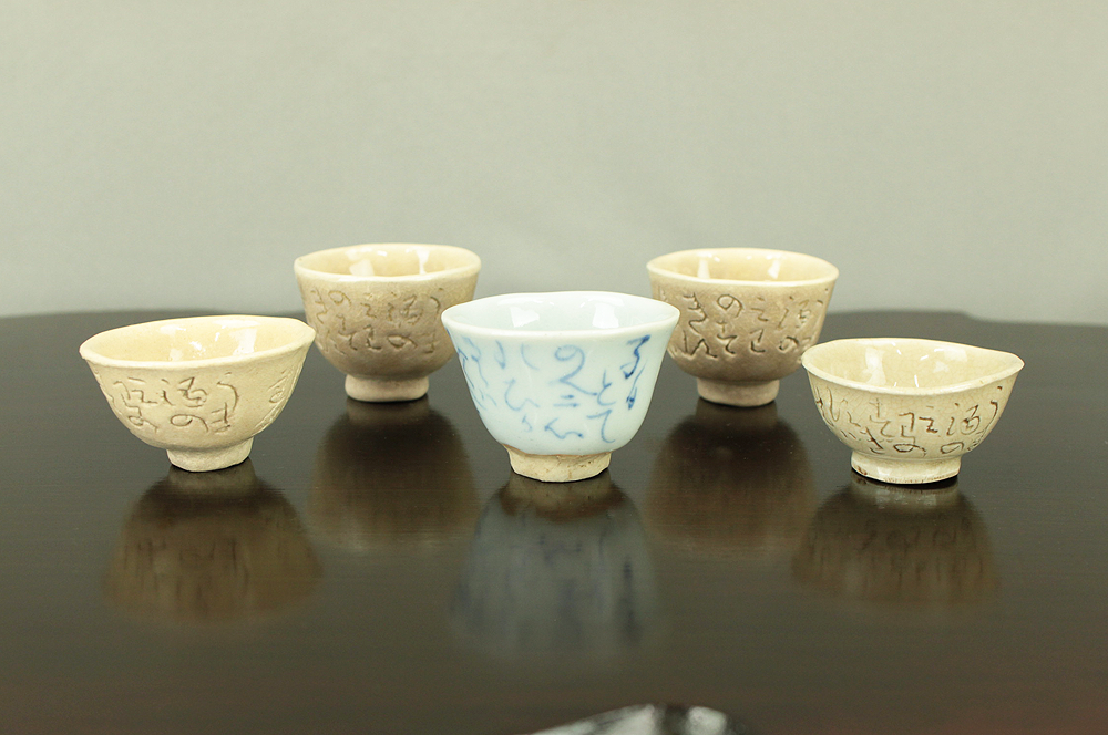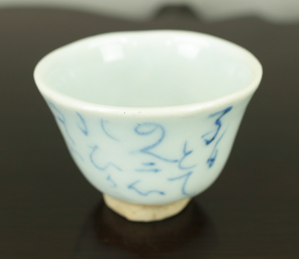 One cup in the set is decorated with blue cursive script, delicately brushed with a fine detail brush (mensōfude), bearing the poem: