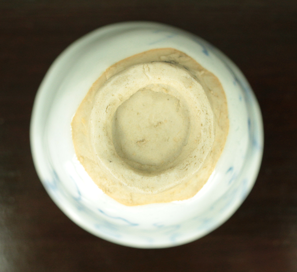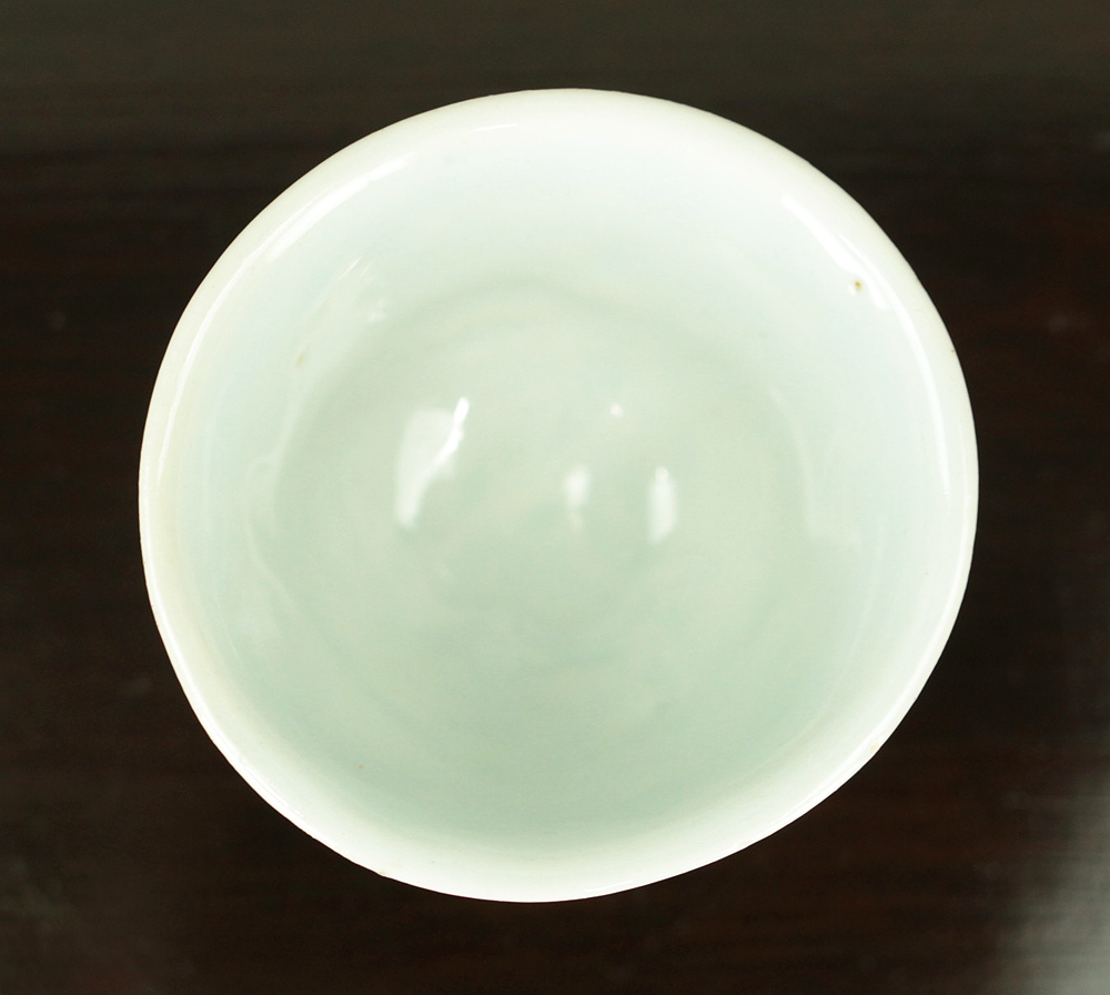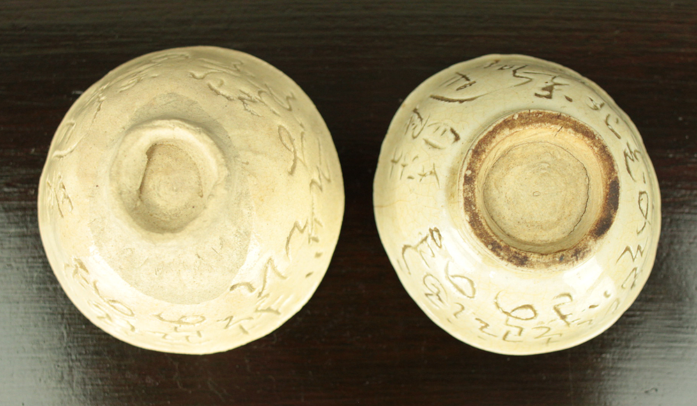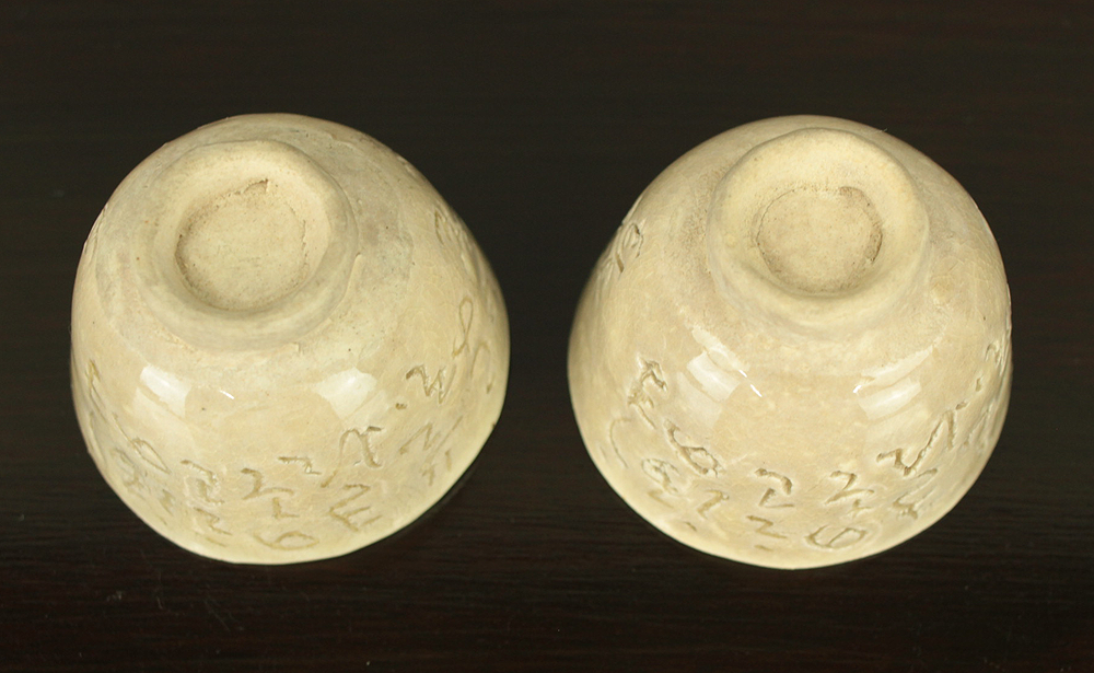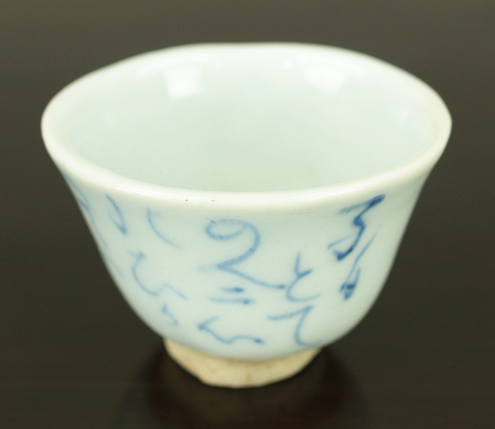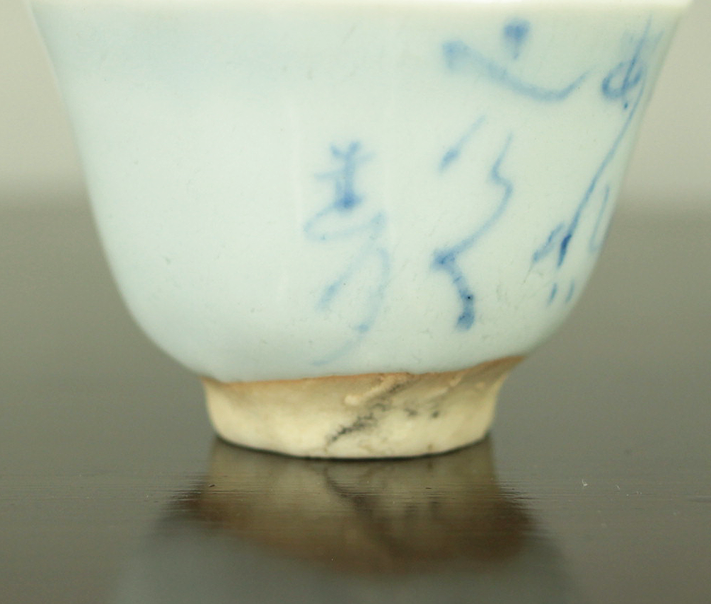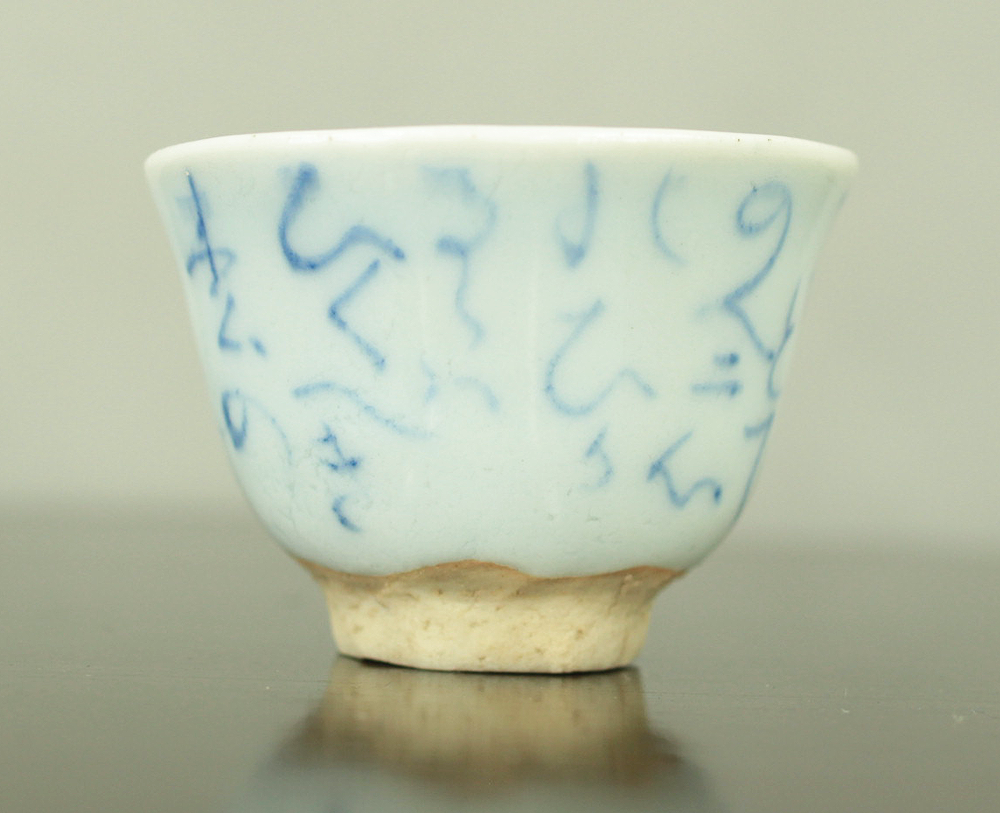 One cup in the set is decorated with blue cursive script, delicately brushed with a fine detail brush (mensōfude), bearing the poem: