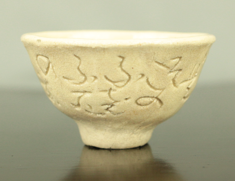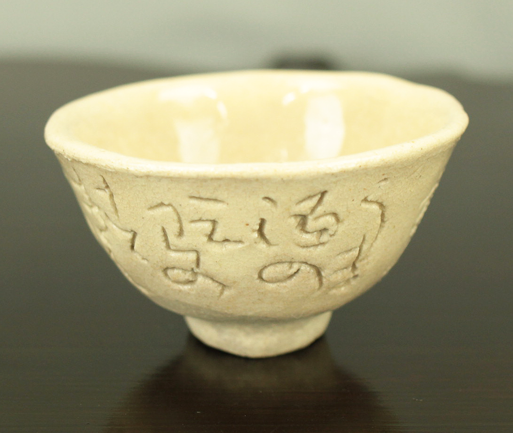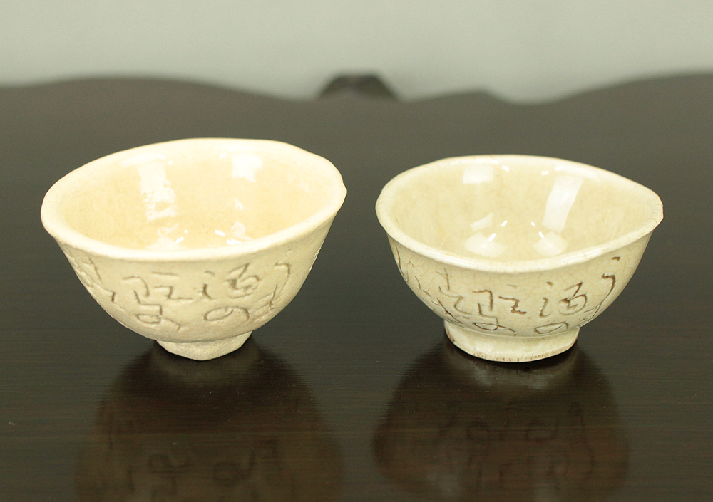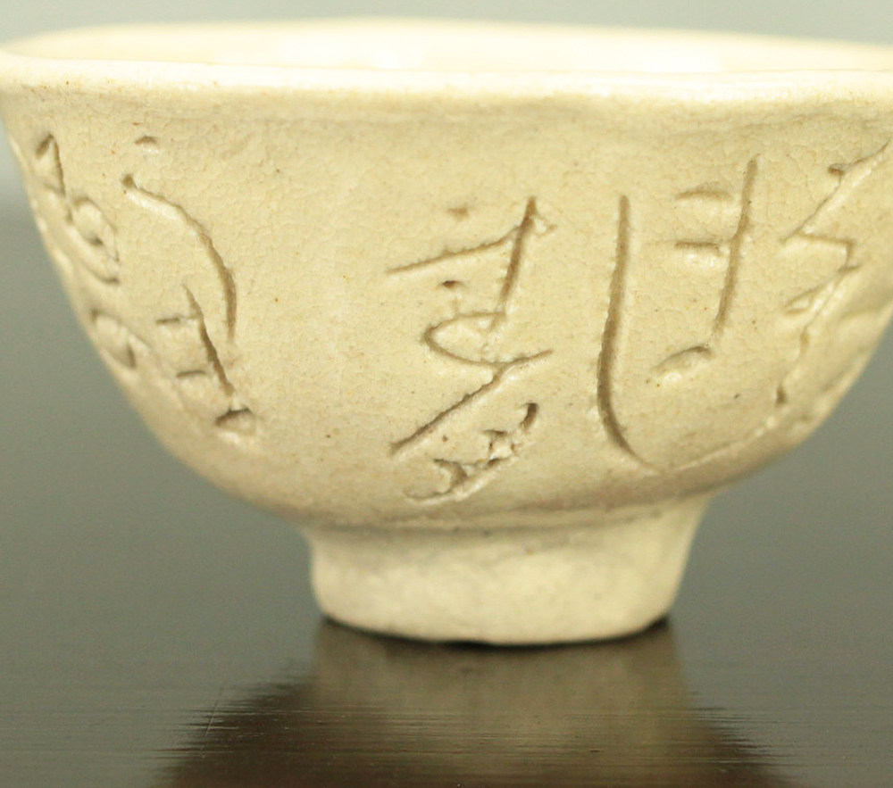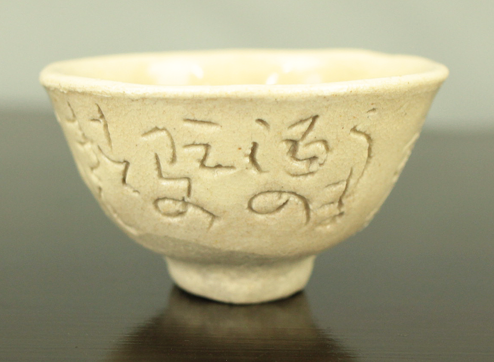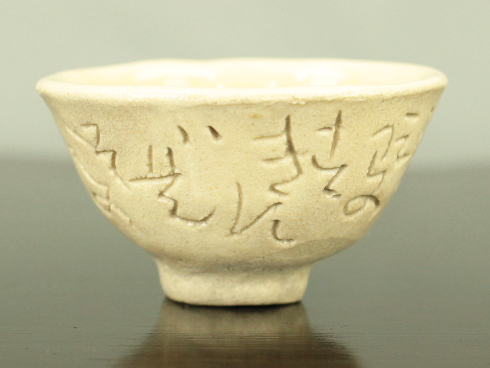 The remaining four cups feature the same poem rendered in nail carving (kugi-bori), a hallmark of Rengetsu’s tactile and meditative style. These bear the verse: