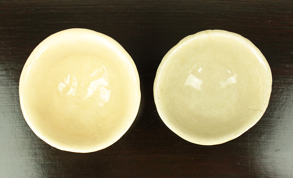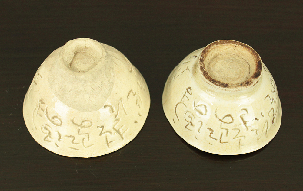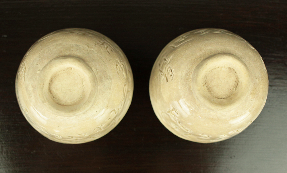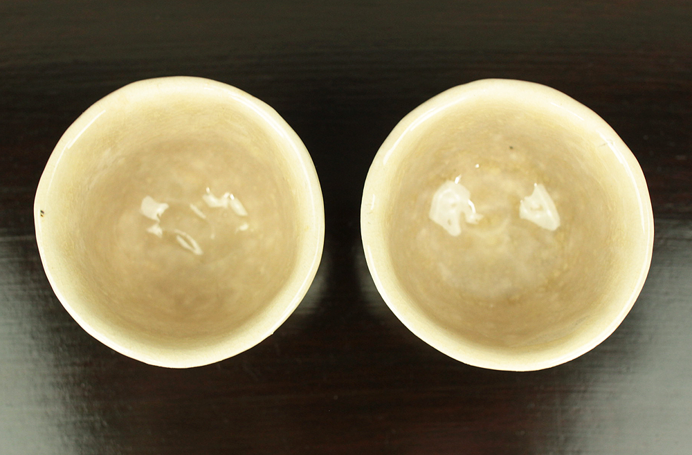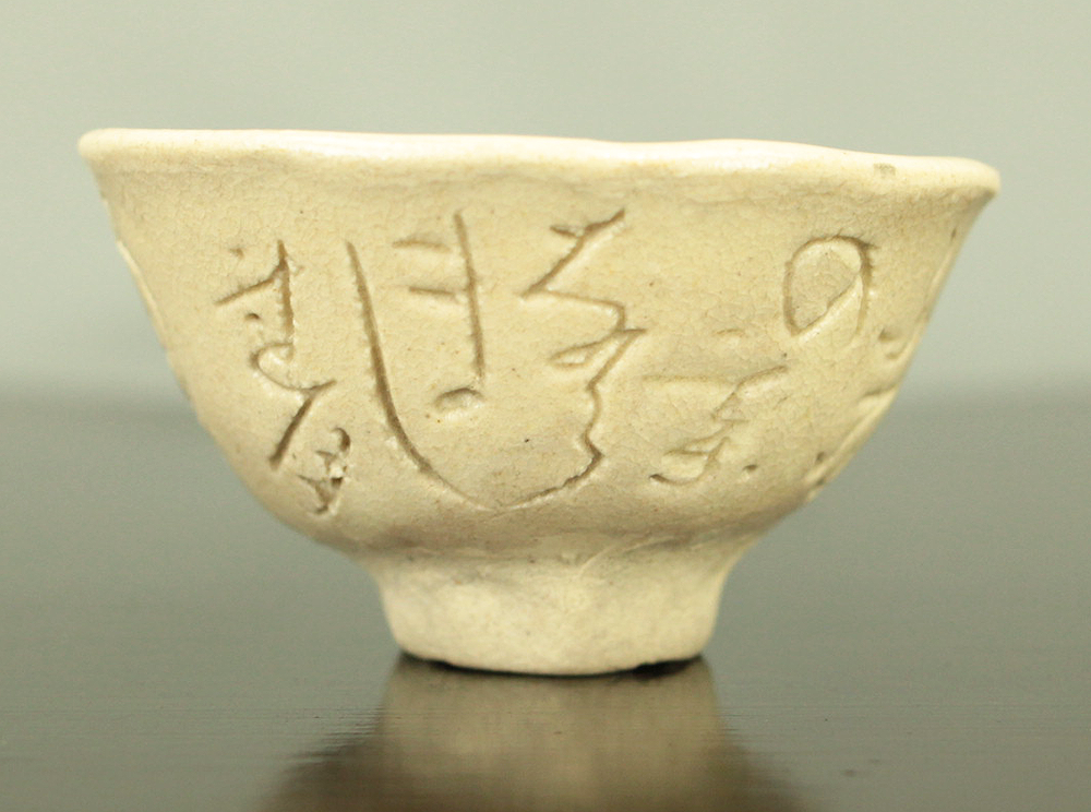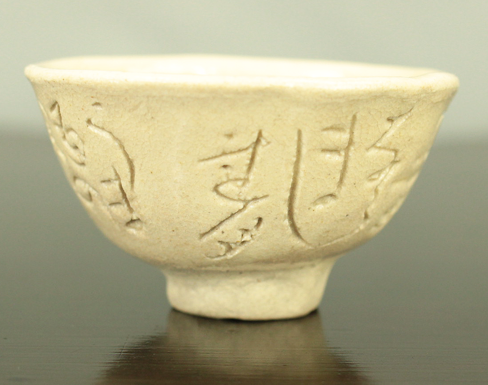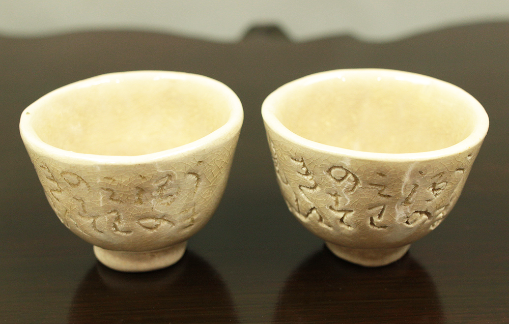 The remaining four cups feature the same poem rendered in nail carving (kugi-bori), a hallmark of Rengetsu’s tactile and meditative style. These bear the verse: