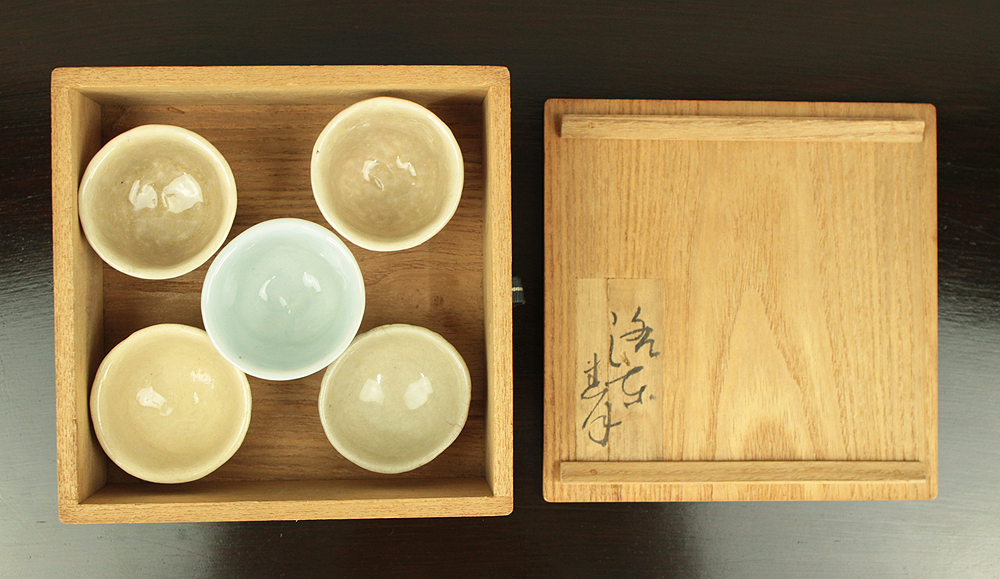 大田垣蓮月 Otagaki Rengetsu (1791-1875) Nail Carving and Blue Letters Waka Poem Set of Five Pieces Sake Cup Guinomi with Box VA783