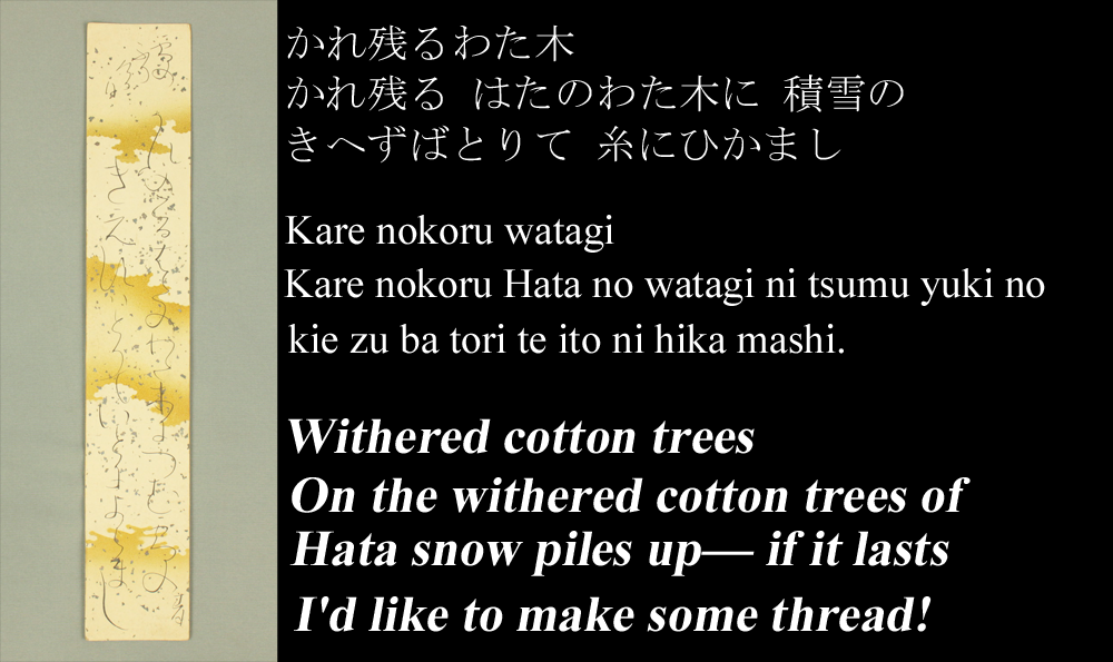 On the withered cotton trees of Hata snow piles up— if it lasts I'd like to make some thread!