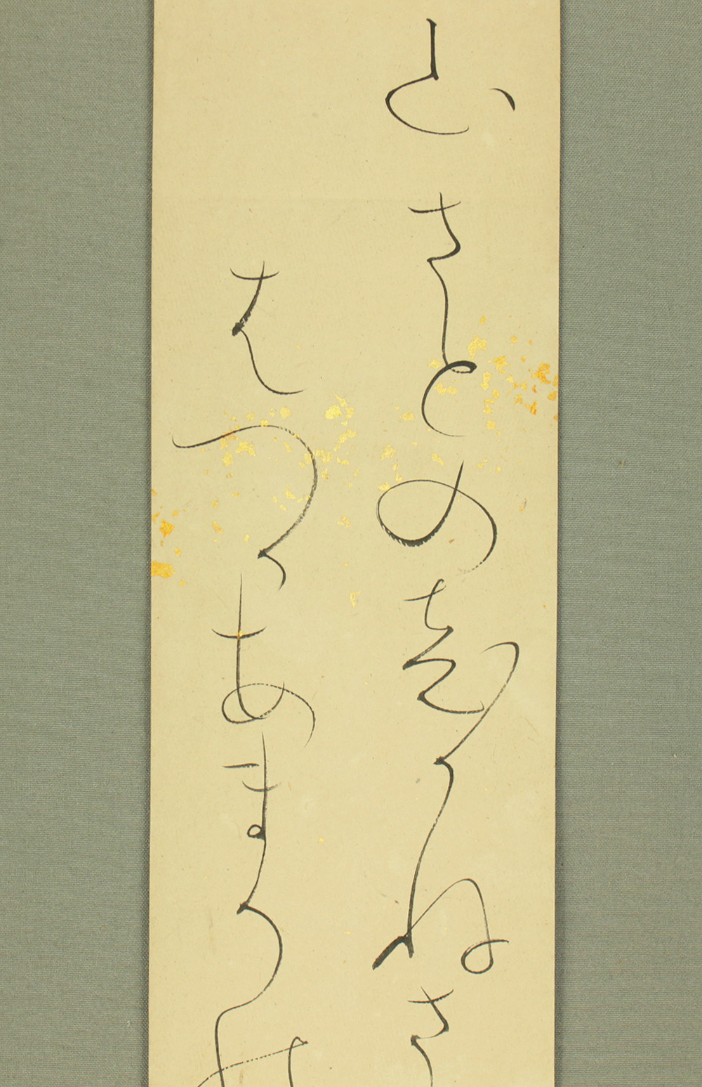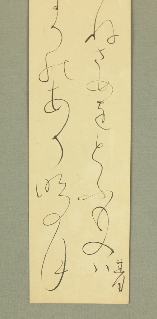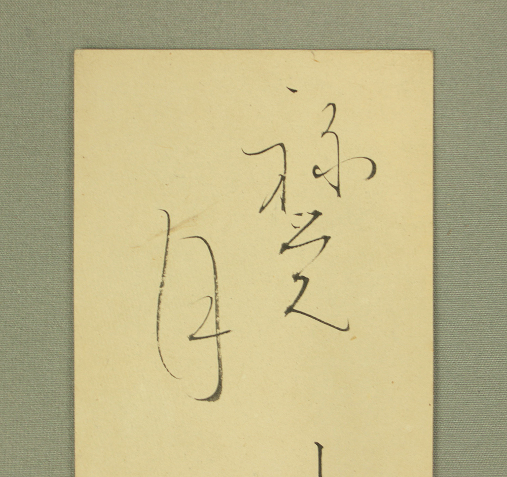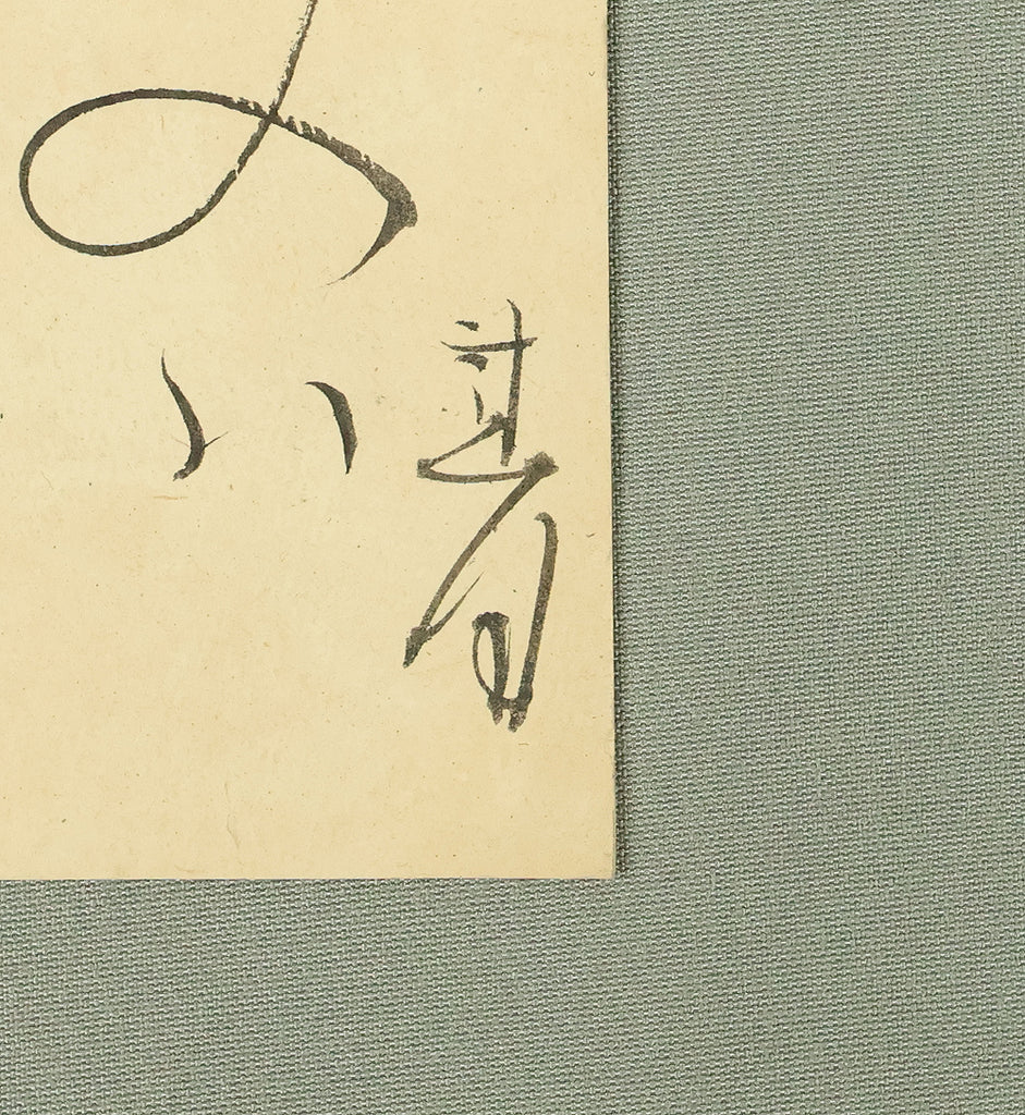 A rare tanzaku poem strip by the renowned nun-poet Otagaki Rengetsu, featuring a waka poem written in her graceful brushwork and signed simply Rengetsu (蓮月). The verse reflects quiet solitude in a mountain village, where the poet imagines a visitor arriving under the faint light of the waning moon. Rengetsu’s calligraphy is expressive and fluid, embodying the poetic spirit of late Edo-period aesthetics. Works bearing her signature are highly sought after for their literary and historical significance. As shown in the photo, the paper has a slight crease, consistent with age and handling. A poignant and elegant artifact for collectors of Japanese poetry and calligraphy.