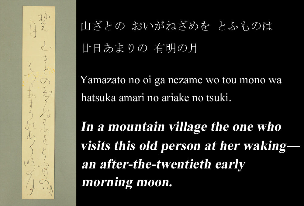 山ざとの おいがねざめを とふものは 廿日あまりの 有明の月