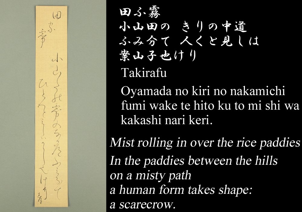 Walking along a path shrouded in mist, through the rice fields of the hills, I thought I saw a person in the distance. But as I approached, it turned out to be merely a scarecrow. In this way, the poem expresses the visual illusions in the mist and the surprise born from mistaken perception.
