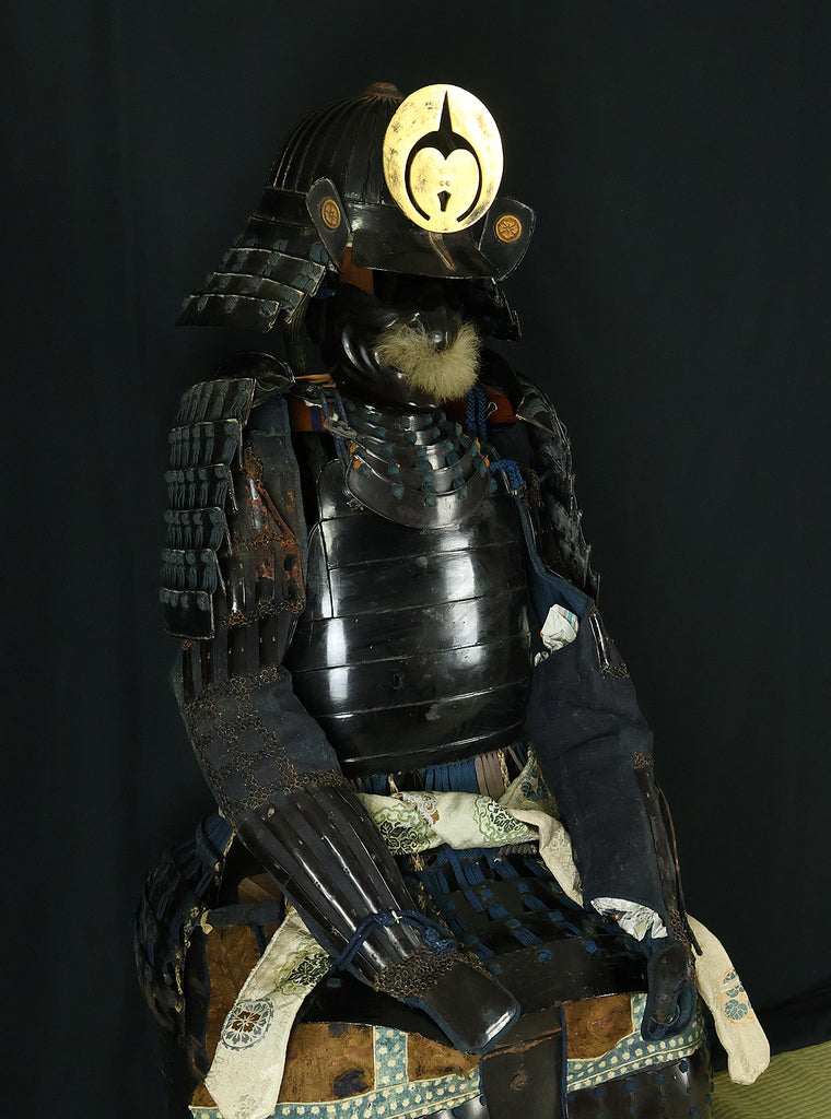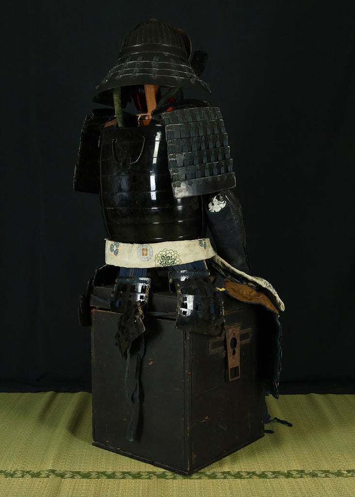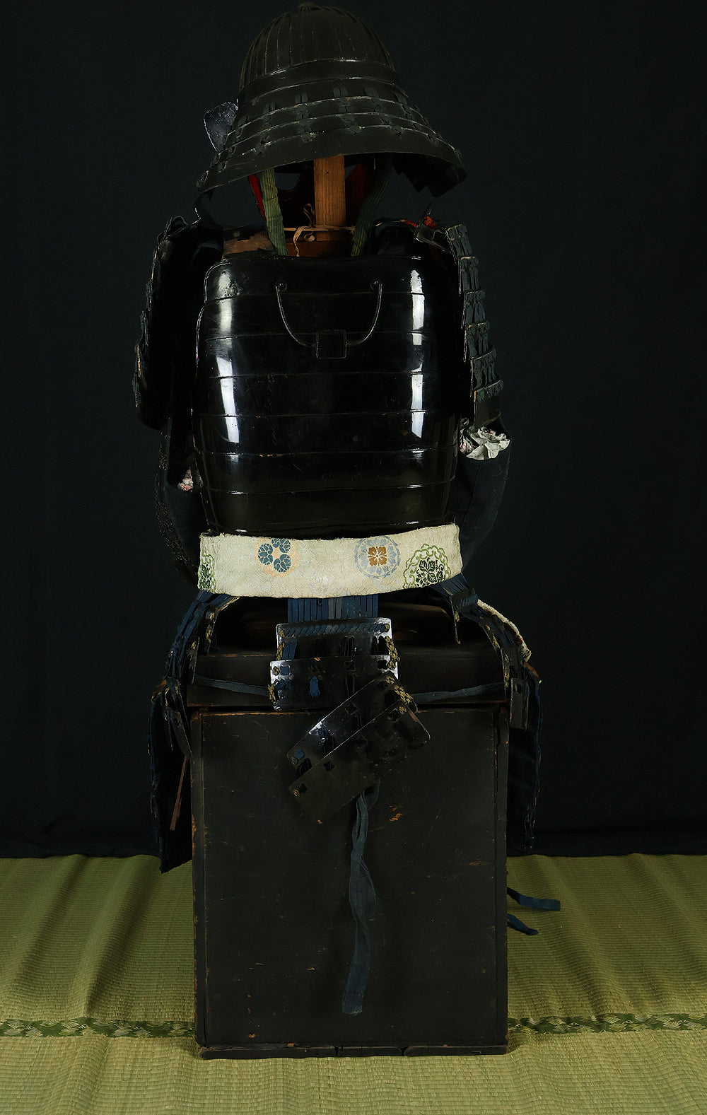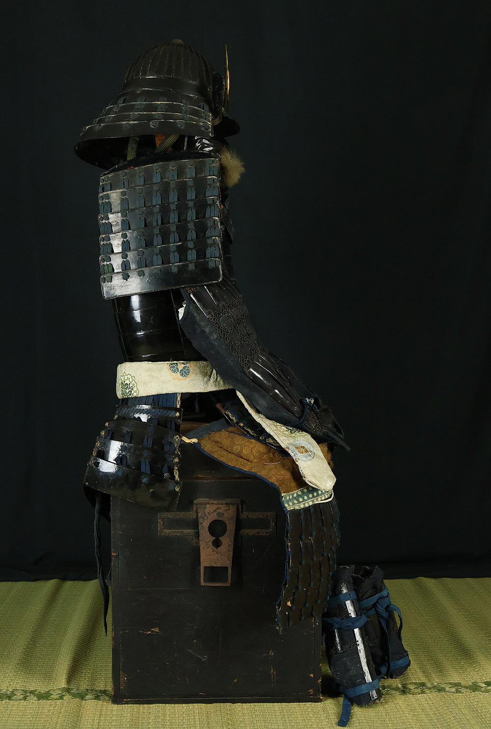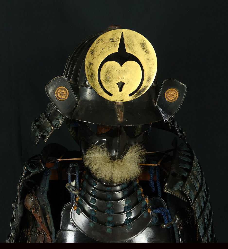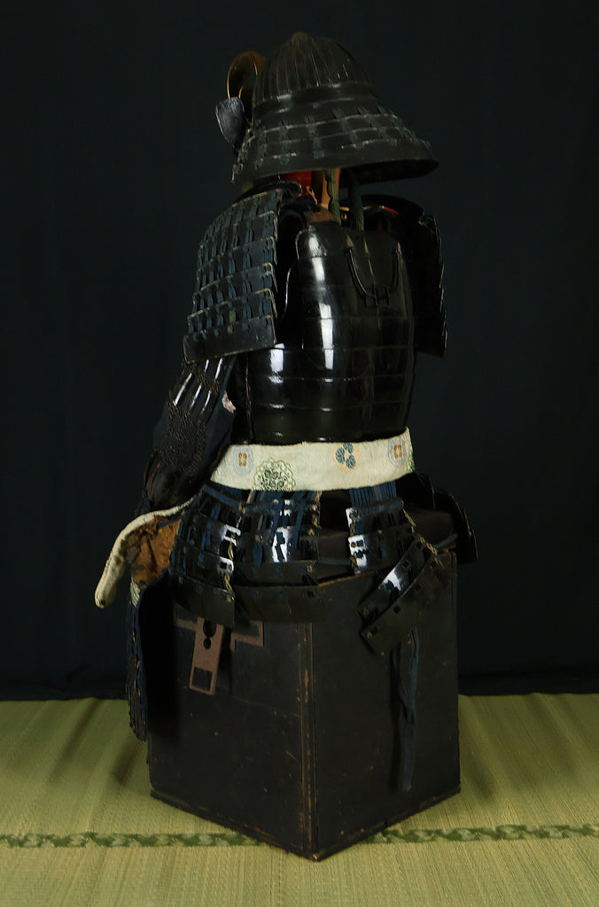 This authentic life-size Samurai armor (Kacchu Yoroi) dates to the Edo period, most likely from the mid to late 18th century, a time when armor was crafted not only for warfare but also as a powerful symbol of samurai status, lineage, and ceremonial dignity. The helmet (kabuto) features a striking large circular gilt lacquer maedate (front crest), an imposing round form enclosing a stylized mon motif reminiscent of an abstracted hollyhock design, set against deep black lacquered iron, creating a bold and authoritative presence. The kabuto is constructed in traditional suji-bachi form with multiple iron plates, finished in black lacquer and fitted with dark blue lacing, while the interior retains its original structure and padding. The menpo (face armor), lacquered in vivid red on the interior and fitted with a naturalistic moustache, reflects refined Edo-period aesthetics, combining martial severity with theatrical expression. The cuirass and kusazuri are composed of black lacquered iron plates laced in dark indigo, forming a complete and harmonious suit that conveys both strength and elegance. Unlike purely decorative later reproductions, this armor preserves the correct structural configuration of a functional gusoku, yet its refined balance and uniform lacing indicate production during the peaceful Edo era, when craftsmanship reached a highly sophisticated level. The presence of the original armor stand and traditional storage box further enhances its historical integrity, as complete life-size sets with box and stand are increasingly rare on the market. When displayed, the armor commands space with quiet authority—the black lacquer absorbing light, the golden maedate catching it—evoking the dignified atmosphere of a samurai residence in the late Edo period. A powerful and complete example of Japanese martial culture, combining kabuto, menpo, full body armor, stand, and storage box into one impressive and highly collectible ensemble.