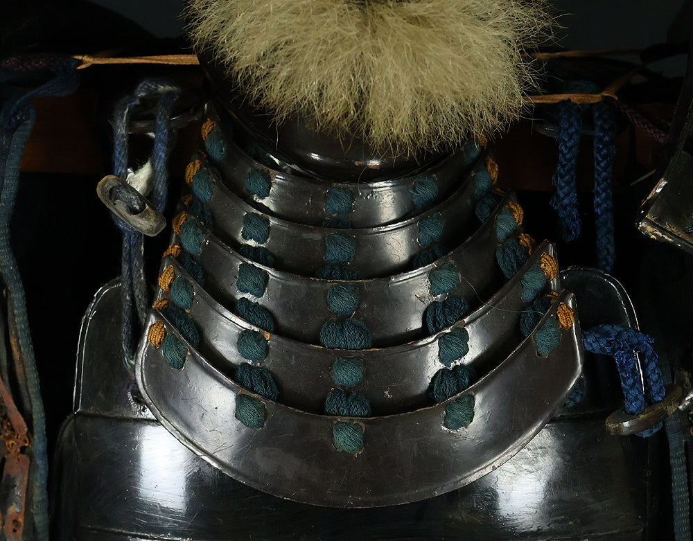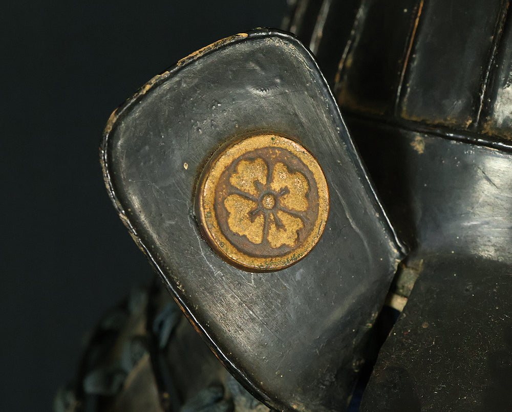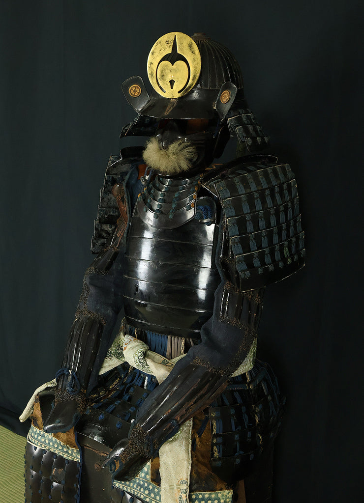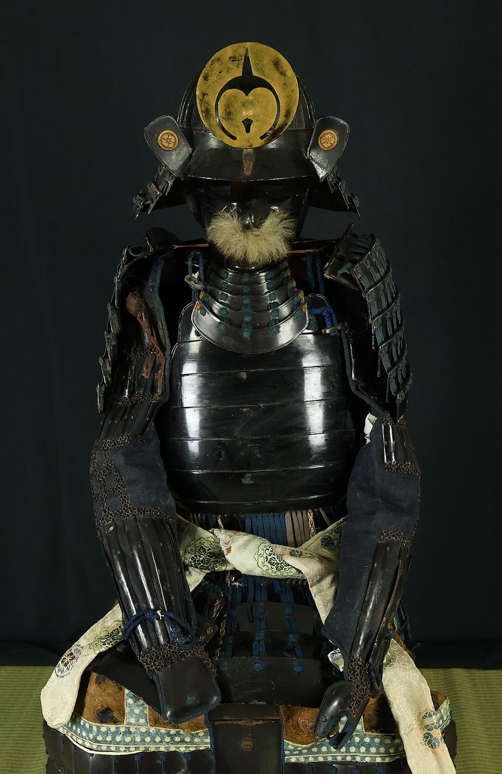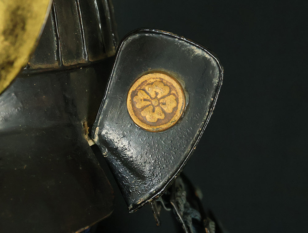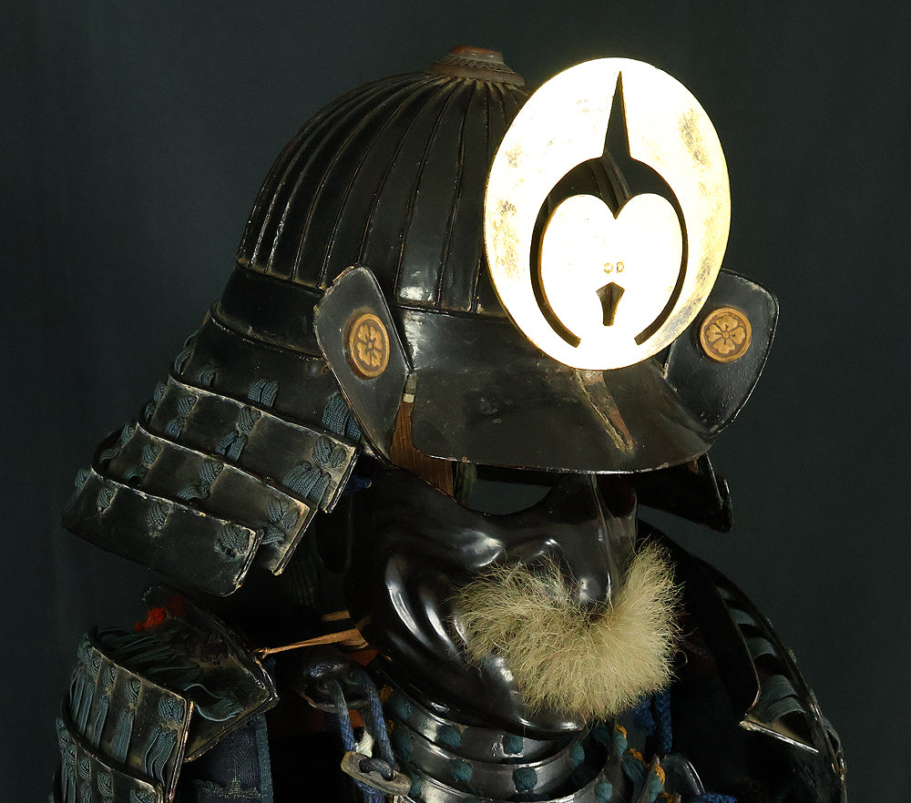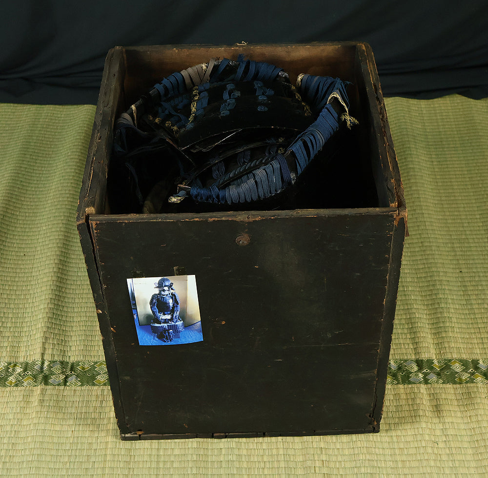 This authentic life-size Samurai armor (Kacchu Yoroi) dates to the Edo period, most likely from the mid to late 18th century, a time when armor was crafted not only for warfare but also as a powerful symbol of samurai status, lineage, and ceremonial dignity. The helmet (kabuto) features a striking large circular gilt lacquer maedate (front crest), an imposing round form enclosing a stylized mon motif reminiscent of an abstracted hollyhock design, set against deep black lacquered iron, creating a bold and authoritative presence. The kabuto is constructed in traditional suji-bachi form with multiple iron plates, finished in black lacquer and fitted with dark blue lacing, while the interior retains its original structure and padding. The menpo (face armor), lacquered in vivid red on the interior and fitted with a naturalistic moustache, reflects refined Edo-period aesthetics, combining martial severity with theatrical expression. The cuirass and kusazuri are composed of black lacquered iron plates laced in dark indigo, forming a complete and harmonious suit that conveys both strength and elegance. Unlike purely decorative later reproductions, this armor preserves the correct structural configuration of a functional gusoku, yet its refined balance and uniform lacing indicate production during the peaceful Edo era, when craftsmanship reached a highly sophisticated level. The presence of the original armor stand and traditional storage box further enhances its historical integrity, as complete life-size sets with box and stand are increasingly rare on the market. When displayed, the armor commands space with quiet authority—the black lacquer absorbing light, the golden maedate catching it—evoking the dignified atmosphere of a samurai residence in the late Edo period. A powerful and complete example of Japanese martial culture, combining kabuto, menpo, full body armor, stand, and storage box into one impressive and highly collectible ensemble.
