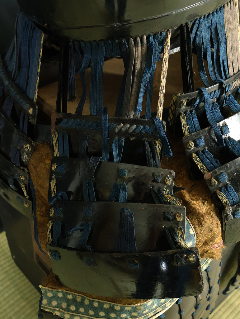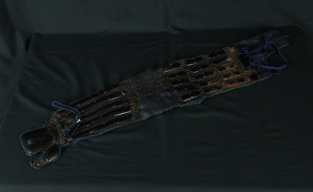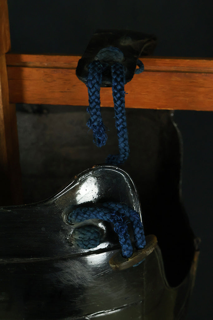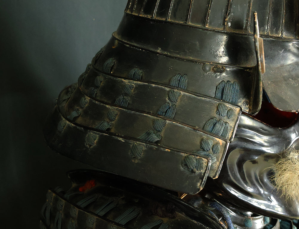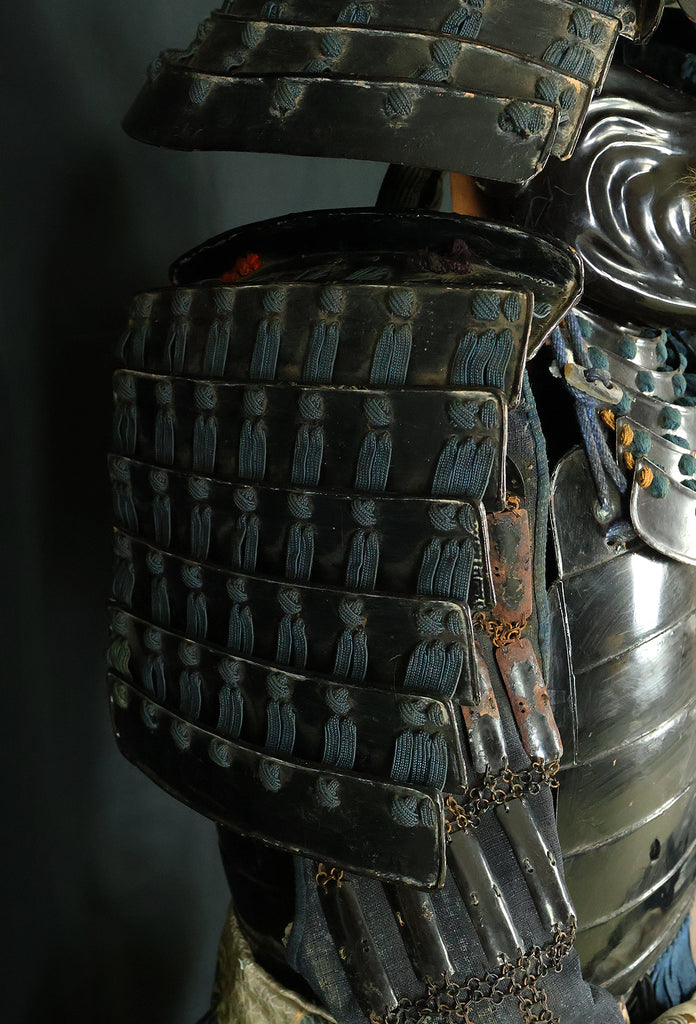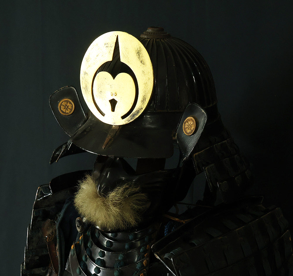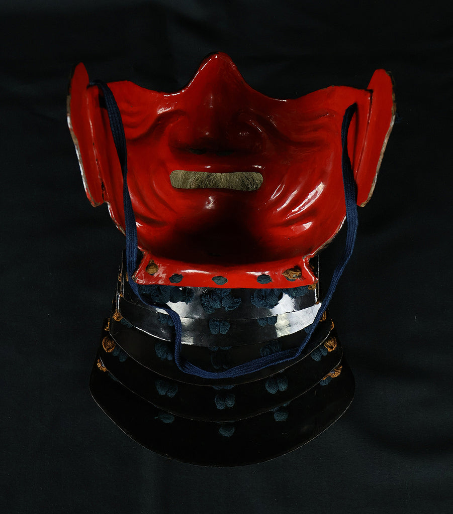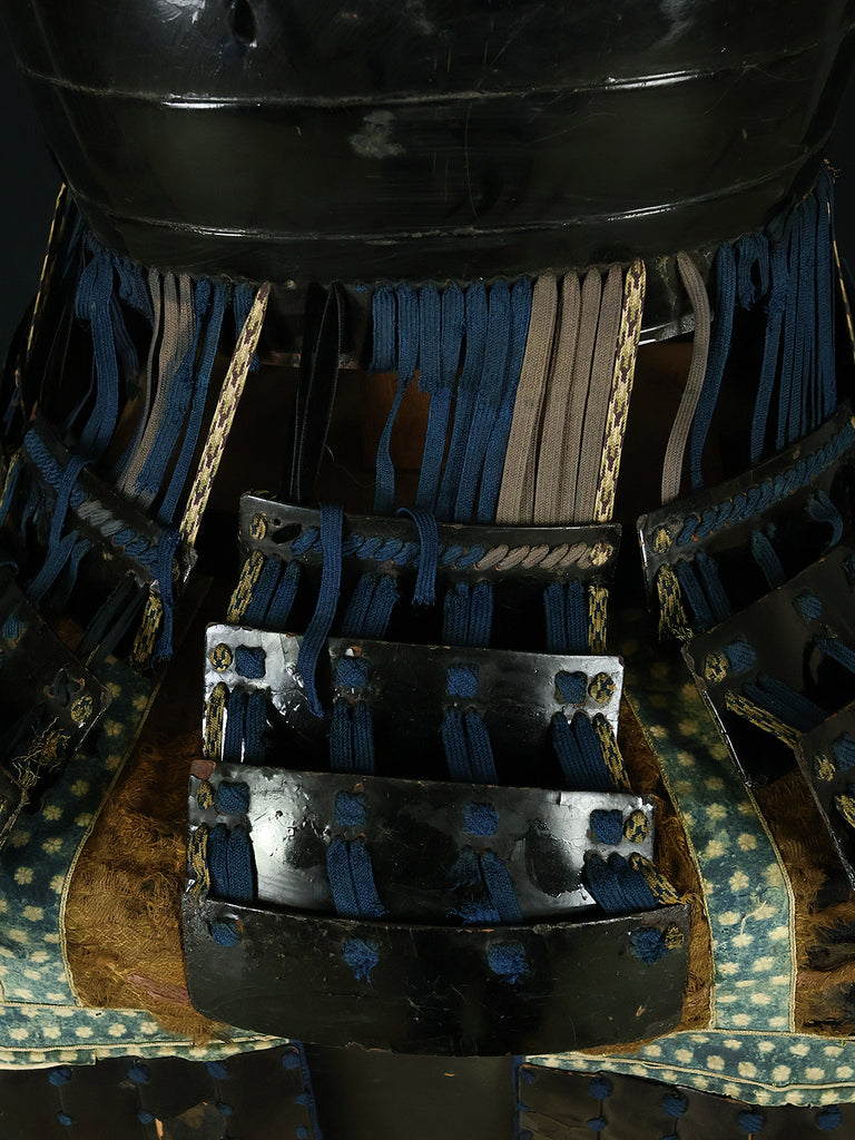 This authentic life-size Samurai armor (Kacchu Yoroi) dates to the Edo period, most likely from the mid to late 18th century, a time when armor was crafted not only for warfare but also as a powerful symbol of samurai status, lineage, and ceremonial dignity. The helmet (kabuto) features a striking large circular gilt lacquer maedate (front crest), an imposing round form enclosing a stylized mon motif reminiscent of an abstracted hollyhock design, set against deep black lacquered iron, creating a bold and authoritative presence. The kabuto is constructed in traditional suji-bachi form with multiple iron plates, finished in black lacquer and fitted with dark blue lacing, while the interior retains its original structure and padding. The menpo (face armor), lacquered in vivid red on the interior and fitted with a naturalistic moustache, reflects refined Edo-period aesthetics, combining martial severity with theatrical expression. The cuirass and kusazuri are composed of black lacquered iron plates laced in dark indigo, forming a complete and harmonious suit that conveys both strength and elegance. Unlike purely decorative later reproductions, this armor preserves the correct structural configuration of a functional gusoku, yet its refined balance and uniform lacing indicate production during the peaceful Edo era, when craftsmanship reached a highly sophisticated level. The presence of the original armor stand and traditional storage box further enhances its historical integrity, as complete life-size sets with box and stand are increasingly rare on the market. When displayed, the armor commands space with quiet authority—the black lacquer absorbing light, the golden maedate catching it—evoking the dignified atmosphere of a samurai residence in the late Edo period. A powerful and complete example of Japanese martial culture, combining kabuto, menpo, full body armor, stand, and storage box into one impressive and highly collectible ensemble.