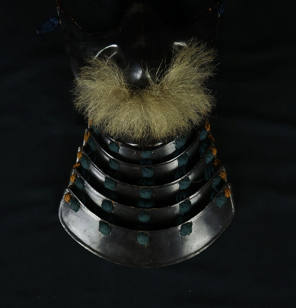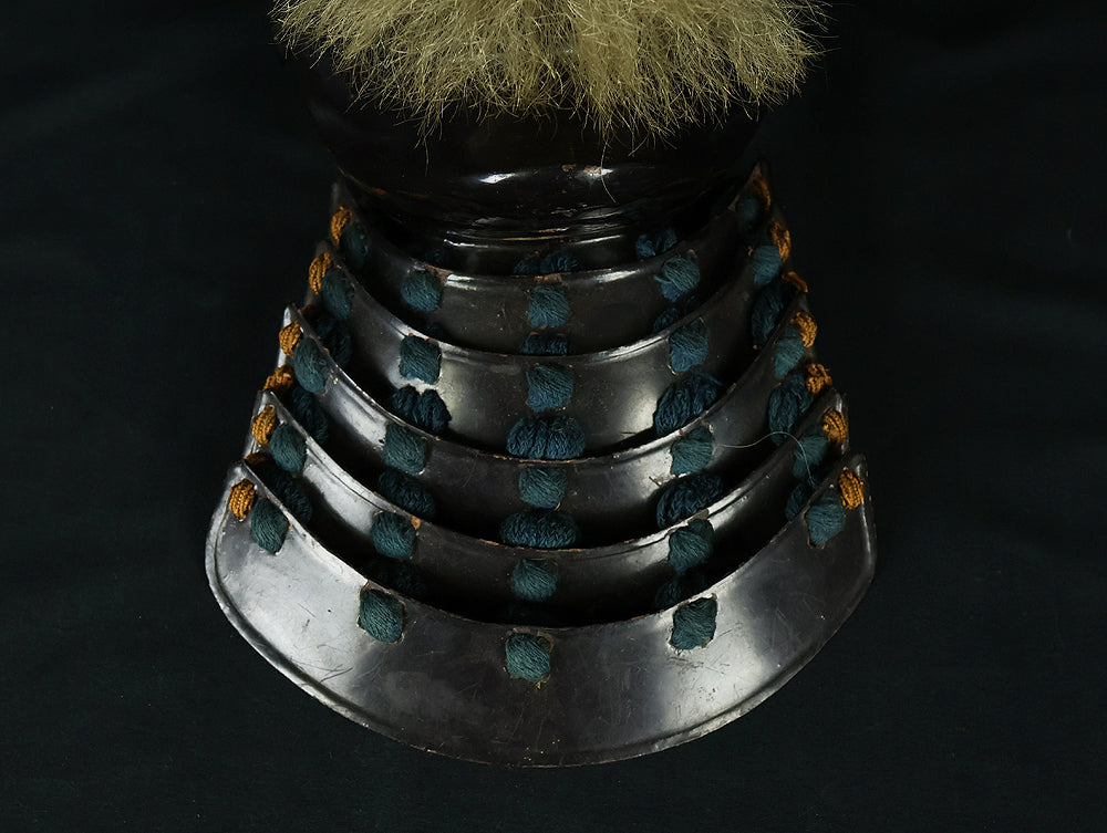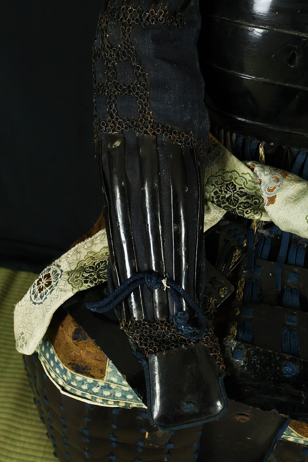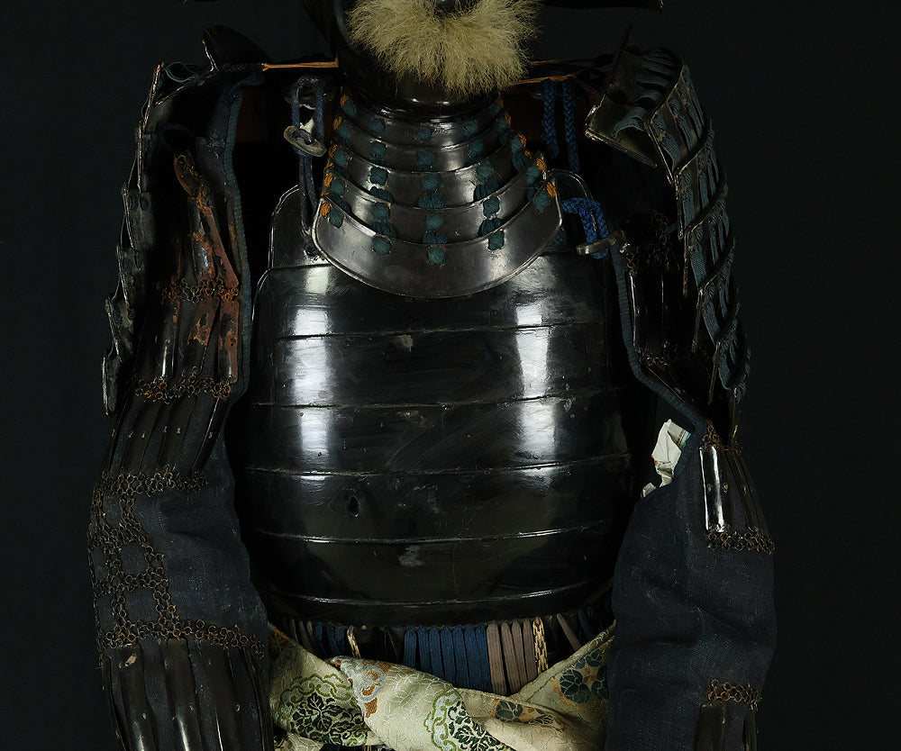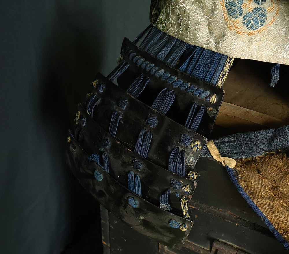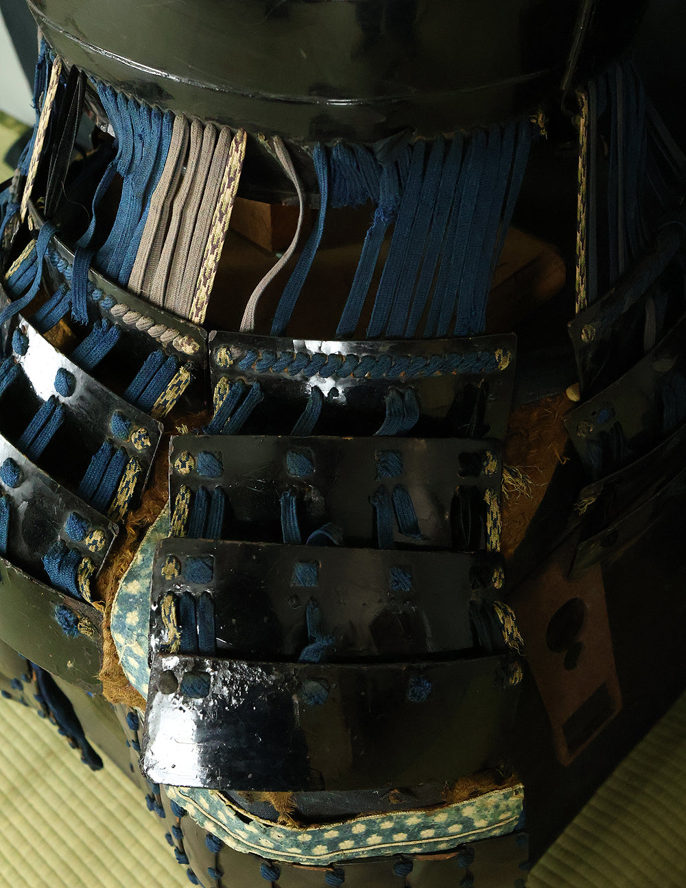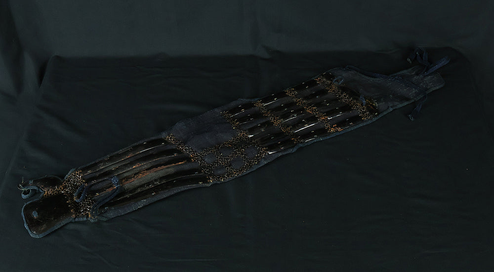 This authentic life-size Samurai armor (Kacchu Yoroi) dates to the Edo period, most likely from the mid to late 18th century, a time when armor was crafted not only for warfare but also as a powerful symbol of samurai status, lineage, and ceremonial dignity. The helmet (kabuto) features a striking large circular gilt lacquer maedate (front crest), an imposing round form enclosing a stylized mon motif reminiscent of an abstracted hollyhock design, set against deep black lacquered iron, creating a bold and authoritative presence. The kabuto is constructed in traditional suji-bachi form with multiple iron plates, finished in black lacquer and fitted with dark blue lacing, while the interior retains its original structure and padding. The menpo (face armor), lacquered in vivid red on the interior and fitted with a naturalistic moustache, reflects refined Edo-period aesthetics, combining martial severity with theatrical expression. The cuirass and kusazuri are composed of black lacquered iron plates laced in dark indigo, forming a complete and harmonious suit that conveys both strength and elegance. Unlike purely decorative later reproductions, this armor preserves the correct structural configuration of a functional gusoku, yet its refined balance and uniform lacing indicate production during the peaceful Edo era, when craftsmanship reached a highly sophisticated level. The presence of the original armor stand and traditional storage box further enhances its historical integrity, as complete life-size sets with box and stand are increasingly rare on the market. When displayed, the armor commands space with quiet authority—the black lacquer absorbing light, the golden maedate catching it—evoking the dignified atmosphere of a samurai residence in the late Edo period. A powerful and complete example of Japanese martial culture, combining kabuto, menpo, full body armor, stand, and storage box into one impressive and highly collectible ensemble.