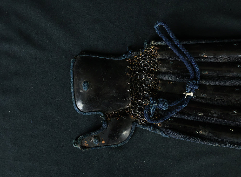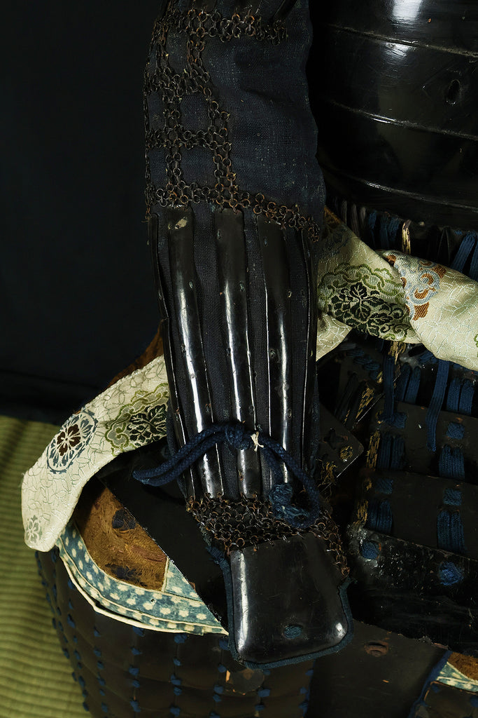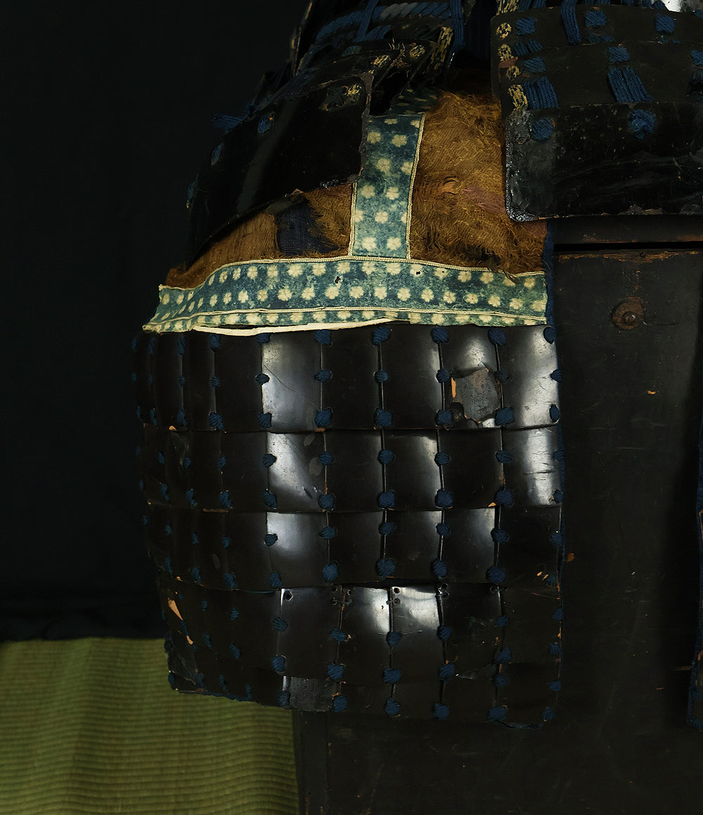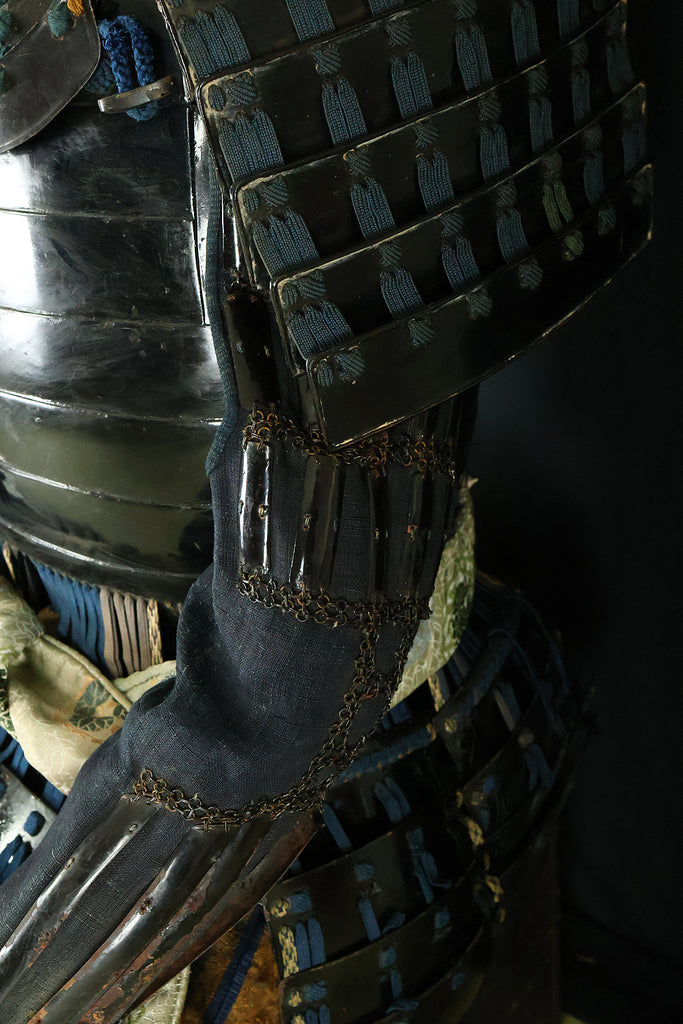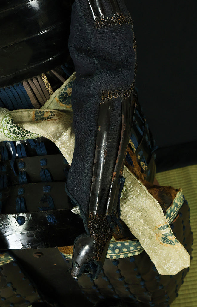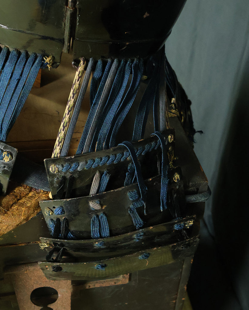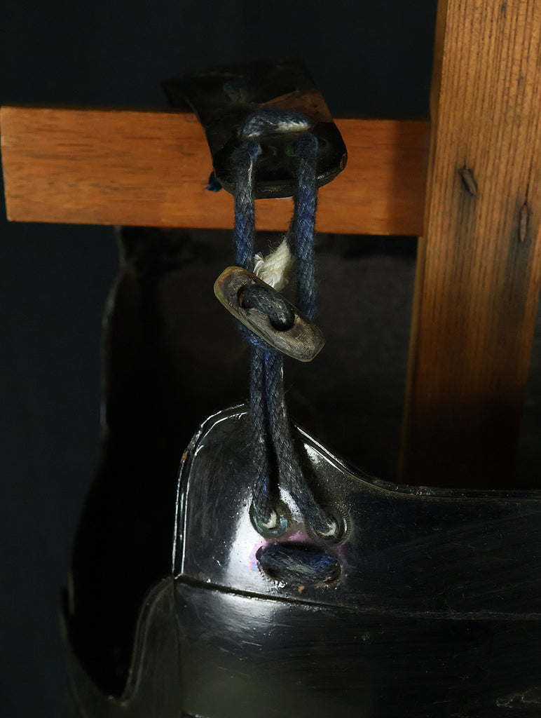 This authentic life-size Samurai armor (Kacchu Yoroi) dates to the Edo period, most likely from the mid to late 18th century, a time when armor was crafted not only for warfare but also as a powerful symbol of samurai status, lineage, and ceremonial dignity. The helmet (kabuto) features a striking large circular gilt lacquer maedate (front crest), an imposing round form enclosing a stylized mon motif reminiscent of an abstracted hollyhock design, set against deep black lacquered iron, creating a bold and authoritative presence. The kabuto is constructed in traditional suji-bachi form with multiple iron plates, finished in black lacquer and fitted with dark blue lacing, while the interior retains its original structure and padding. The menpo (face armor), lacquered in vivid red on the interior and fitted with a naturalistic moustache, reflects refined Edo-period aesthetics, combining martial severity with theatrical expression. The cuirass and kusazuri are composed of black lacquered iron plates laced in dark indigo, forming a complete and harmonious suit that conveys both strength and elegance. Unlike purely decorative later reproductions, this armor preserves the correct structural configuration of a functional gusoku, yet its refined balance and uniform lacing indicate production during the peaceful Edo era, when craftsmanship reached a highly sophisticated level. The presence of the original armor stand and traditional storage box further enhances its historical integrity, as complete life-size sets with box and stand are increasingly rare on the market. When displayed, the armor commands space with quiet authority—the black lacquer absorbing light, the golden maedate catching it—evoking the dignified atmosphere of a samurai residence in the late Edo period. A powerful and complete example of Japanese martial culture, combining kabuto, menpo, full body armor, stand, and storage box into one impressive and highly collectible ensemble.