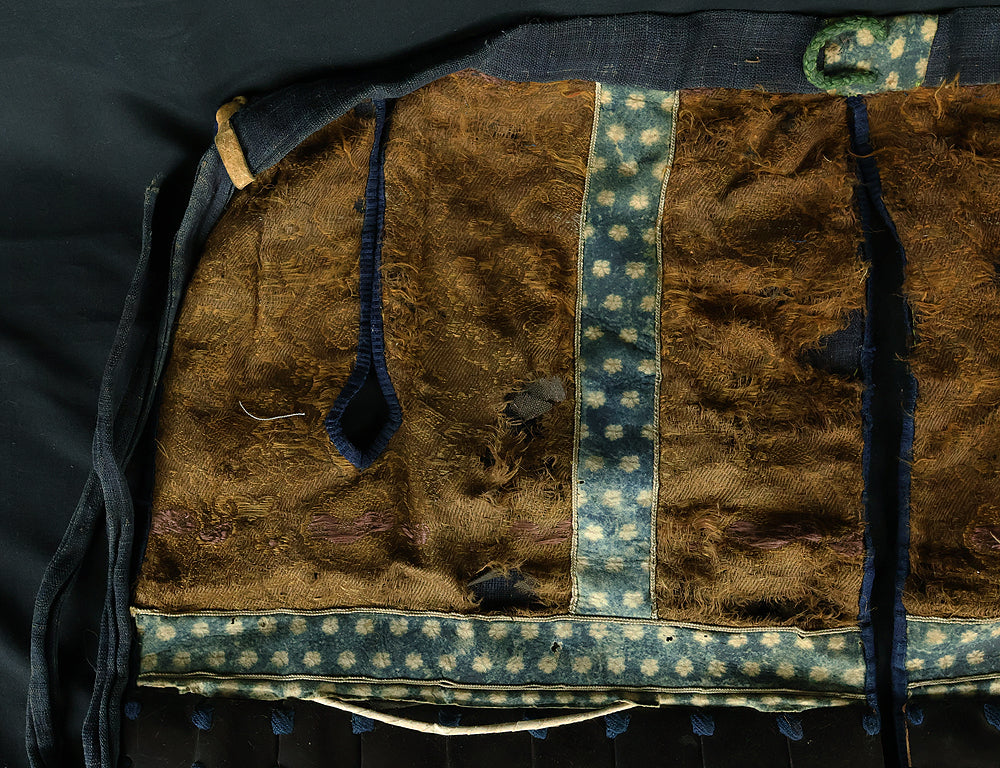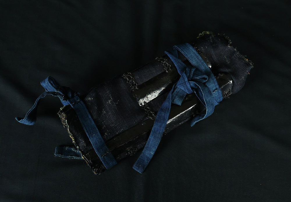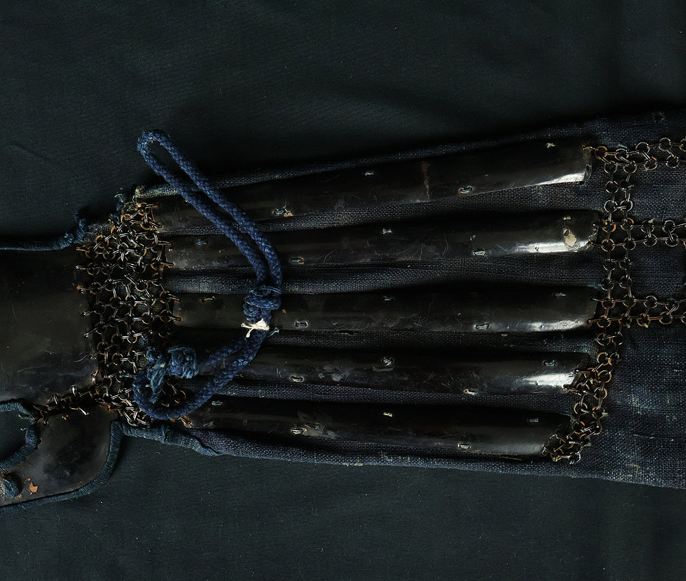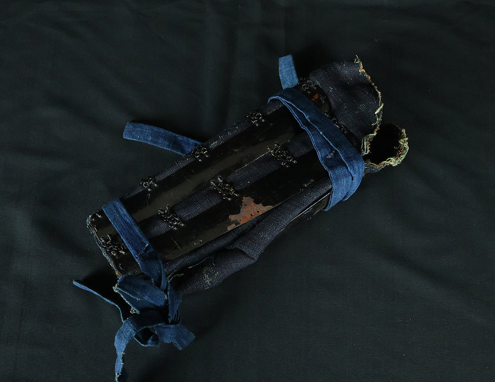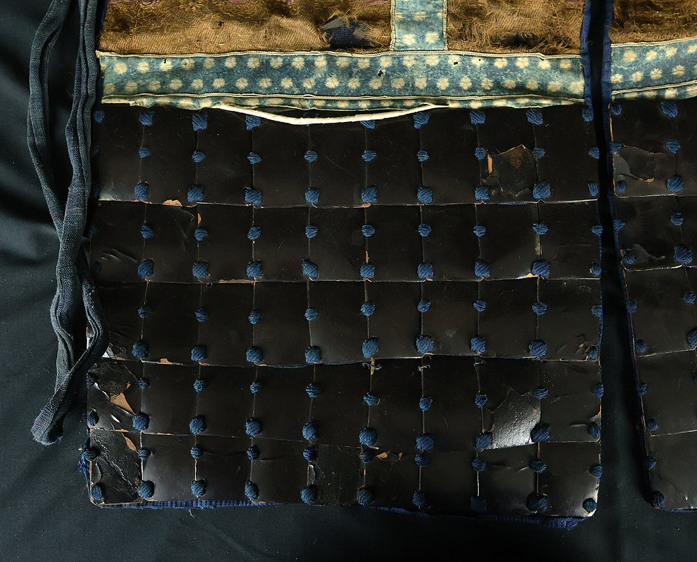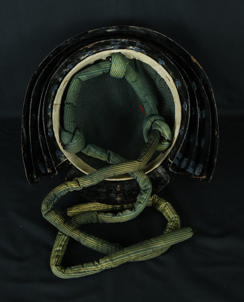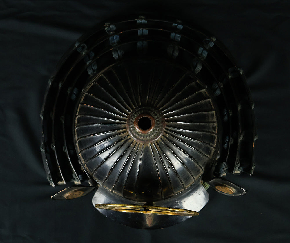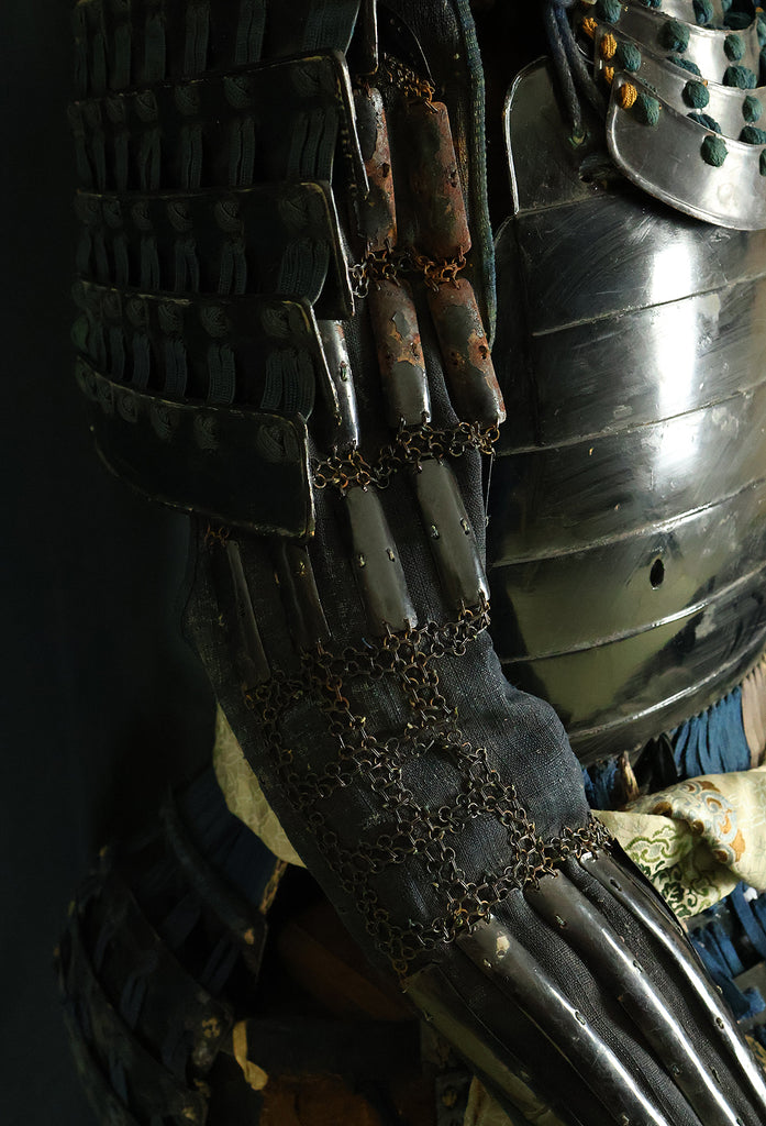 This authentic life-size Samurai armor (Kacchu Yoroi) dates to the Edo period, most likely from the mid to late 18th century, a time when armor was crafted not only for warfare but also as a powerful symbol of samurai status, lineage, and ceremonial dignity. The helmet (kabuto) features a striking large circular gilt lacquer maedate (front crest), an imposing round form enclosing a stylized mon motif reminiscent of an abstracted hollyhock design, set against deep black lacquered iron, creating a bold and authoritative presence. The kabuto is constructed in traditional suji-bachi form with multiple iron plates, finished in black lacquer and fitted with dark blue lacing, while the interior retains its original structure and padding. The menpo (face armor), lacquered in vivid red on the interior and fitted with a naturalistic moustache, reflects refined Edo-period aesthetics, combining martial severity with theatrical expression. The cuirass and kusazuri are composed of black lacquered iron plates laced in dark indigo, forming a complete and harmonious suit that conveys both strength and elegance. Unlike purely decorative later reproductions, this armor preserves the correct structural configuration of a functional gusoku, yet its refined balance and uniform lacing indicate production during the peaceful Edo era, when craftsmanship reached a highly sophisticated level. The presence of the original armor stand and traditional storage box further enhances its historical integrity, as complete life-size sets with box and stand are increasingly rare on the market. When displayed, the armor commands space with quiet authority—the black lacquer absorbing light, the golden maedate catching it—evoking the dignified atmosphere of a samurai residence in the late Edo period. A powerful and complete example of Japanese martial culture, combining kabuto, menpo, full body armor, stand, and storage box into one impressive and highly collectible ensemble.