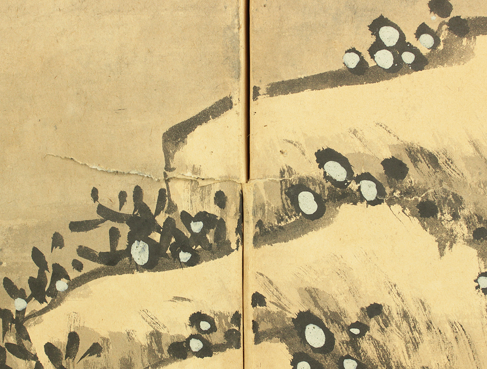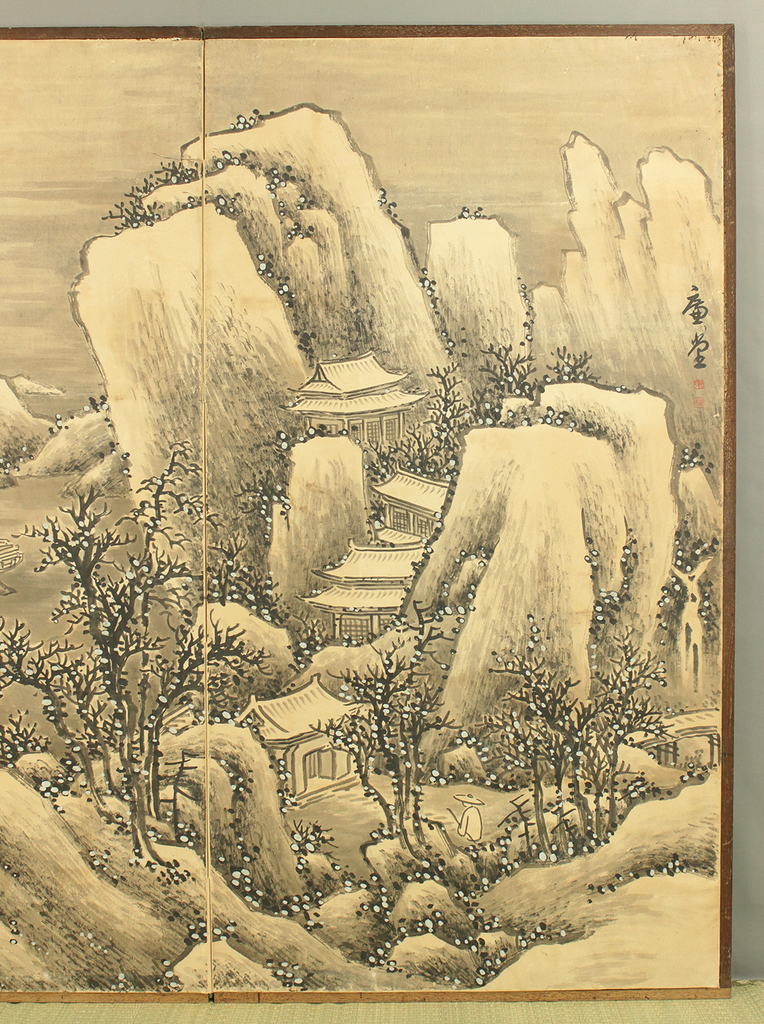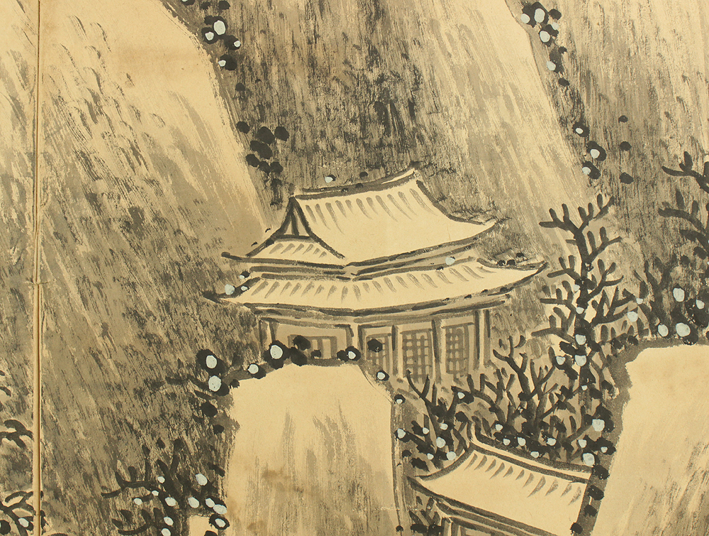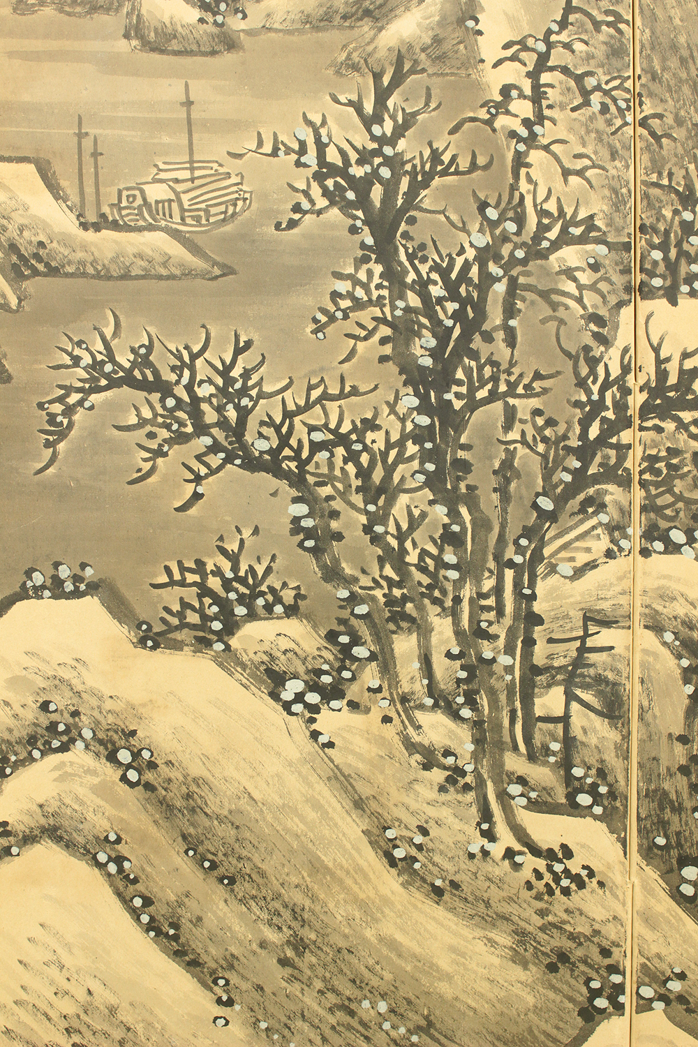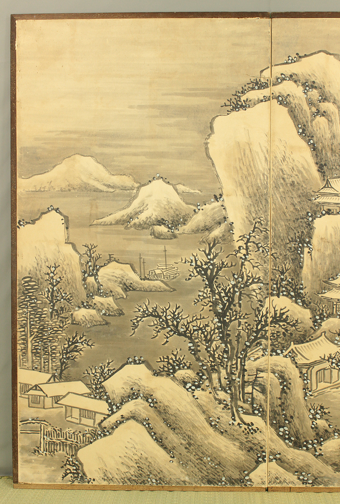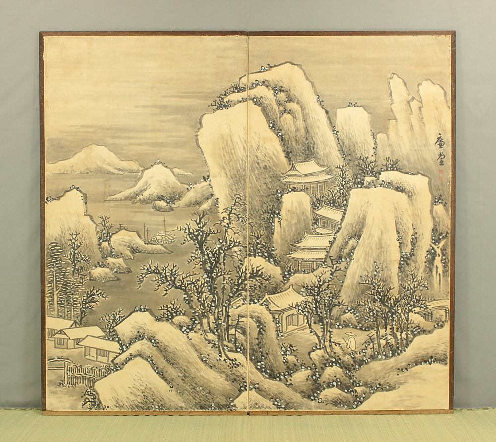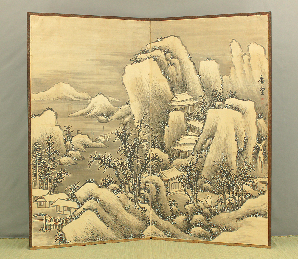 大橋廉堂 Ohashi Kendo (1897-1951) Two Panels Folding Screens Byobu Room Dividers / Winter Landscape Sansui VA749