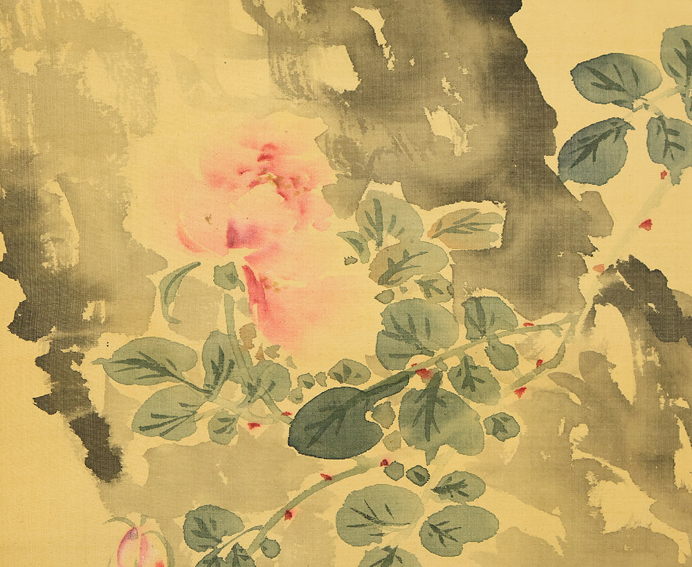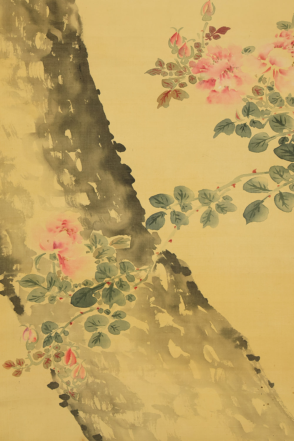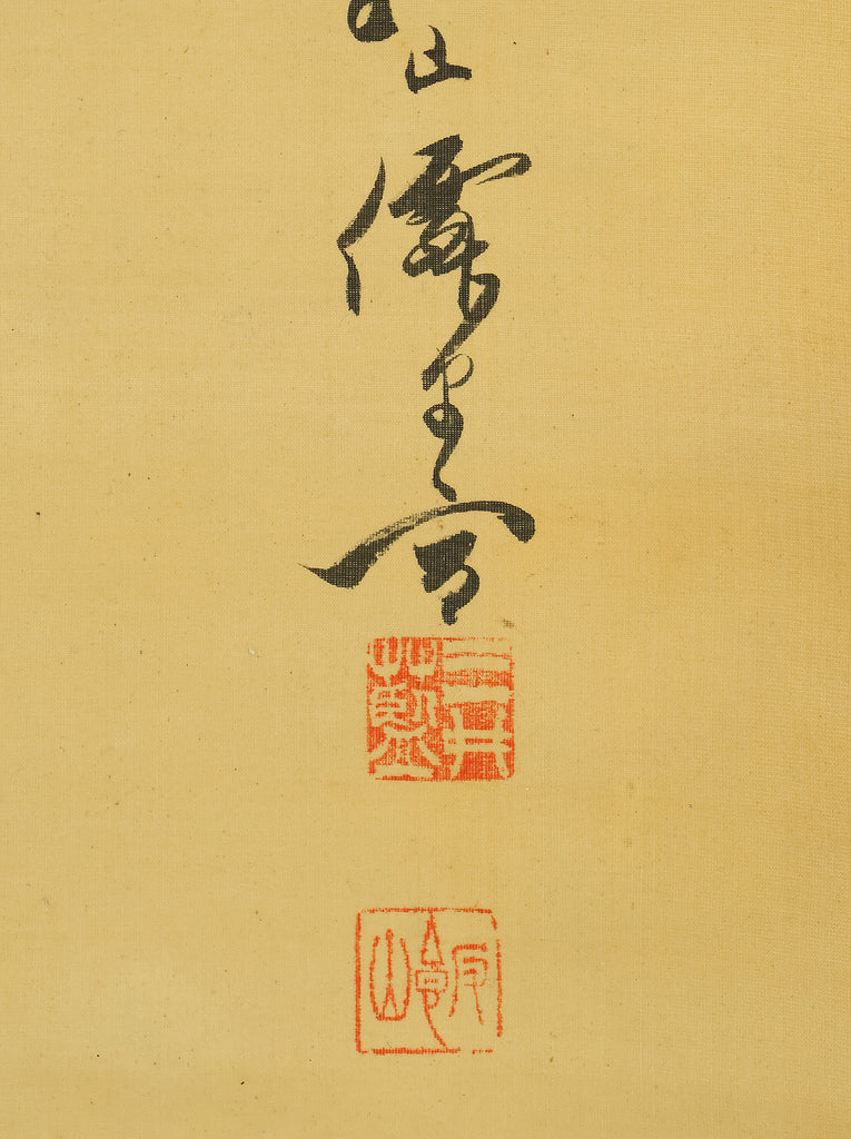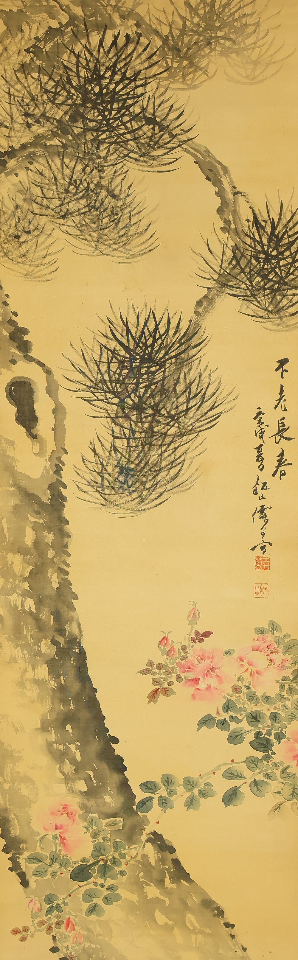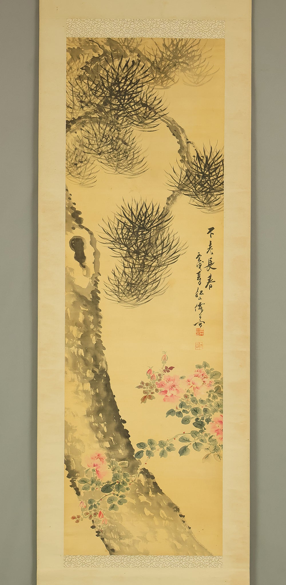 A refined hanging scroll by Mitsui Hanzan (1882–1934), depicting an elegant composition of an old pine tree with blooming peonies. Hanzan, known for his lyrical brushwork and gentle, refined coloration, beautifully contrasts the strength of the robust pine trunk with the softness and vitality of the blossoms. The subtle modulation of ink and delicate pigments creates a serene and auspicious atmosphere, long cherished in Japanese art for its symbolism of longevity and prosperity. The scroll bears Hanzan’s signature and seals and is mounted in a traditional Japanese silk format. A wooden storage box is included for safekeeping. A graceful example of early 20th-century Japanese painting, suitable for interior display and for collectors who appreciate floral themes, classical motifs, and the elegance of Nihonga expression.