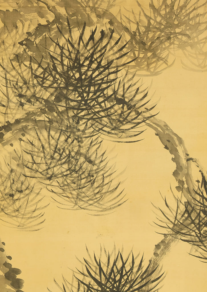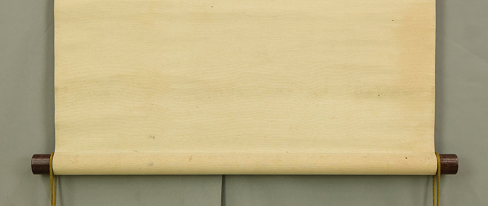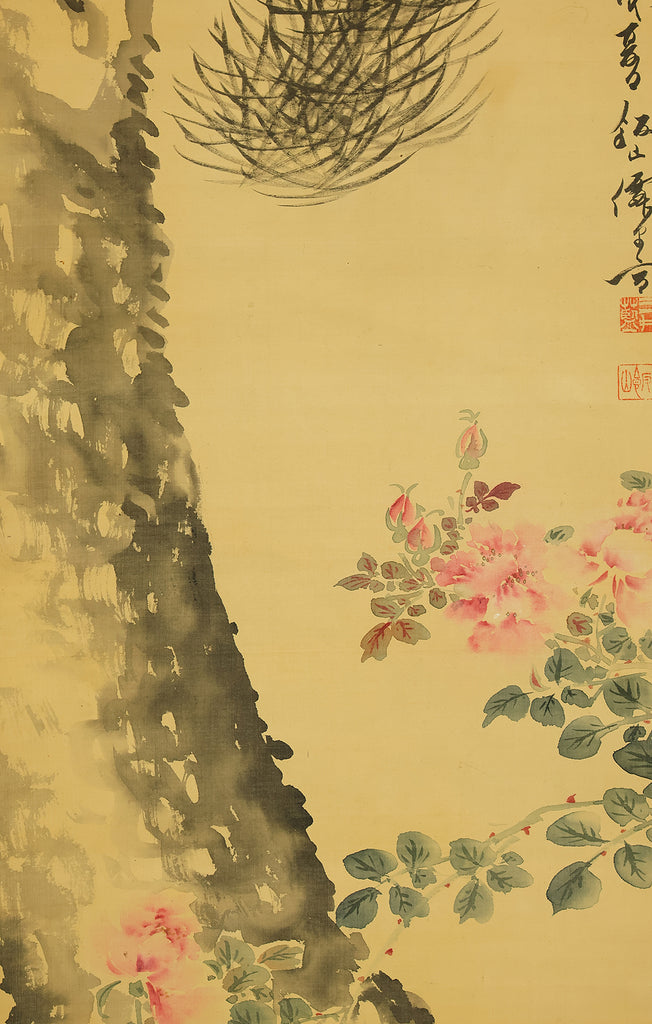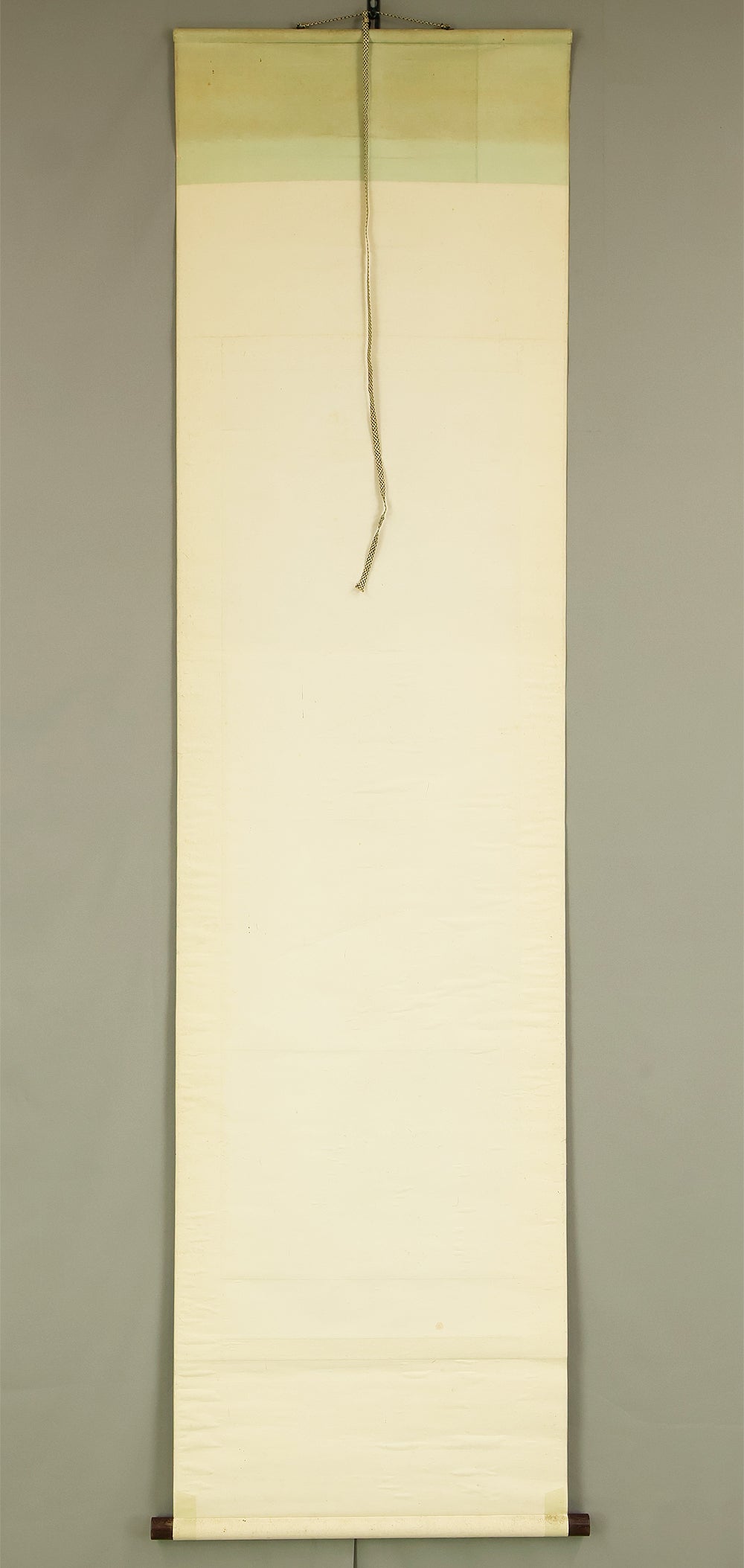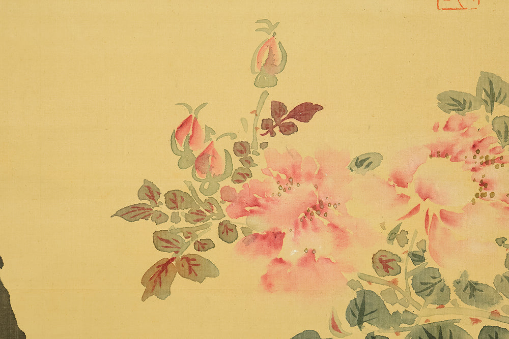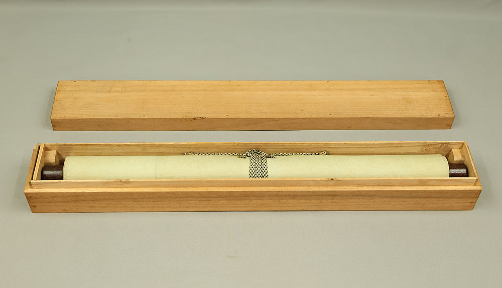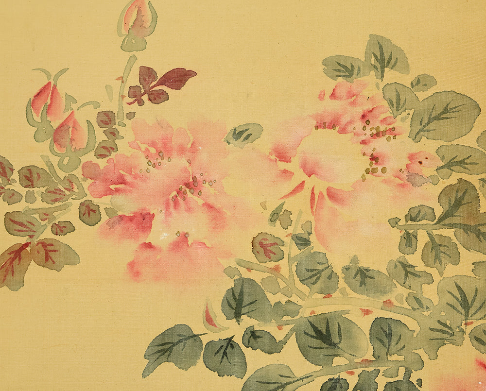 A refined hanging scroll by Mitsui Hanzan (1882–1934), depicting an elegant composition of an old pine tree with blooming peonies. Hanzan, known for his lyrical brushwork and gentle, refined coloration, beautifully contrasts the strength of the robust pine trunk with the softness and vitality of the blossoms. The subtle modulation of ink and delicate pigments creates a serene and auspicious atmosphere, long cherished in Japanese art for its symbolism of longevity and prosperity. The scroll bears Hanzan’s signature and seals and is mounted in a traditional Japanese silk format. A wooden storage box is included for safekeeping. A graceful example of early 20th-century Japanese painting, suitable for interior display and for collectors who appreciate floral themes, classical motifs, and the elegance of Nihonga expression.