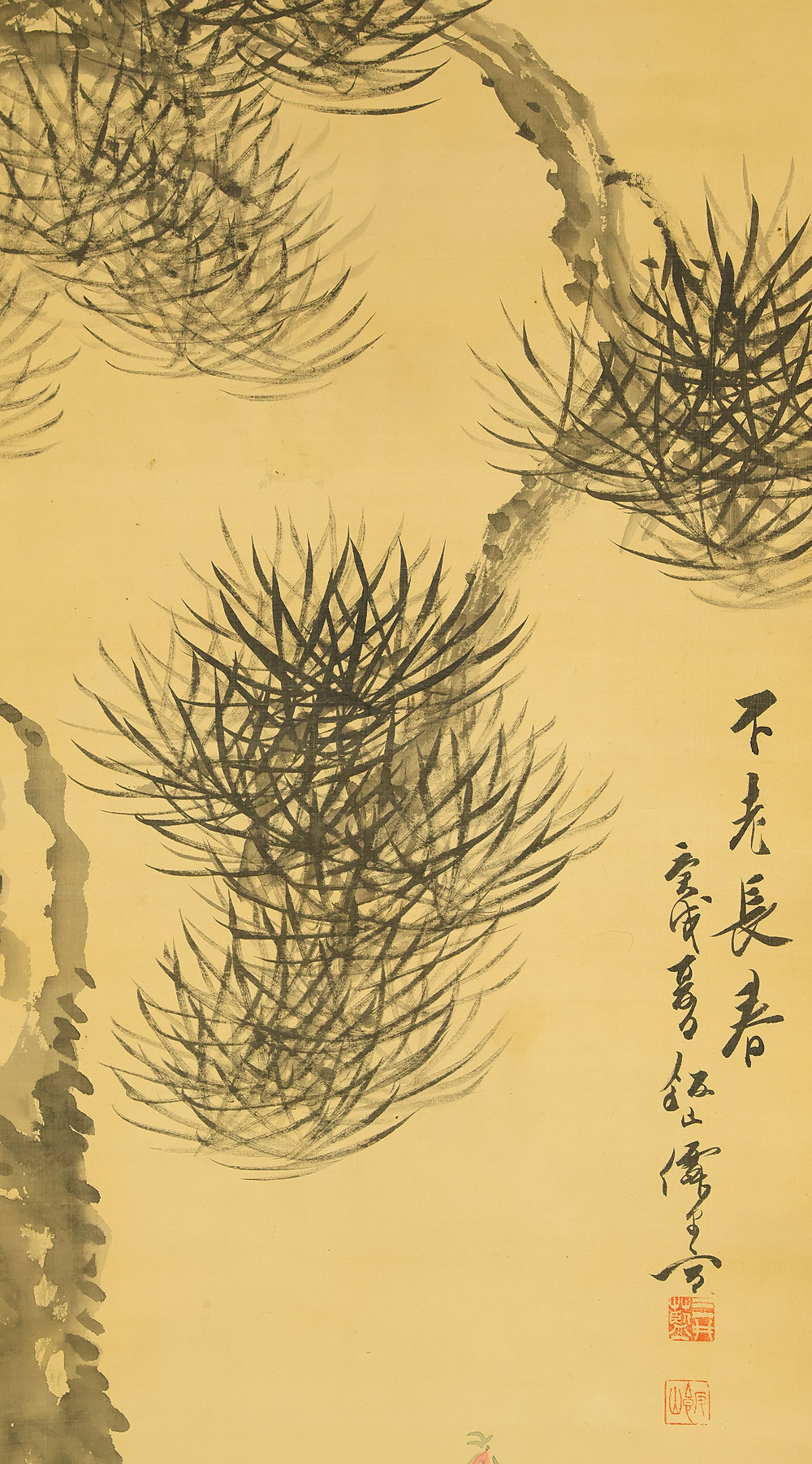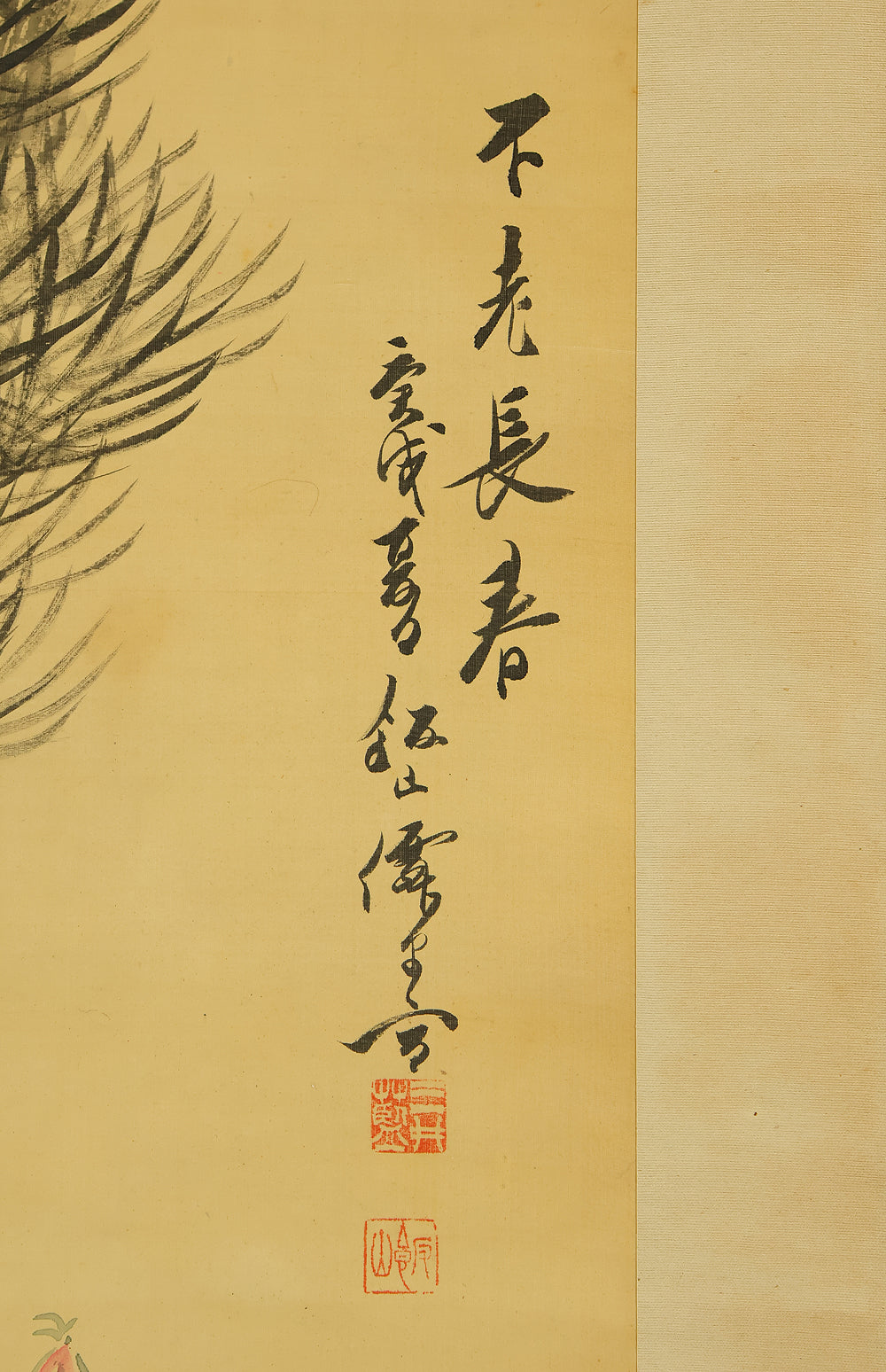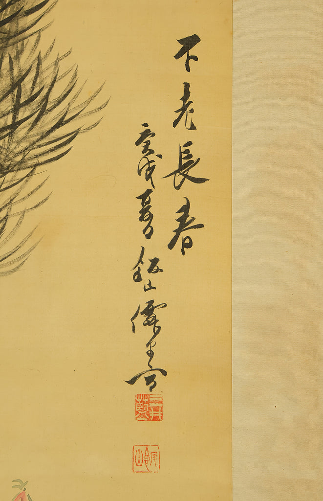 三井飯山 Mitsui Hanzan (1882-1934) Japanese art kakejiku kakemono wall hanging scroll / Pine Tree and Peony with Box RD933