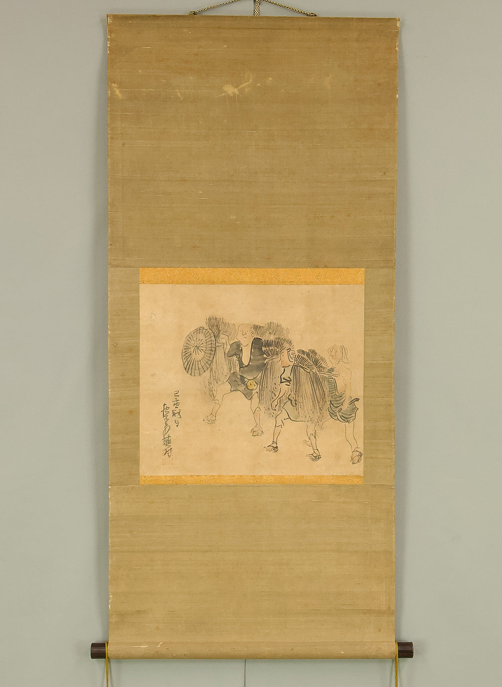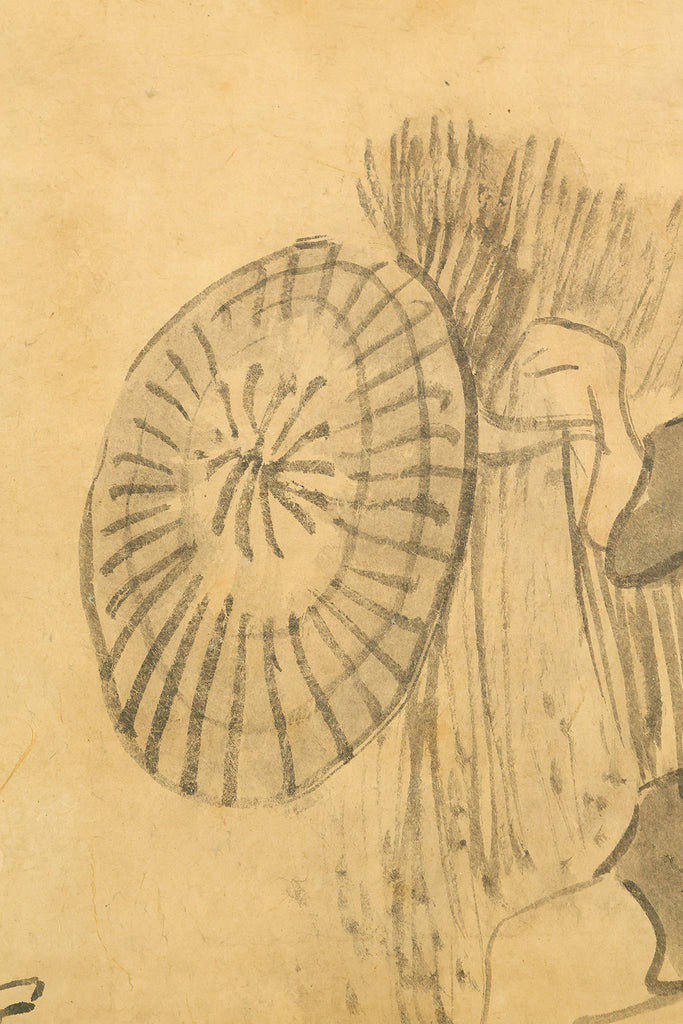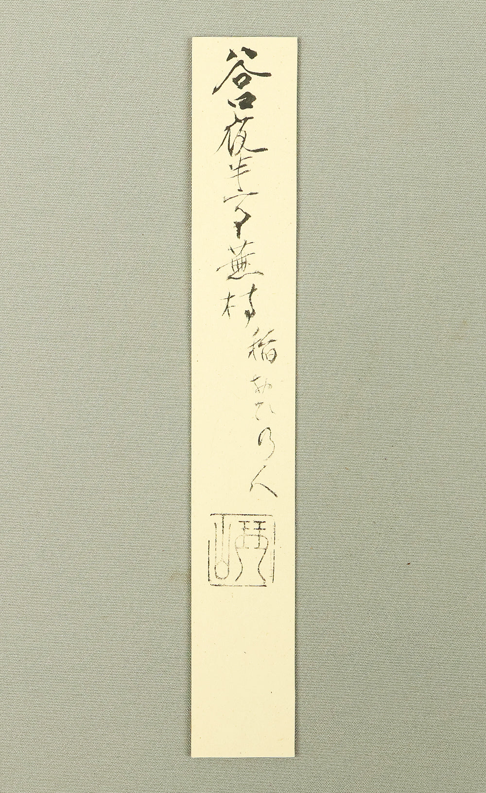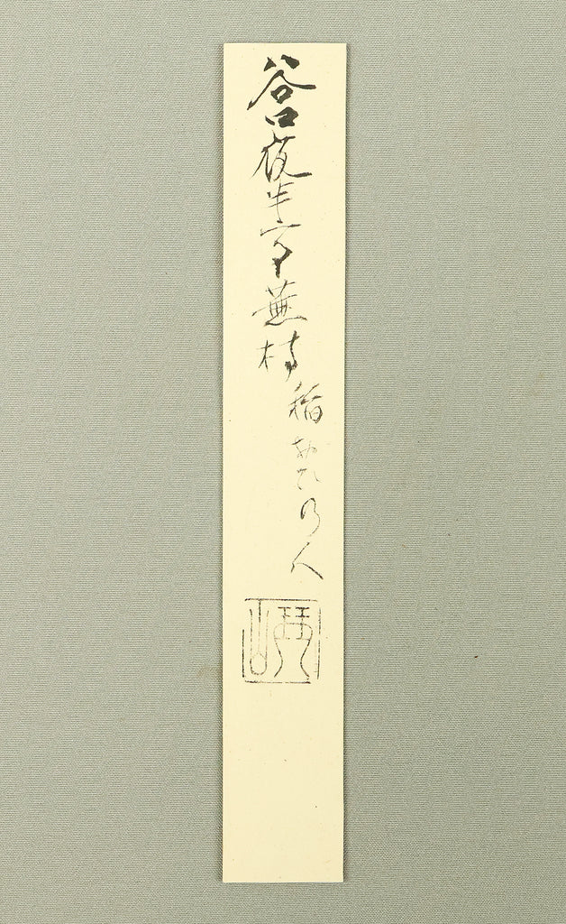 This antique Japanese hanging scroll is attributed to Yosa Buson (1716–1784), one of the most celebrated figures of Edo-period literati culture. The artwork depicts farmers carrying rice ears, rendered in expressive ink brushwork that captures both movement and atmosphere with elegant restraint. Buson’s mastery of composition and line evokes the quiet dignity of rural life, a theme often explored in his visual work. The scroll is accompanied by a Kohitsu (Kohitsuke) appraisal tag, or kimefuda, bearing the seal of Kinzan (琴山), a recognized authority in classical Japanese painting authentication. This certificate adds provenance and scholarly value to the piece. A wooden box is included for preservation. This scroll offers a rare opportunity to acquire a work associated with Buson’s artistic legacy and will appeal to collectors of Japanese ink painting, Edo-period culture, and antique scrolls.