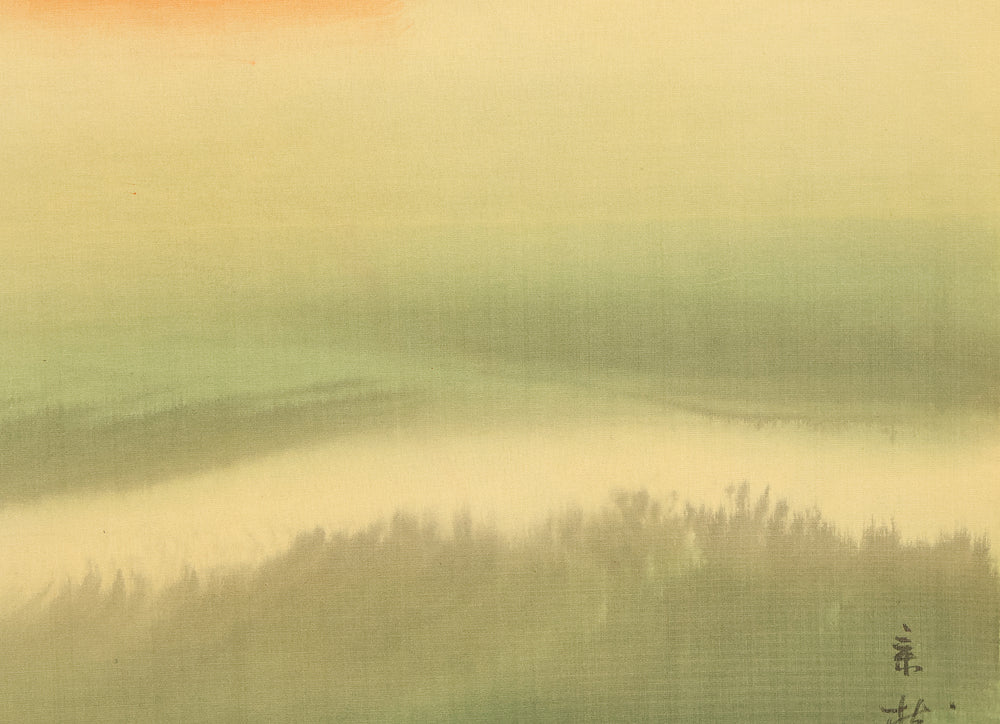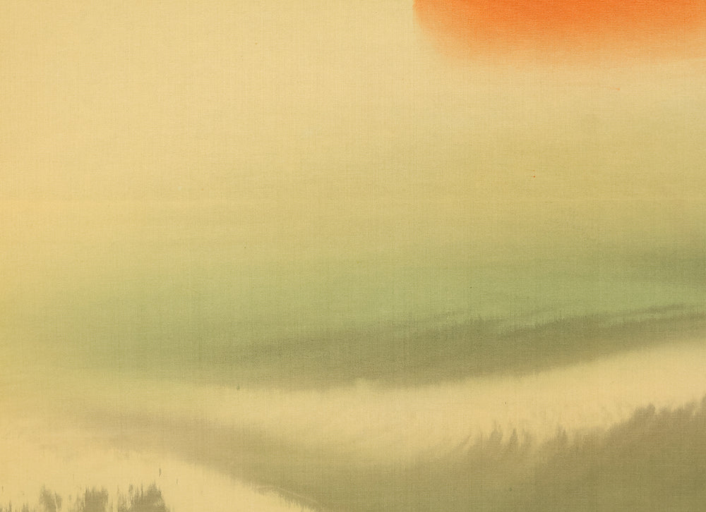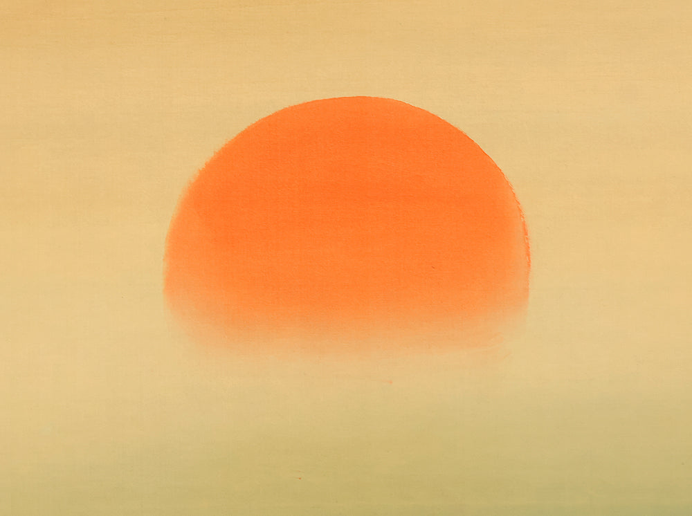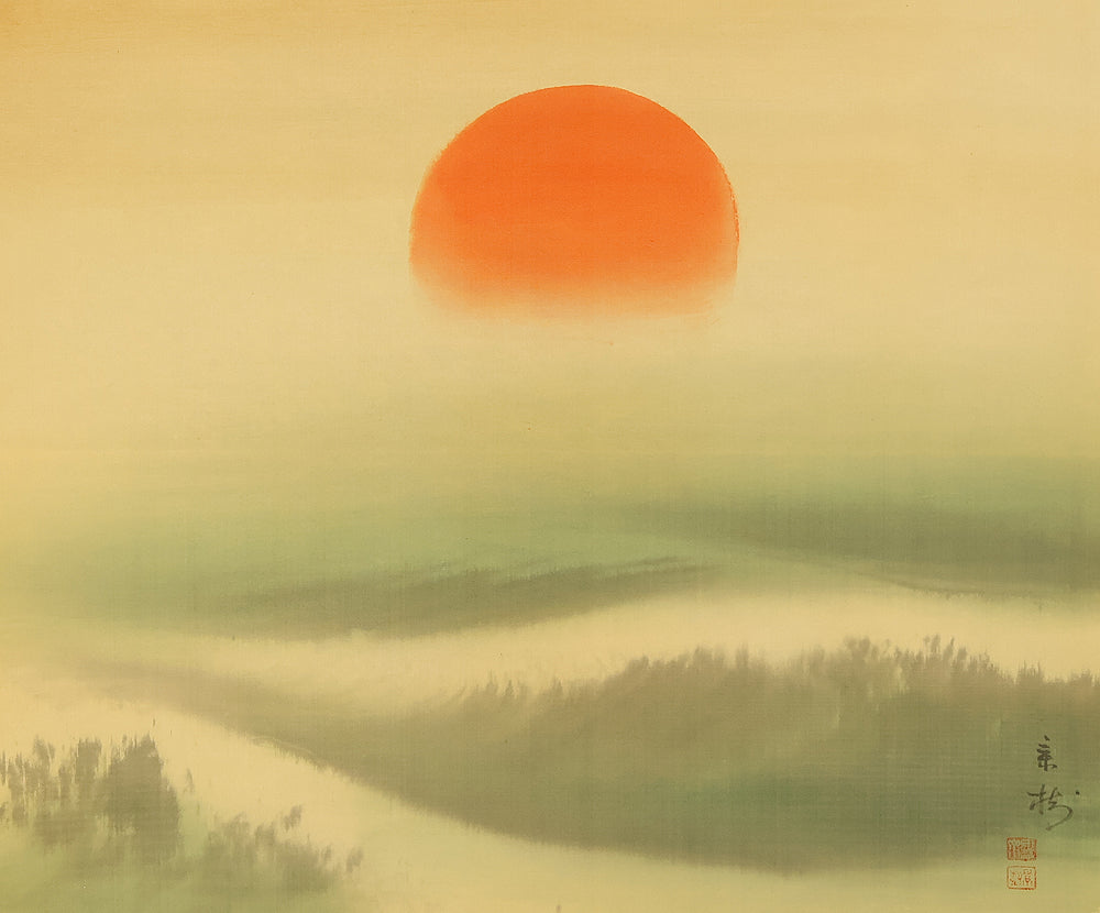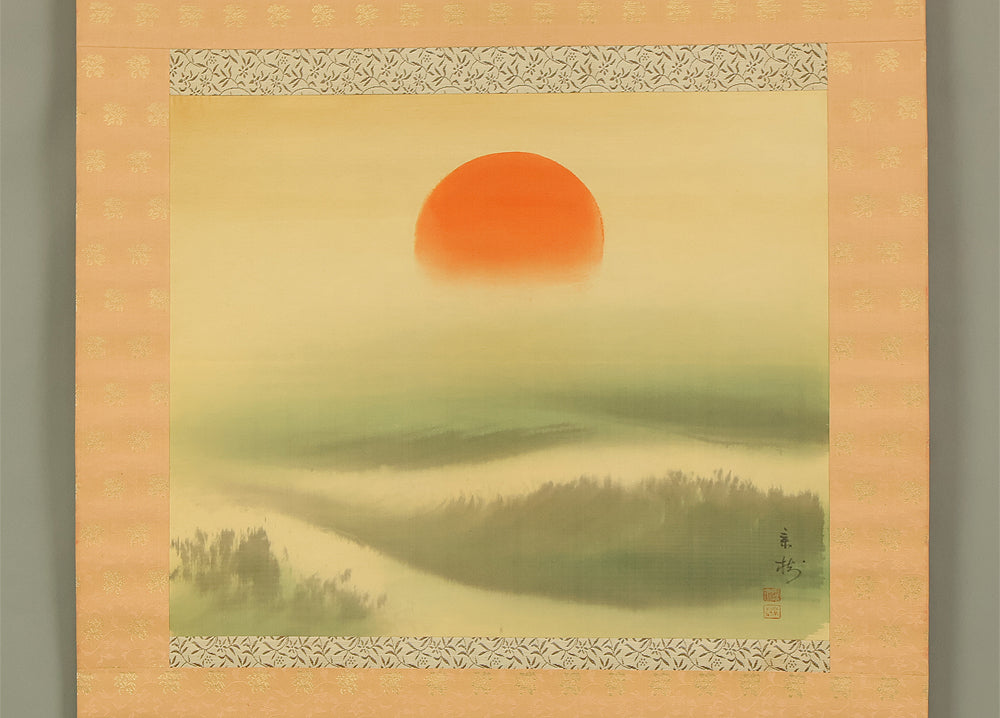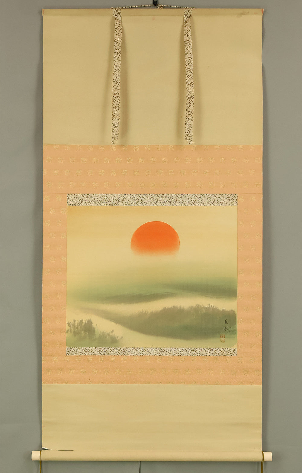This elegant Japanese hanging scroll features a rising sun (asahi) above rolling waves, painted by Imai Keiju (1891–1967), a respected Nihonga artist known for his refined compositions and symbolic clarity.