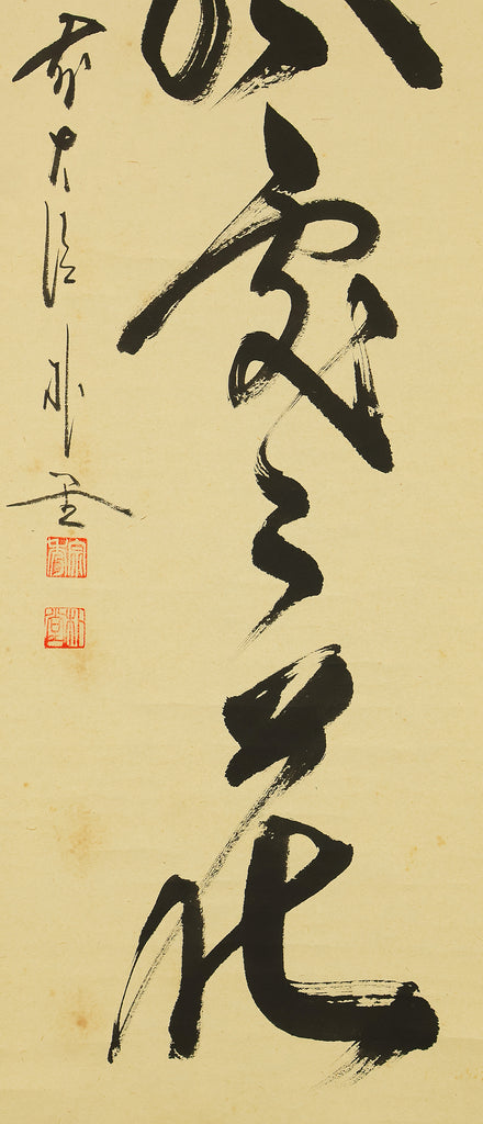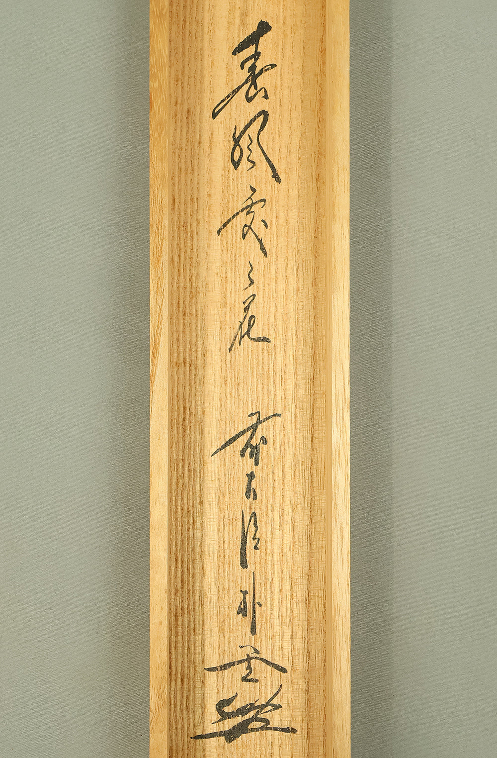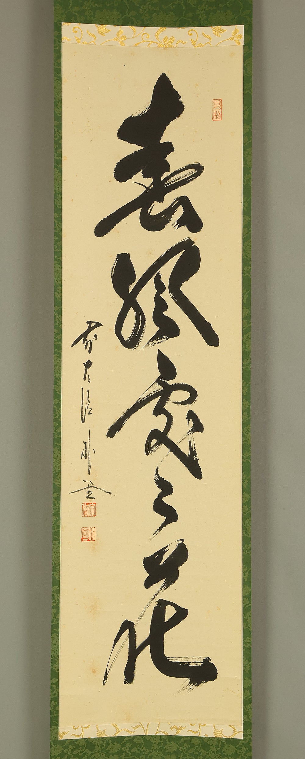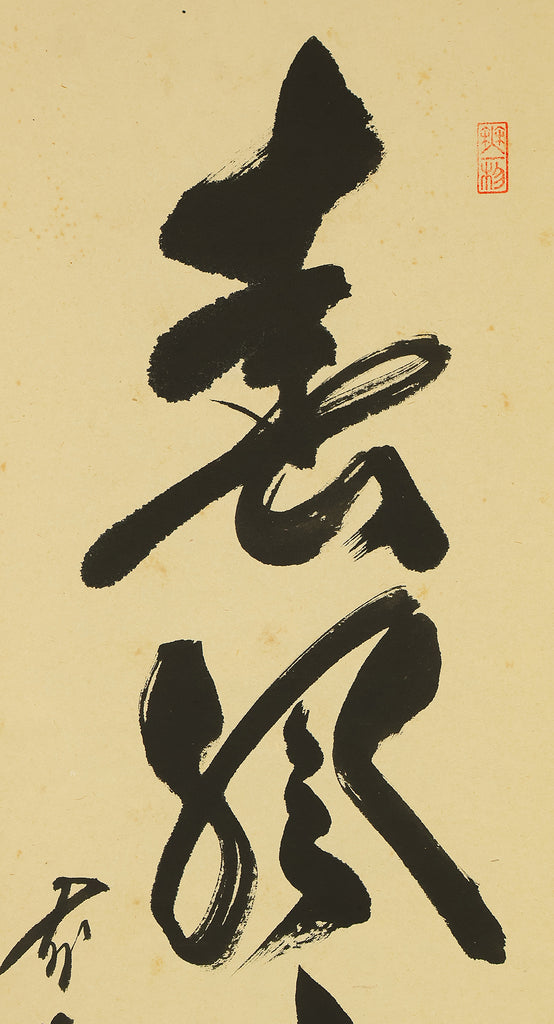 Carrying a gentle sense of seasonal awakening, this calligraphic hanging scroll by Sato Bokudo (b.1935), chief priest of Daitoku‑ji Fukuju‑in, presents the Zen phrase “Shunpu Shosho Hana”—a poetic expression of spring breezes and blossoms appearing everywhere without distinction. Bokudo’s brushwork moves with an ease that reflects both discipline and natural spontaneity, allowing the characters to breathe with the same openness the phrase describes. The inscription conveys the idea that the Buddha’s compassion permeates all places equally, just as flowers bloom freely across the landscape with the arrival of spring. The scroll is accompanied by its original tomobako, and Bokudo’s signature and seals affirm its temple lineage and authenticity. A piece that blends clarity of teaching with the quiet elegance of mature Zen calligraphy.