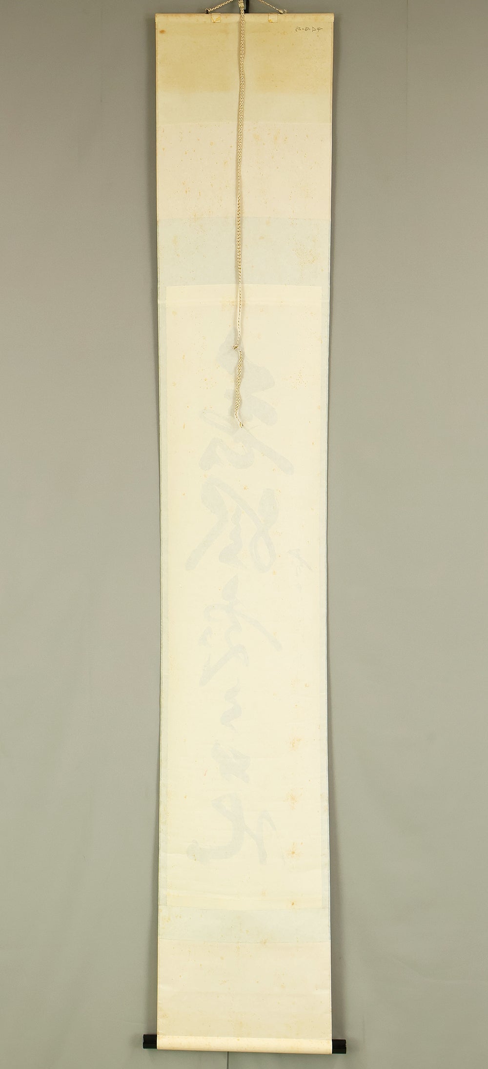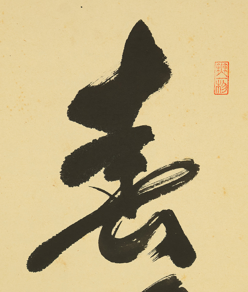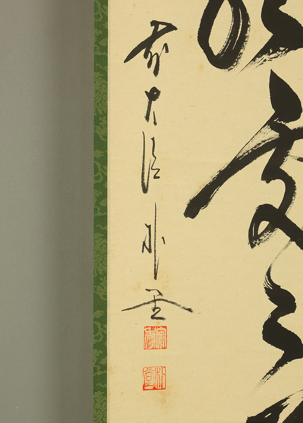 Carrying a gentle sense of seasonal awakening, this calligraphic hanging scroll by Sato Bokudo (b.1935), chief priest of Daitoku‑ji Fukuju‑in, presents the Zen phrase “Shunpu Shosho Hana”—a poetic expression of spring breezes and blossoms appearing everywhere without distinction. Bokudo’s brushwork moves with an ease that reflects both discipline and natural spontaneity, allowing the characters to breathe with the same openness the phrase describes. The inscription conveys the idea that the Buddha’s compassion permeates all places equally, just as flowers bloom freely across the landscape with the arrival of spring. The scroll is accompanied by its original tomobako, and Bokudo’s signature and seals affirm its temple lineage and authenticity. A piece that blends clarity of teaching with the quiet elegance of mature Zen calligraphy.