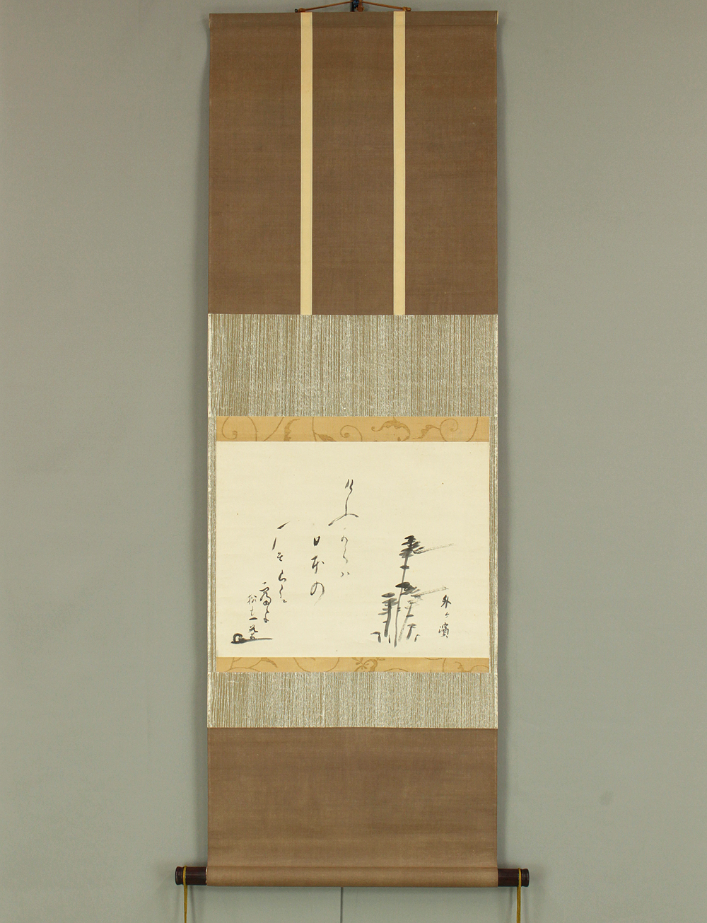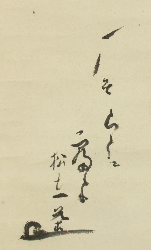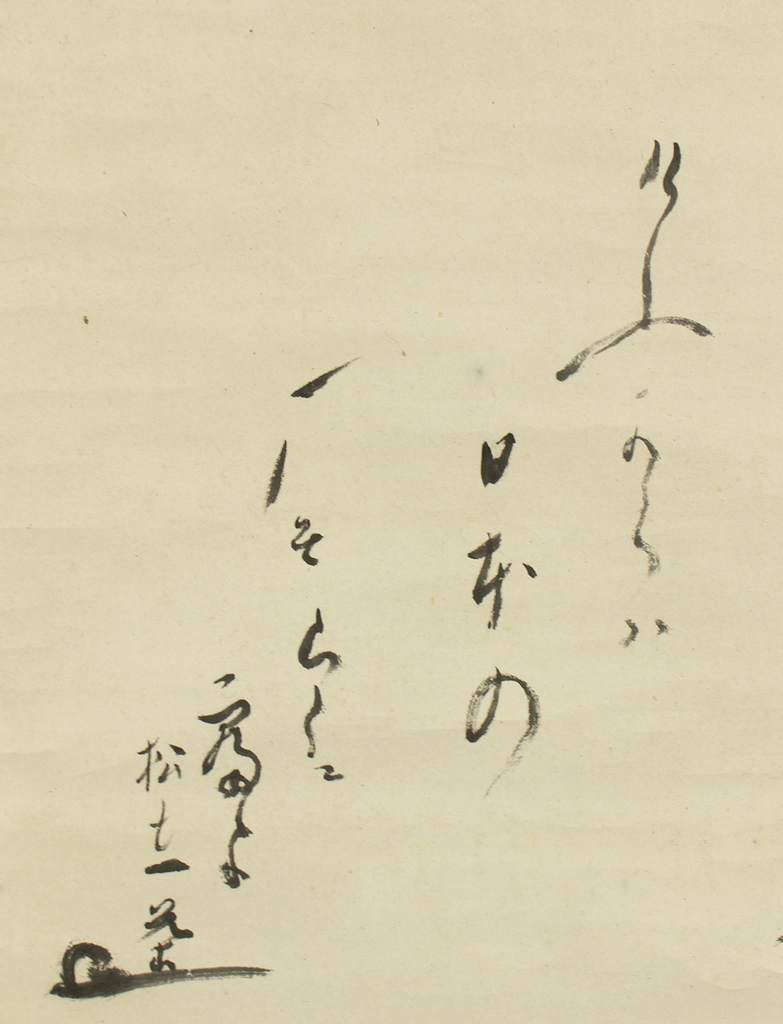 Together, the calligraphy and the painting create a graceful haiga composition in which poetry and brushwork merge to express both emotional gentleness and the understated beauty of the natural world. The scroll comes with a simple storage box and remains in good vintage condition, showing only minor signs of age typical of traditional Japanese hanging scrolls.