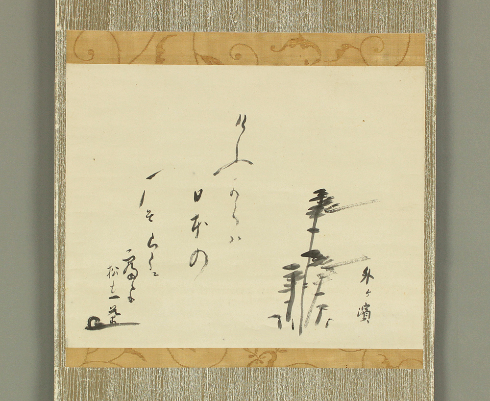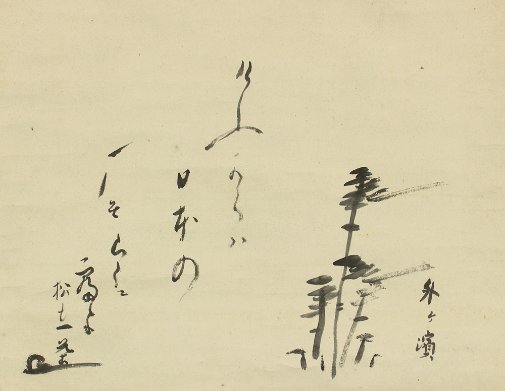 This Japanese hanging scroll beautifully brings together a gentle haiku attributed to Kobayashi Issa and an expressive ink painting of windswept pine trees. Beside the poem appears the inscription “Sotogahama” (外ヶ濱)—an old coastal place name in northern Japan, long known as a landscape where migrating geese arrive in autumn. This reference provides a clear sense of setting, evoking a quiet northern shoreline where sea wind, migrating birds, and slender pines create a serene and poetic atmosphere.