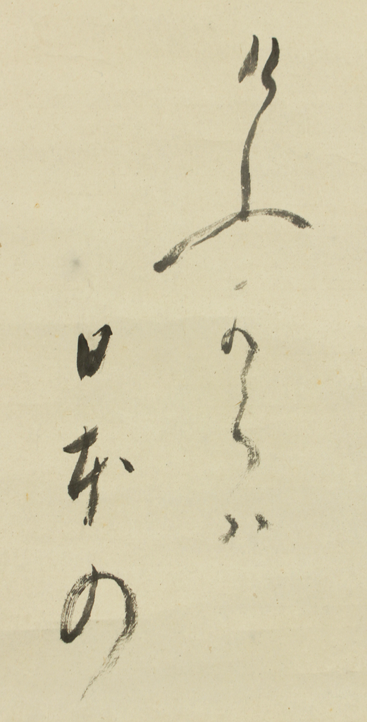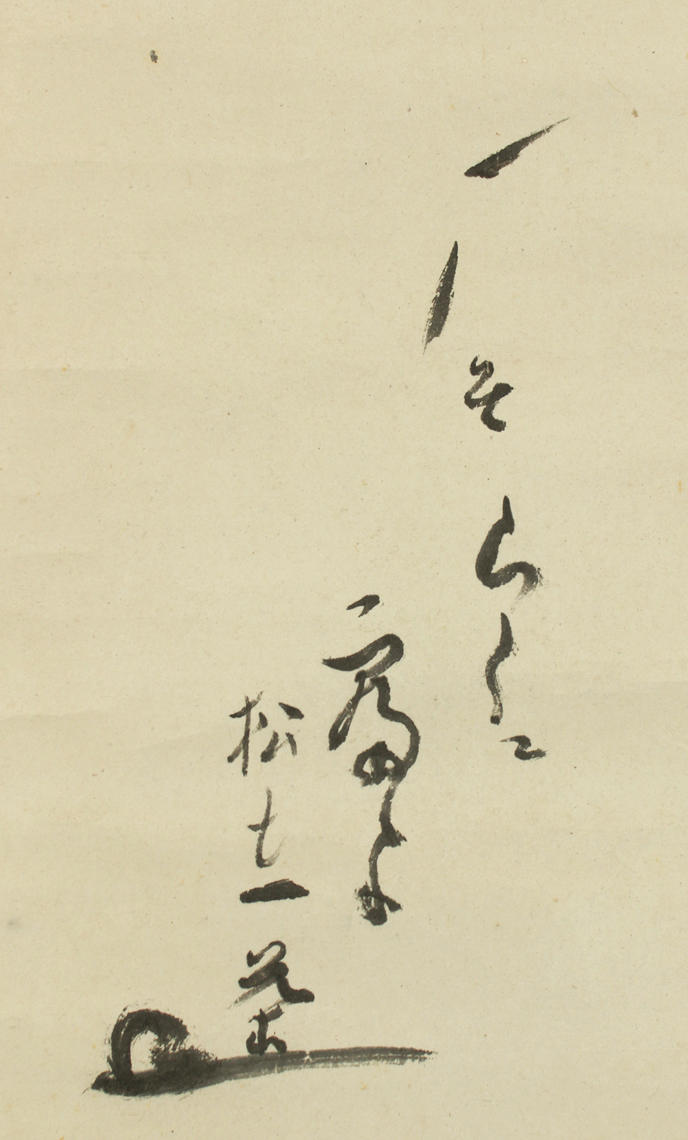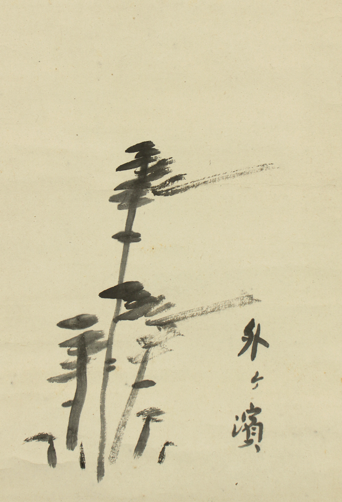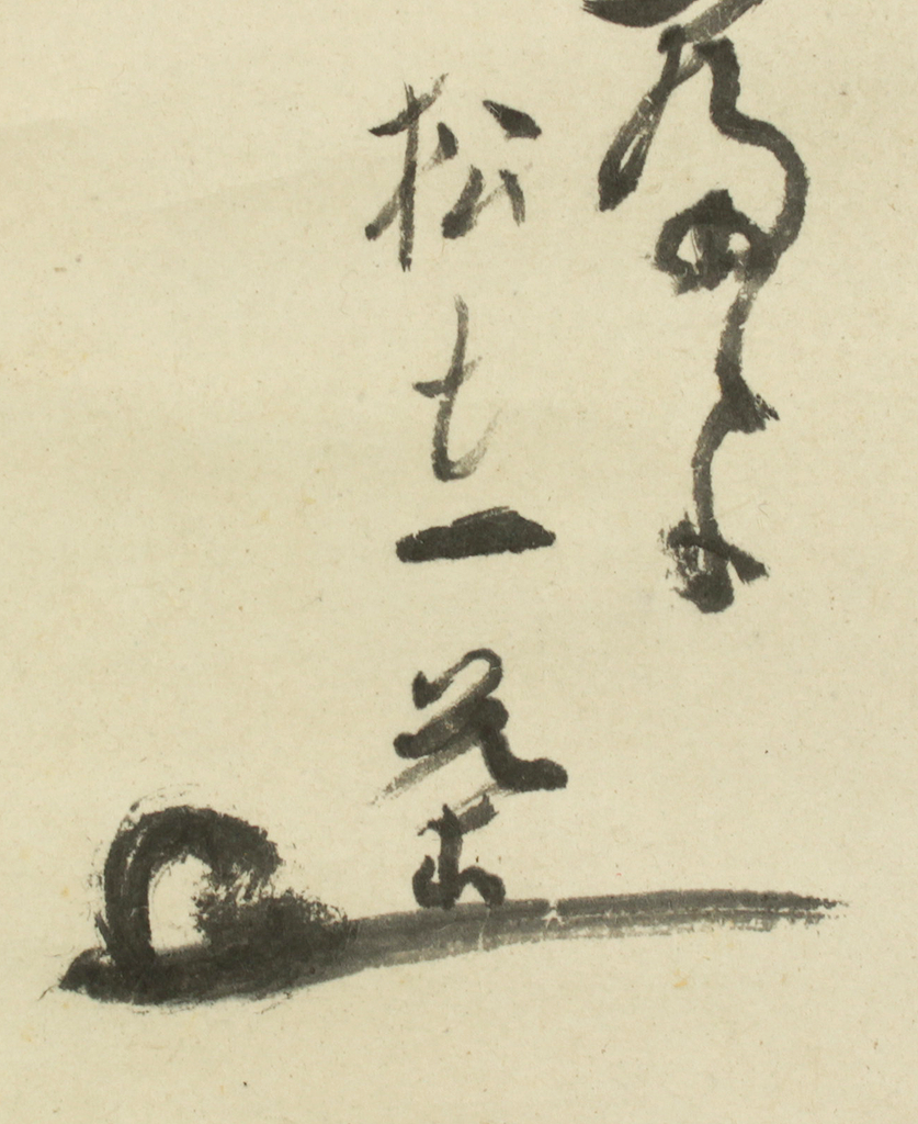 Issa’s characteristic warmth is fully present in this verse. He speaks with tenderness to the weary geese who have flown across the sea, inviting them to rest safely upon reaching Japan. The accompanying pine painting deepens this sense of calm. The slightly wind-bent forms of the trees suggest the rugged yet gentle coastline of Sotogahama, where nature’s quiet endurance harmonizes with the softness of the poet’s voice.