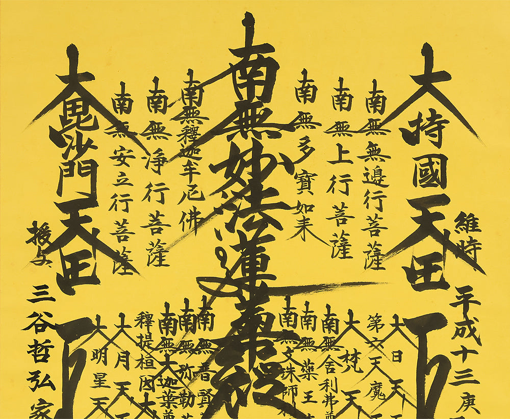This Nichiren Buddhist Gohonzon by Nichikyō, dated November 2001 (Heisei 13), presents a clear and dignified arrangement of sacred inscriptions central to Nichiren devotional practice. The characters are written with steady, confident brushwork, giving the mandala a sense of order and spiritual presence without unnecessary embellishment. Each element is positioned with traditional balance, allowing the viewer to feel the quiet authority and protective intention embedded in the text. The signature “Nichikyō” (日竟) affirms the calligrapher’s hand. Accompanied by its original box (Tomobako), the scroll is well preserved and suitable for long‑term display. When hung, it brings a composed, reverent atmosphere to the room, the mandala’s structure settling into the space like a calm center of focus.
