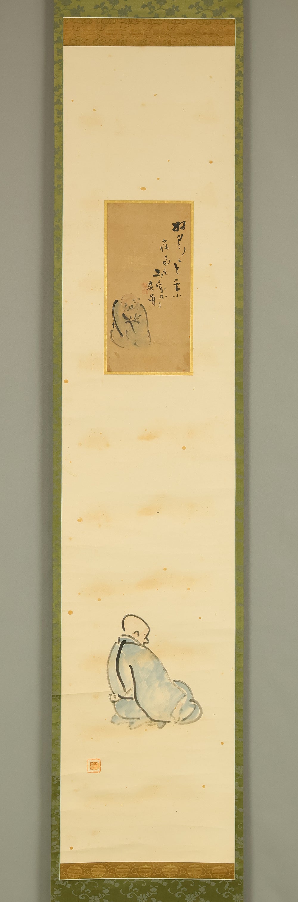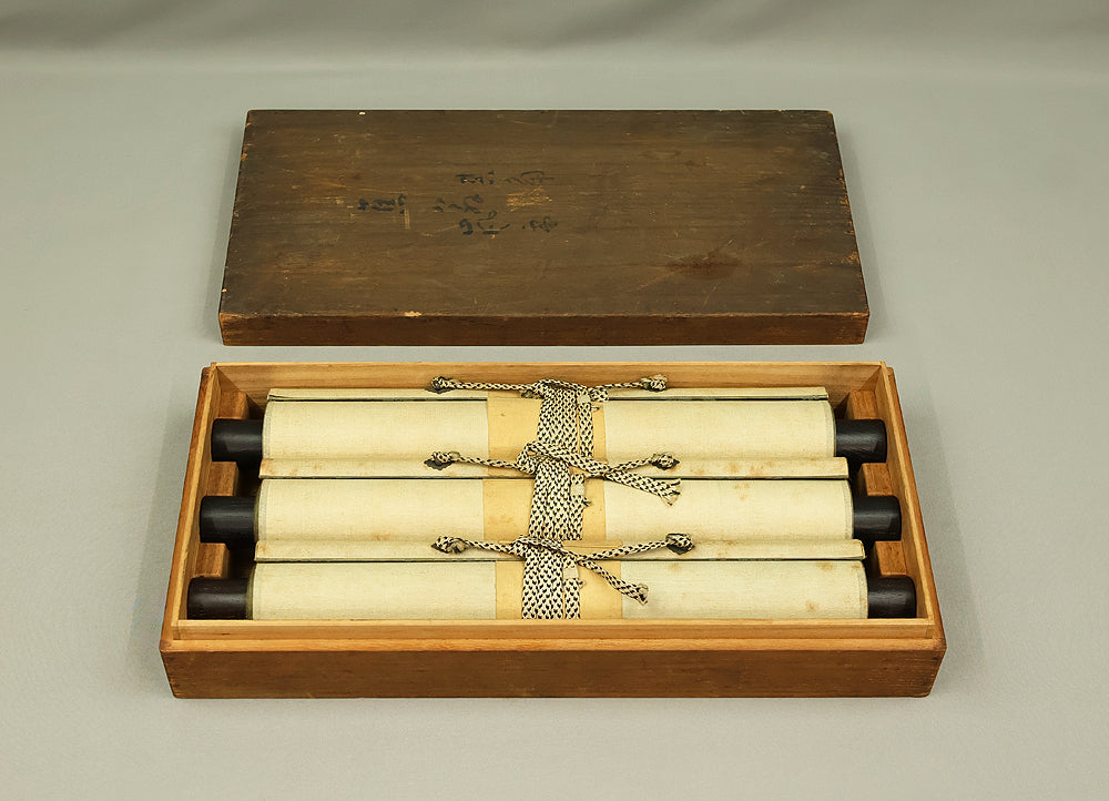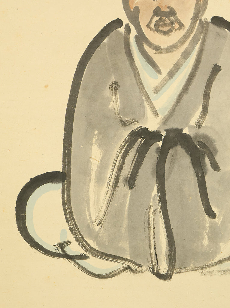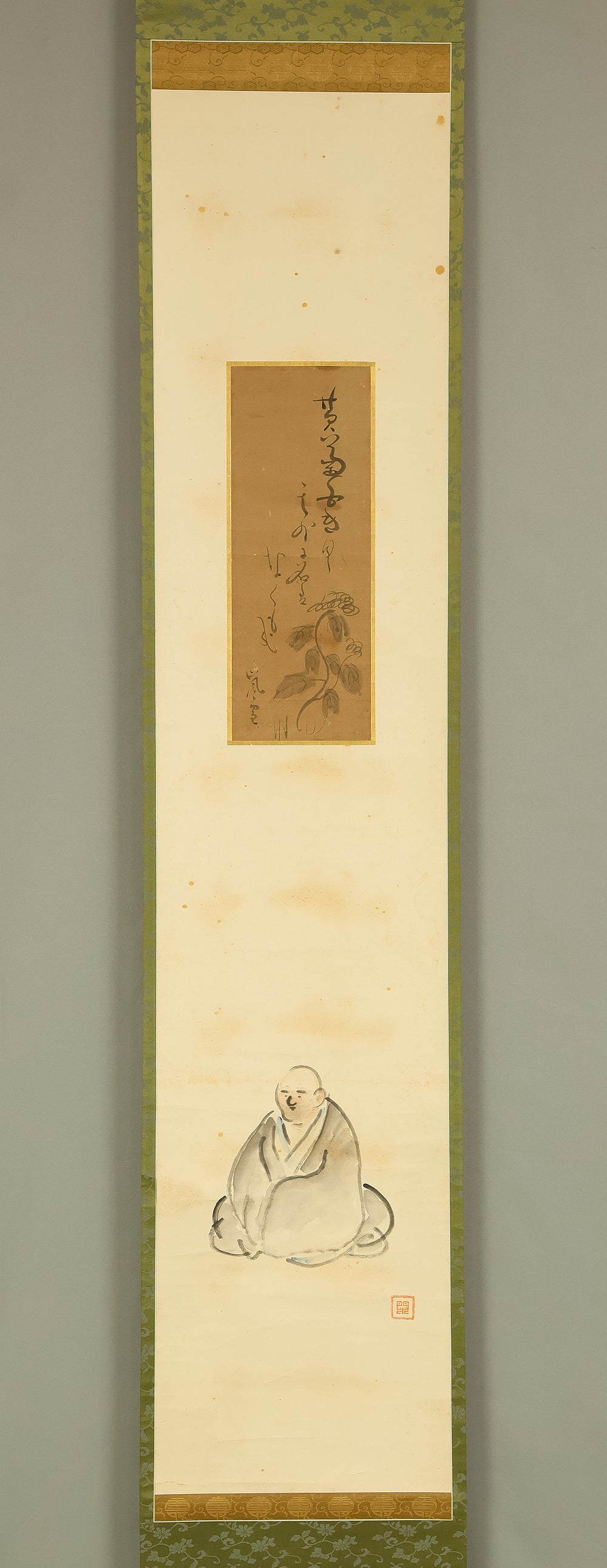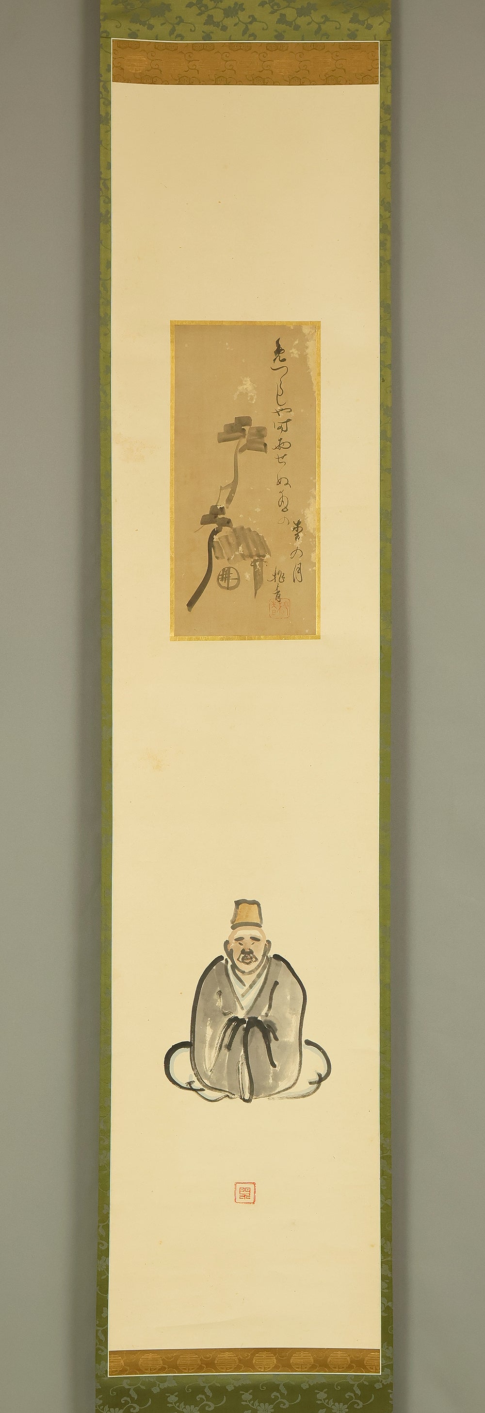 This is a rare and culturally significant set of three antique Japanese hanging scrolls (kakejiku), featuring collaborative works by three of the most celebrated haiku poets of the Edo period: Matsuo Bashō (1644–1694), Takarai Kikaku (1661–1707), and Hattori Ransetsu (1654–1707). Each scroll presents a poetic inscription (gasan) accompanied by a haiku attributed to the respective poet, rendered in expressive brushwork that reflects the literary and aesthetic sensibilities of early haikai tradition. Beneath each poem is a painted portrait of the poet, executed in a minimalist ink style. While the haiku and calligraphy are attributed to Bashō, Kikaku, and Ransetsu respectively, the portraits are unsigned and the artist remains unknown. The scrolls are mounted in traditional textile borders and preserved together in a shared original wooden box (tomobako), which enhances their historical coherence and value as a set. This ensemble offers a rare glimpse into the intersection of poetry, portraiture, and Edo-period literati culture. It is an exceptional acquisition for collectors of Japanese art, haiku literature, or antique calligraphy.