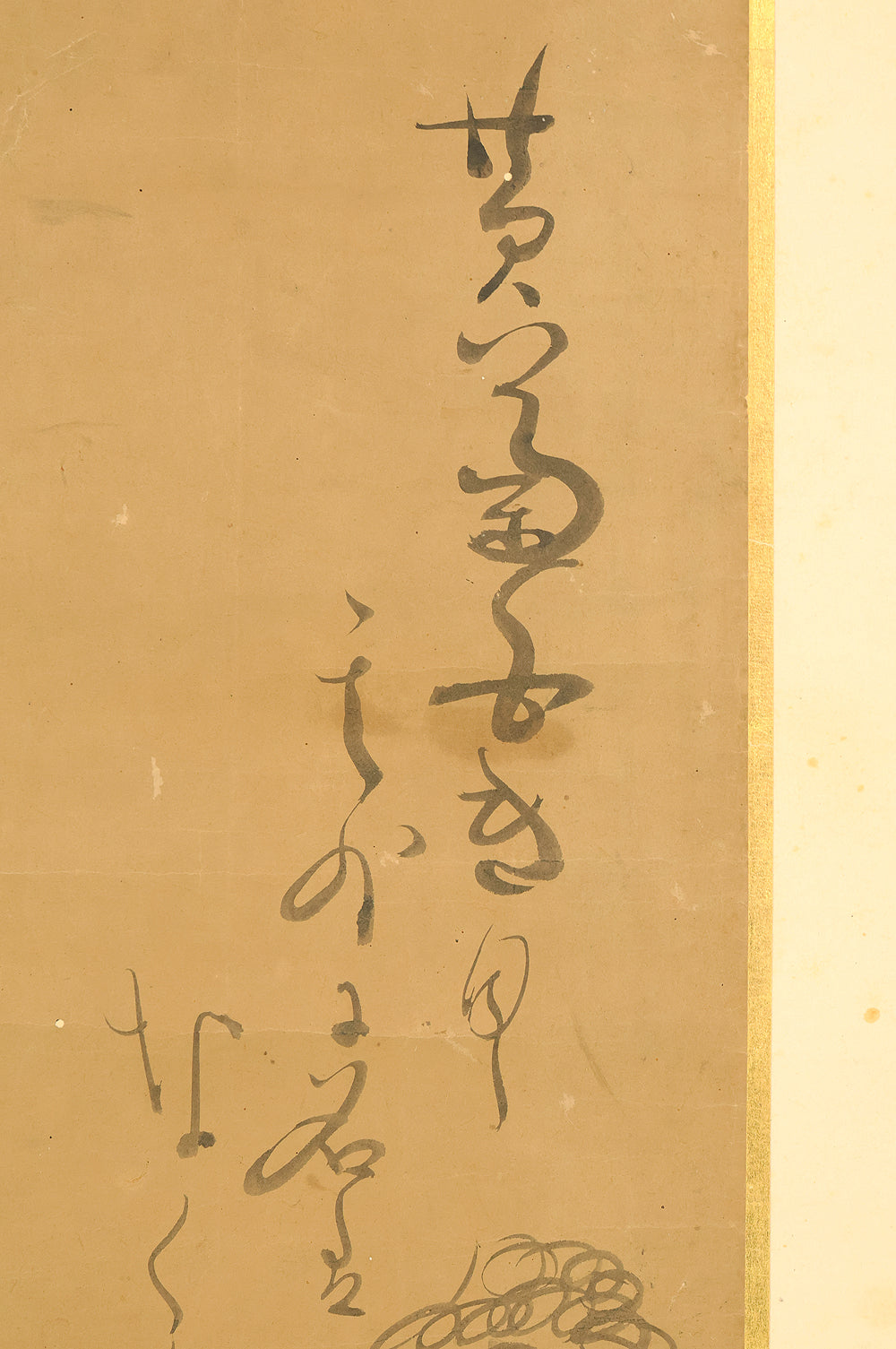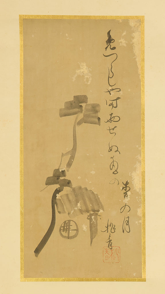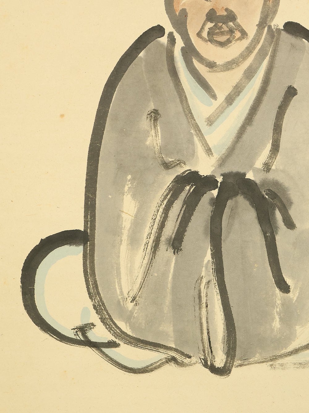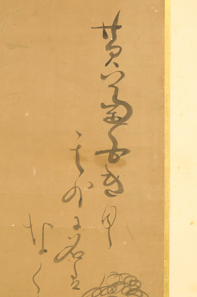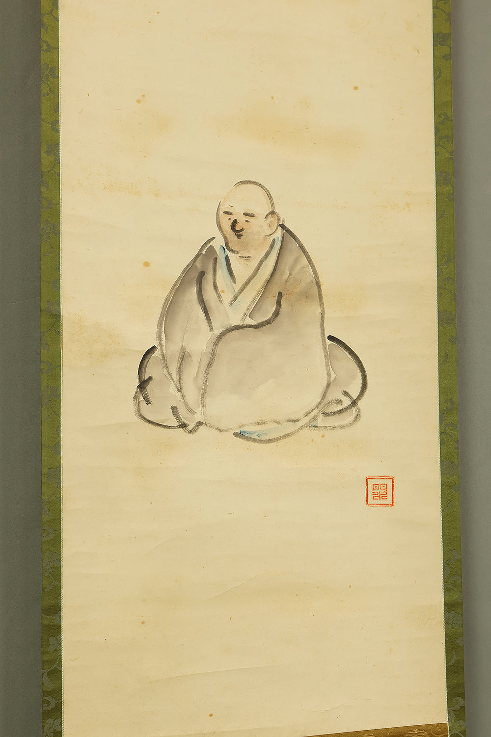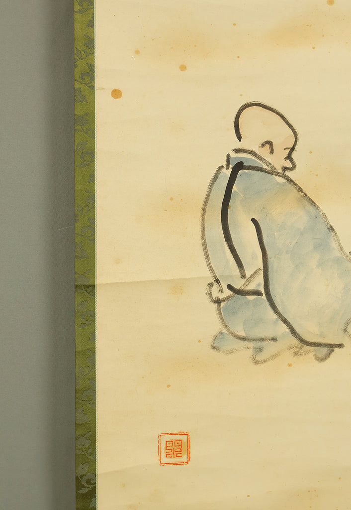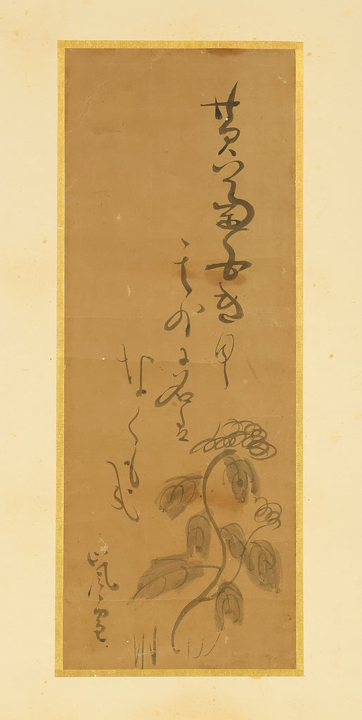 This is a rare and culturally significant set of three antique Japanese hanging scrolls (kakejiku), featuring collaborative works by three of the most celebrated haiku poets of the Edo period: Matsuo Bashō (1644–1694), Takarai Kikaku (1661–1707), and Hattori Ransetsu (1654–1707). Each scroll presents a poetic inscription (gasan) accompanied by a haiku attributed to the respective poet, rendered in expressive brushwork that reflects the literary and aesthetic sensibilities of early haikai tradition. Beneath each poem is a painted portrait of the poet, executed in a minimalist ink style. While the haiku and calligraphy are attributed to Bashō, Kikaku, and Ransetsu respectively, the portraits are unsigned and the artist remains unknown. The scrolls are mounted in traditional textile borders and preserved together in a shared original wooden box (tomobako), which enhances their historical coherence and value as a set. This ensemble offers a rare glimpse into the intersection of poetry, portraiture, and Edo-period literati culture. It is an exceptional acquisition for collectors of Japanese art, haiku literature, or antique calligraphy.