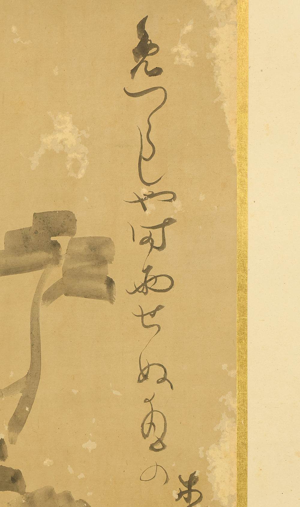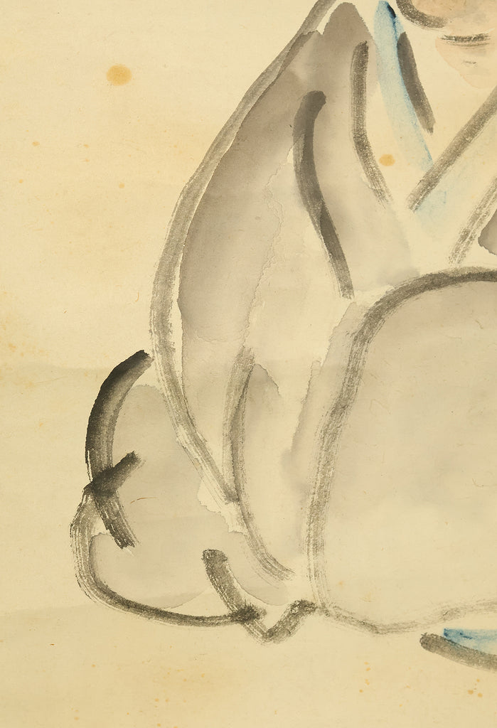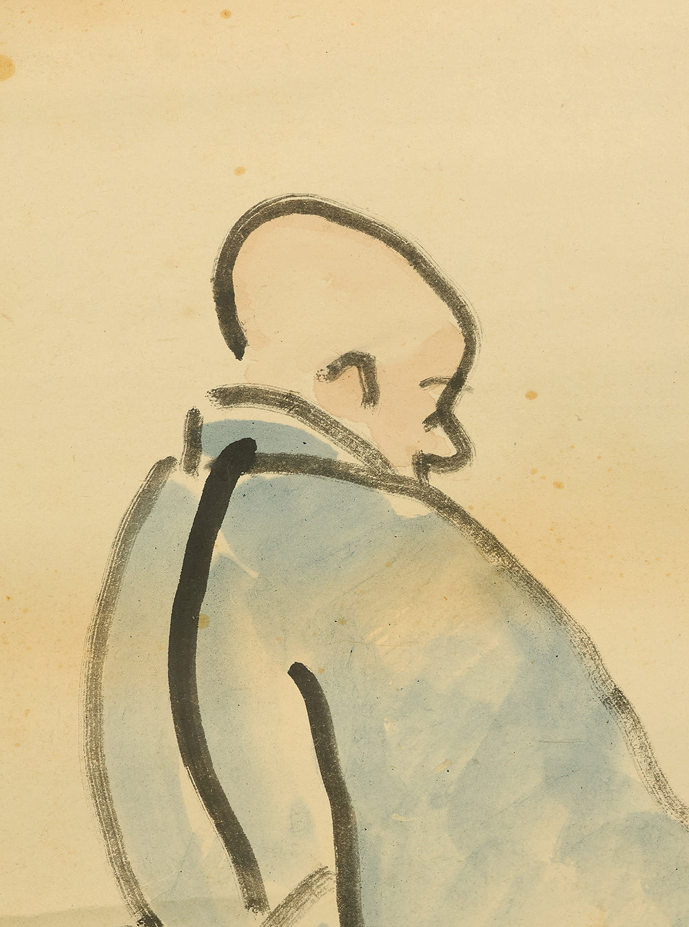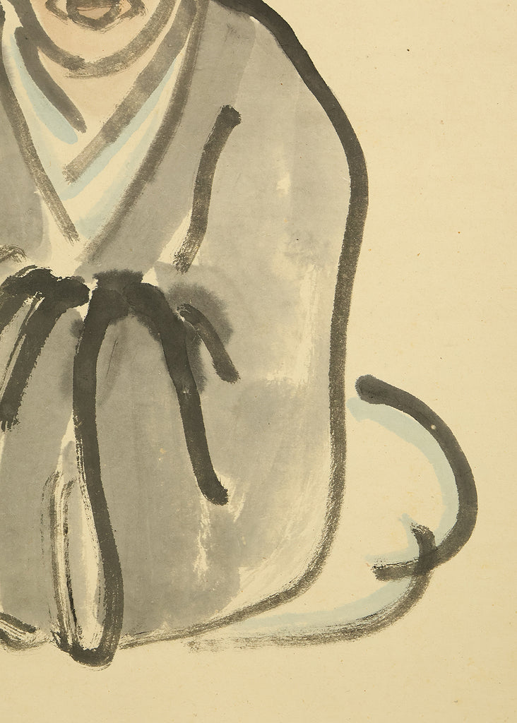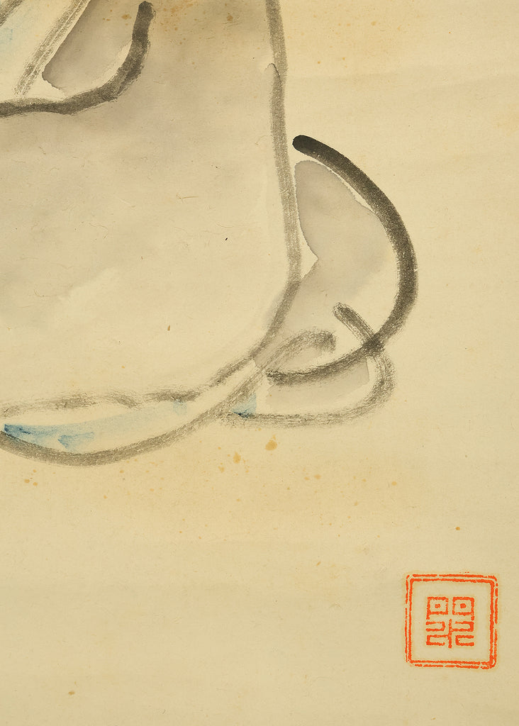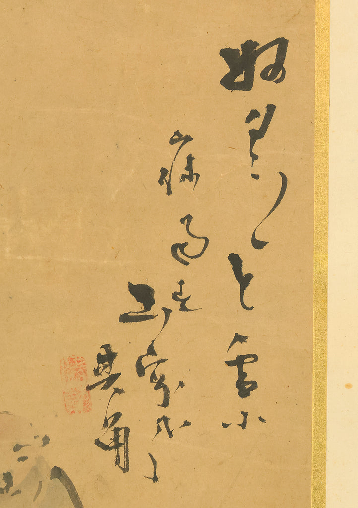 This is a rare and culturally significant set of three antique Japanese hanging scrolls (kakejiku), featuring collaborative works by three of the most celebrated haiku poets of the Edo period: Matsuo Bashō (1644–1694), Takarai Kikaku (1661–1707), and Hattori Ransetsu (1654–1707). Each scroll presents a poetic inscription (gasan) accompanied by a haiku attributed to the respective poet, rendered in expressive brushwork that reflects the literary and aesthetic sensibilities of early haikai tradition. Beneath each poem is a painted portrait of the poet, executed in a minimalist ink style. While the haiku and calligraphy are attributed to Bashō, Kikaku, and Ransetsu respectively, the portraits are unsigned and the artist remains unknown. The scrolls are mounted in traditional textile borders and preserved together in a shared original wooden box (tomobako), which enhances their historical coherence and value as a set. This ensemble offers a rare glimpse into the intersection of poetry, portraiture, and Edo-period literati culture. It is an exceptional acquisition for collectors of Japanese art, haiku literature, or antique calligraphy.