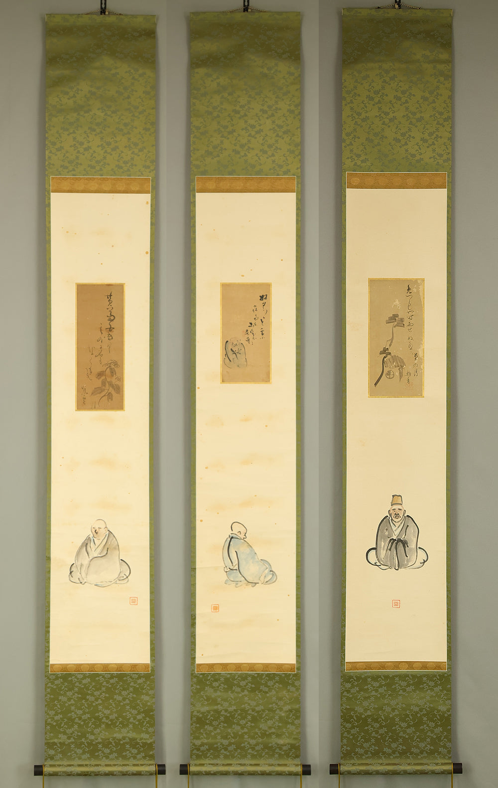 松尾芭蕉 Matsuo Basho (1644-1694), 宝井其角 Takarai Kikaku (1661-1707), 服部嵐雪 Hattori Ransetsu (1654-1707) Japanese antique art a set of three kakejiku kakemono wall hanging scrolls / Collaborative work Haiku Poem and Portraiture with Original Box (Tomobako) RD928