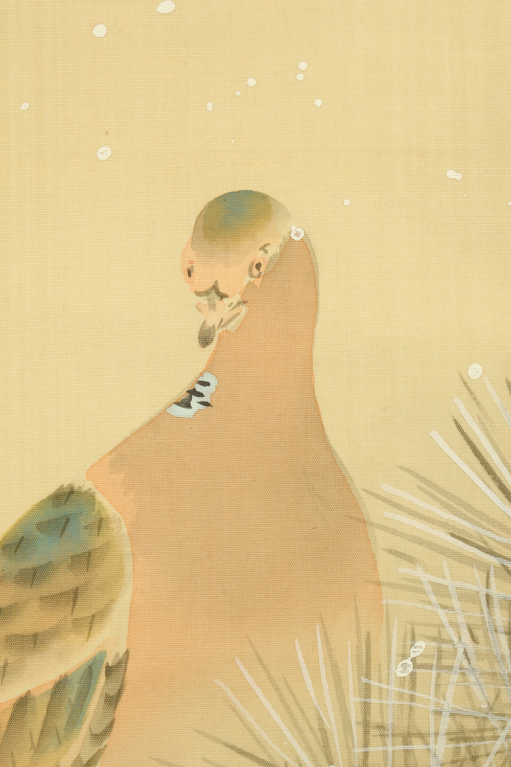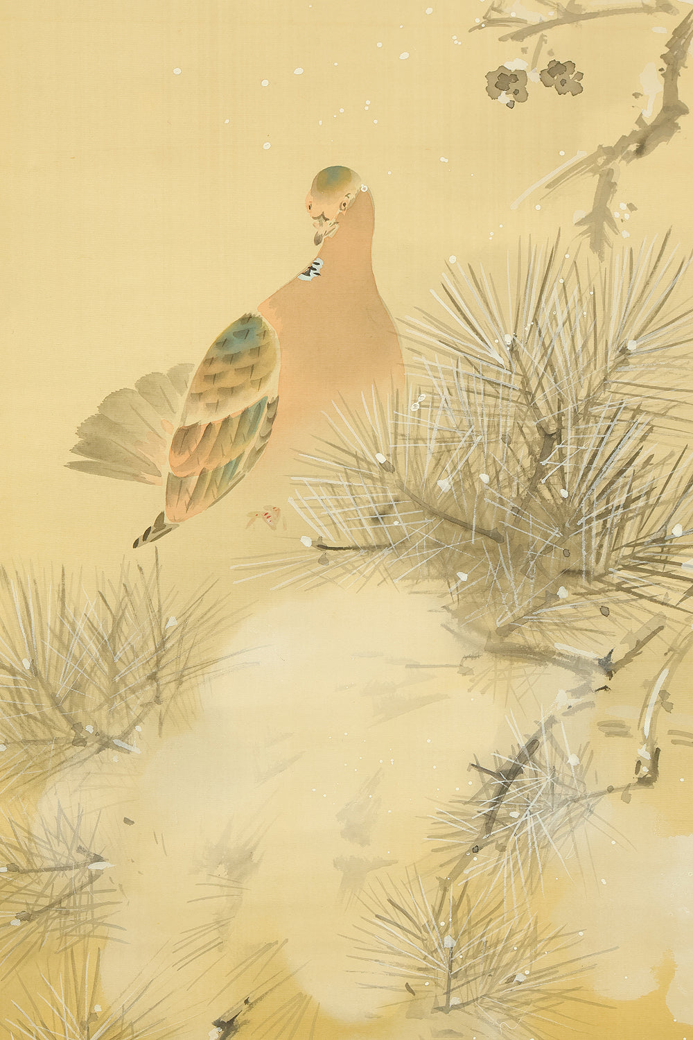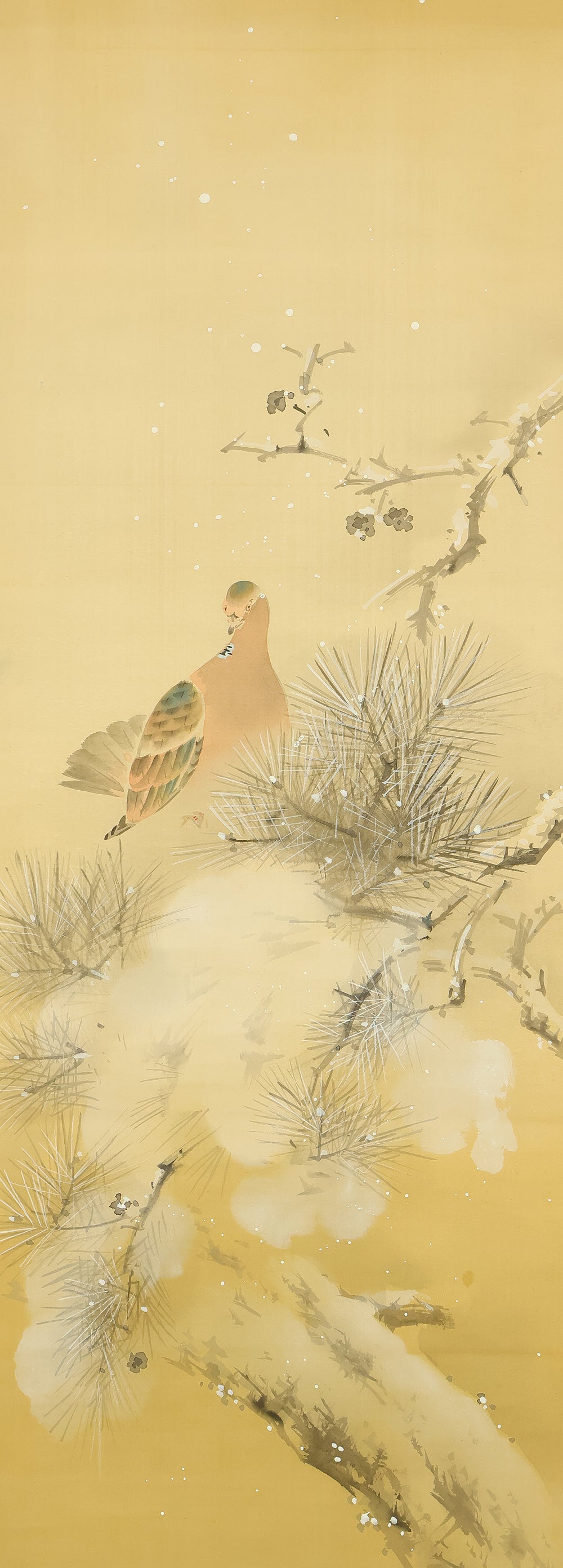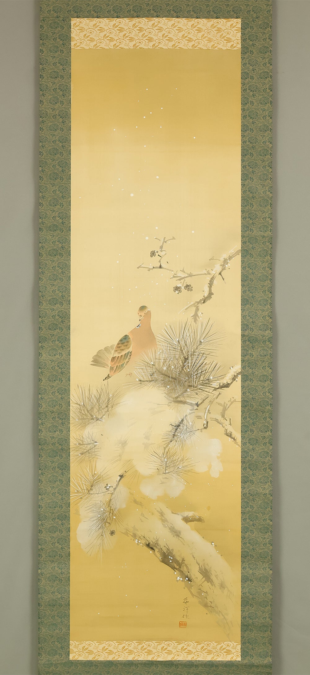 A serene winter scene by Shibahara Kisho (1885–1954), a noted Japanese painter associated with the Kyoto and Osaka art circles. This hanging scroll presents a pigeon quietly perched on a snow-laden pine branch, rendered with Kisho’s characteristic delicacy and atmospheric brushwork. The warm yellow silk ground contrasts beautifully with the cool tones of snow and pine needles, enhancing the soft, poetic mood of a calm winter day. Kisho’s refined use of color and restrained composition highlight the dignity of the bird and the quiet resilience of nature. Subtle speckles of falling snow animate the otherwise tranquil scene, demonstrating the painter’s sensitivity to seasonal expression—an essential theme in traditional Japanese art. The scroll comes with its original wooden box (tomobako), inscribed and signed by the artist, further confirming the work’s authenticity and provenance. A fine example of early 20th-century Japanese Nihonga painting, suitable for collectors who appreciate elegance, atmosphere, and seasonal beauty.