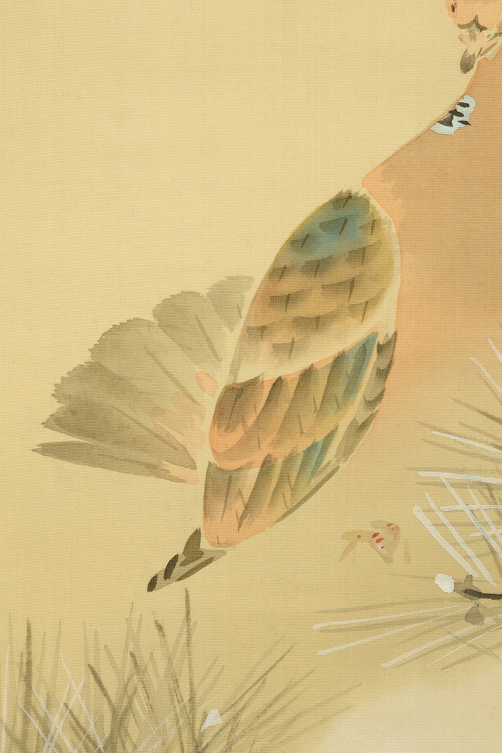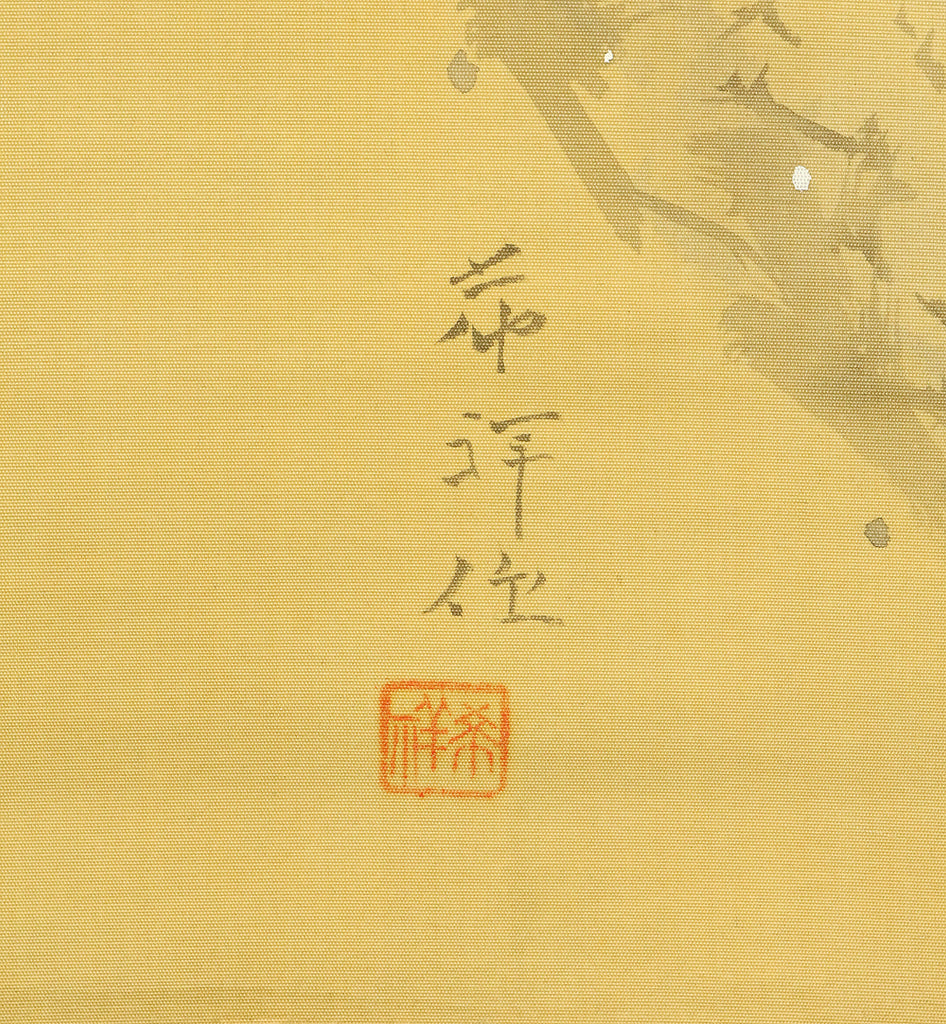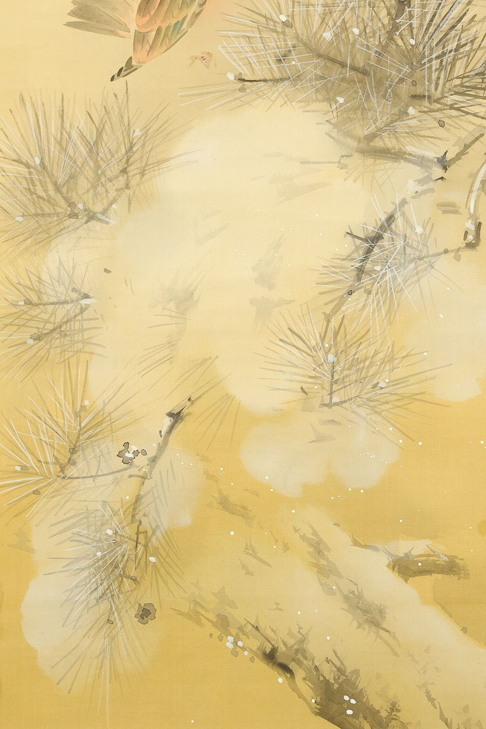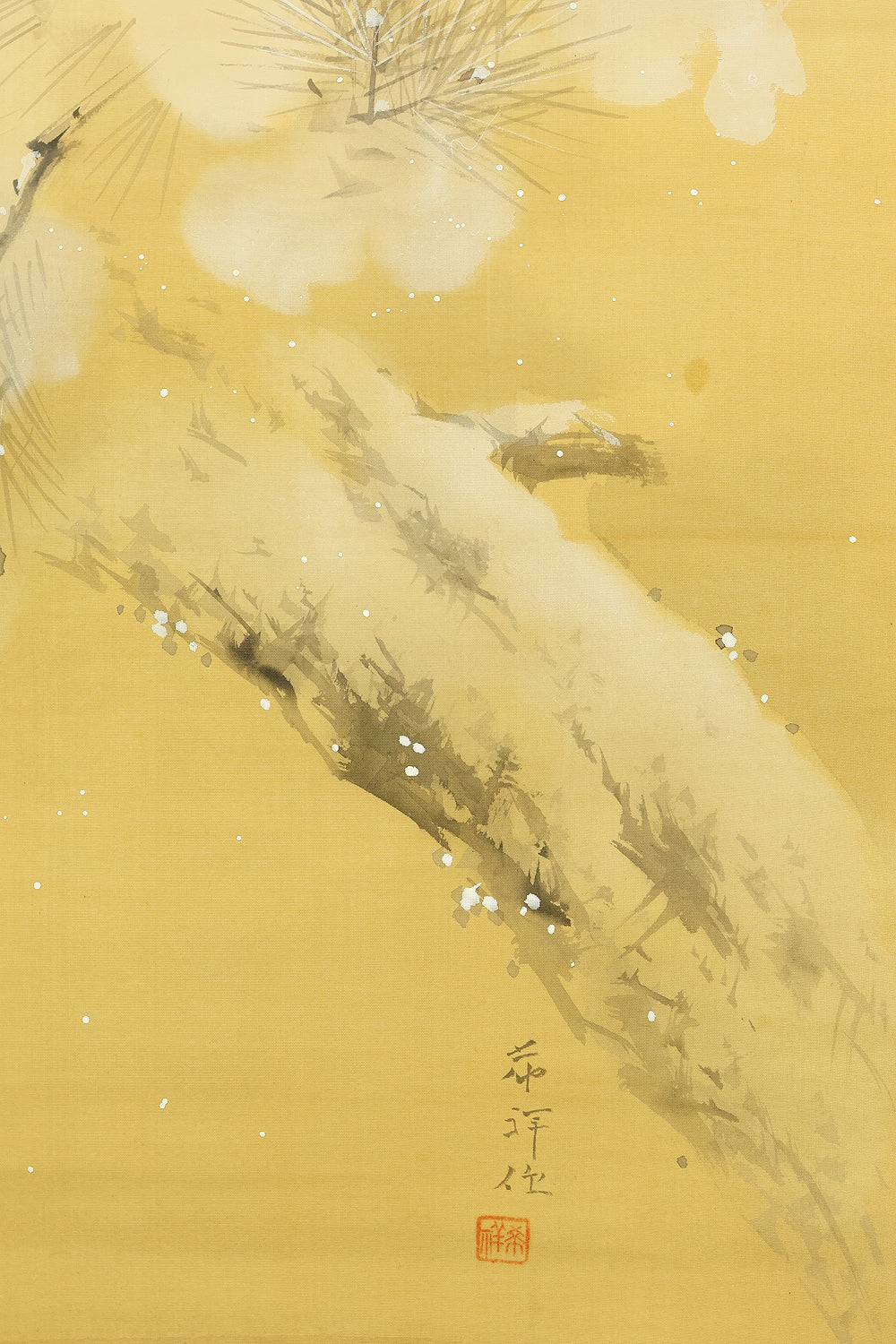 A serene winter scene by Shibahara Kisho (1885–1954), a noted Japanese painter associated with the Kyoto and Osaka art circles. This hanging scroll presents a pigeon quietly perched on a snow-laden pine branch, rendered with Kisho’s characteristic delicacy and atmospheric brushwork. The warm yellow silk ground contrasts beautifully with the cool tones of snow and pine needles, enhancing the soft, poetic mood of a calm winter day. Kisho’s refined use of color and restrained composition highlight the dignity of the bird and the quiet resilience of nature. Subtle speckles of falling snow animate the otherwise tranquil scene, demonstrating the painter’s sensitivity to seasonal expression—an essential theme in traditional Japanese art. The scroll comes with its original wooden box (tomobako), inscribed and signed by the artist, further confirming the work’s authenticity and provenance. A fine example of early 20th-century Japanese Nihonga painting, suitable for collectors who appreciate elegance, atmosphere, and seasonal beauty.
