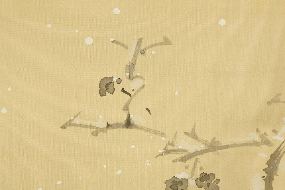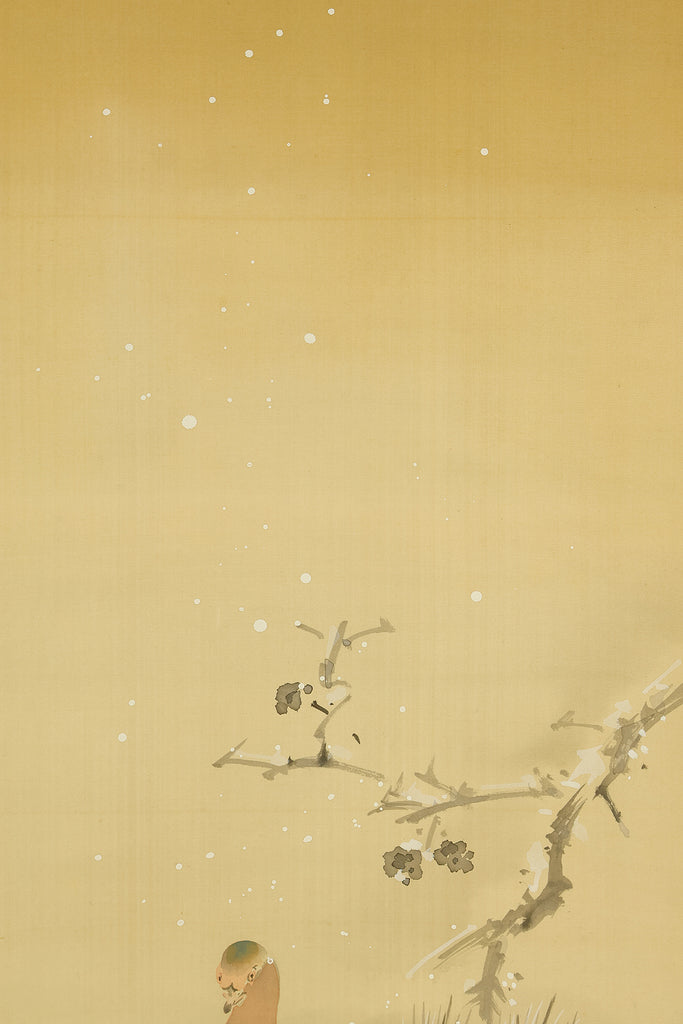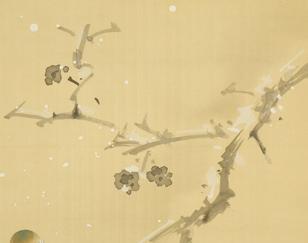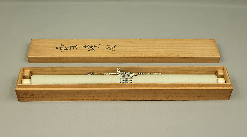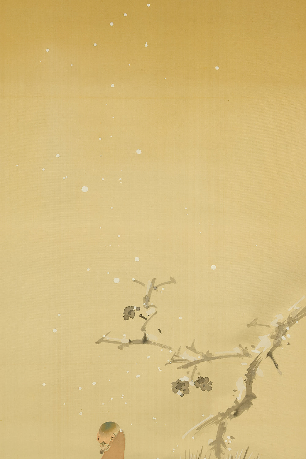A serene winter scene by Shibahara Kisho (1885–1954), a noted Japanese painter associated with the Kyoto and Osaka art circles. This hanging scroll presents a pigeon quietly perched on a snow-laden pine branch, rendered with Kisho’s characteristic delicacy and atmospheric brushwork. The warm yellow silk ground contrasts beautifully with the cool tones of snow and pine needles, enhancing the soft, poetic mood of a calm winter day. Kisho’s refined use of color and restrained composition highlight the dignity of the bird and the quiet resilience of nature. Subtle speckles of falling snow animate the otherwise tranquil scene, demonstrating the painter’s sensitivity to seasonal expression—an essential theme in traditional Japanese art. The scroll comes with its original wooden box (tomobako), inscribed and signed by the artist, further confirming the work’s authenticity and provenance. A fine example of early 20th-century Japanese Nihonga painting, suitable for collectors who appreciate elegance, atmosphere, and seasonal beauty.