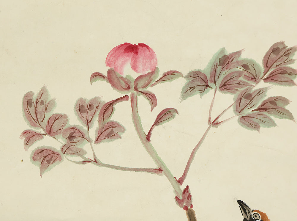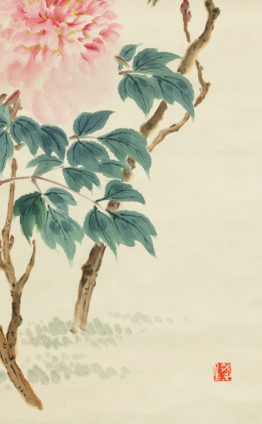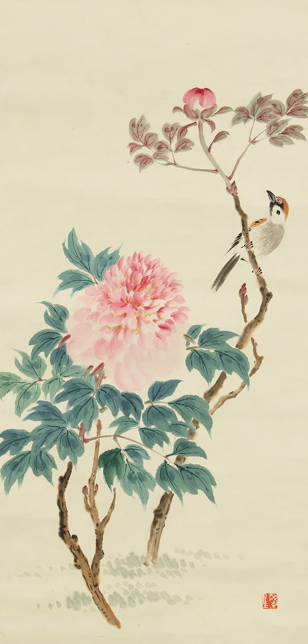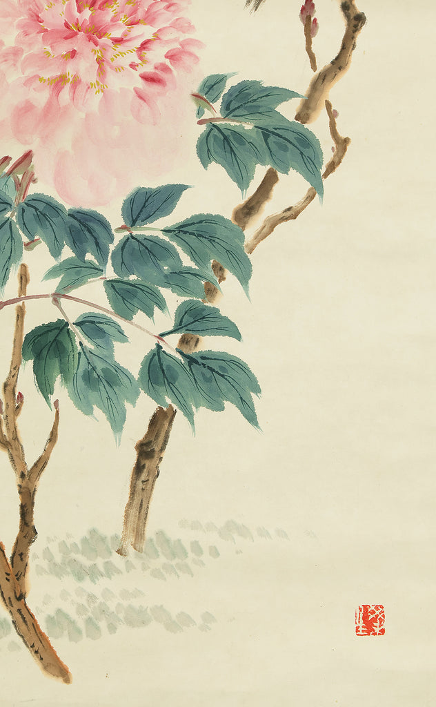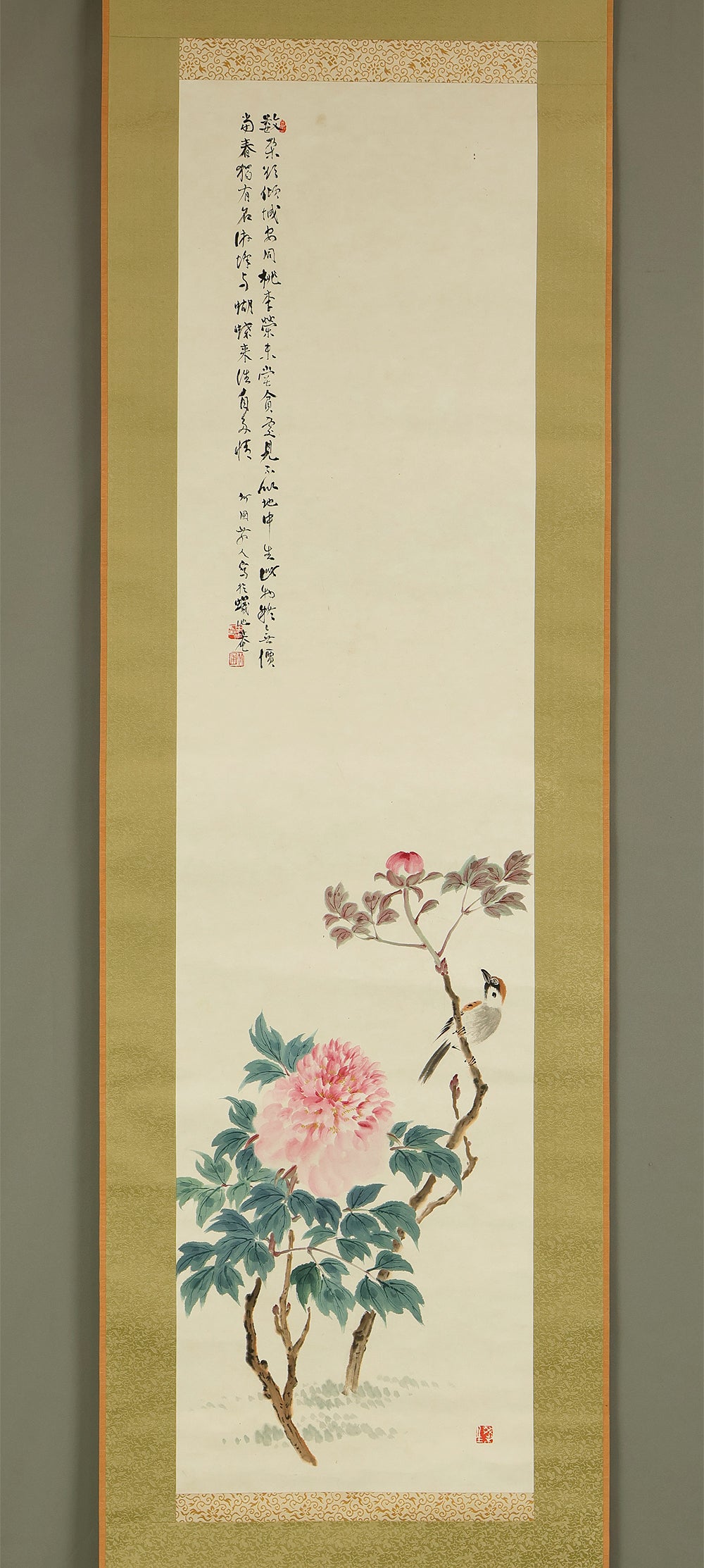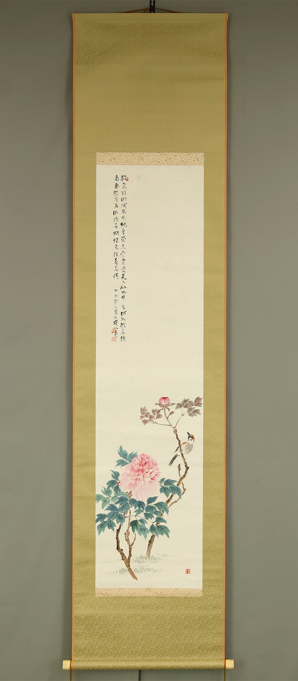 This elegant hanging scroll by Mizuta Chikuho (1883–1958) depicts a vibrant arrangement of peonies and sparrows, a classic theme in Japanese bird-and-flower painting. Chikuho was known for his refined brush technique and delicate color sense, both of which are beautifully expressed in this work. The large peony bloom is rendered with soft, layered pink tones, while the surrounding leaves show subtle variations of green and blue. A sparrow perched on the branch adds a lively and graceful presence to the composition. The accompanying calligraphy balances the image and enhances the scroll’s poetic atmosphere. Chikuho’s signature and seals are clearly visible, confirming the work as an authentic example of his style during the mid-Shōwa period. This piece comes with its original double storage box (tomobako and outer protective box), both bearing inscriptions that provide provenance and indicate careful preservation by its previous owner. The mounting shows minor age-related wear, while the painting surface remains clean and well preserved with bright, fresh colors. Overall, this is a refined and charming example of modern Japanese kachōga, combining technical finesse with a gentle, classical elegance.