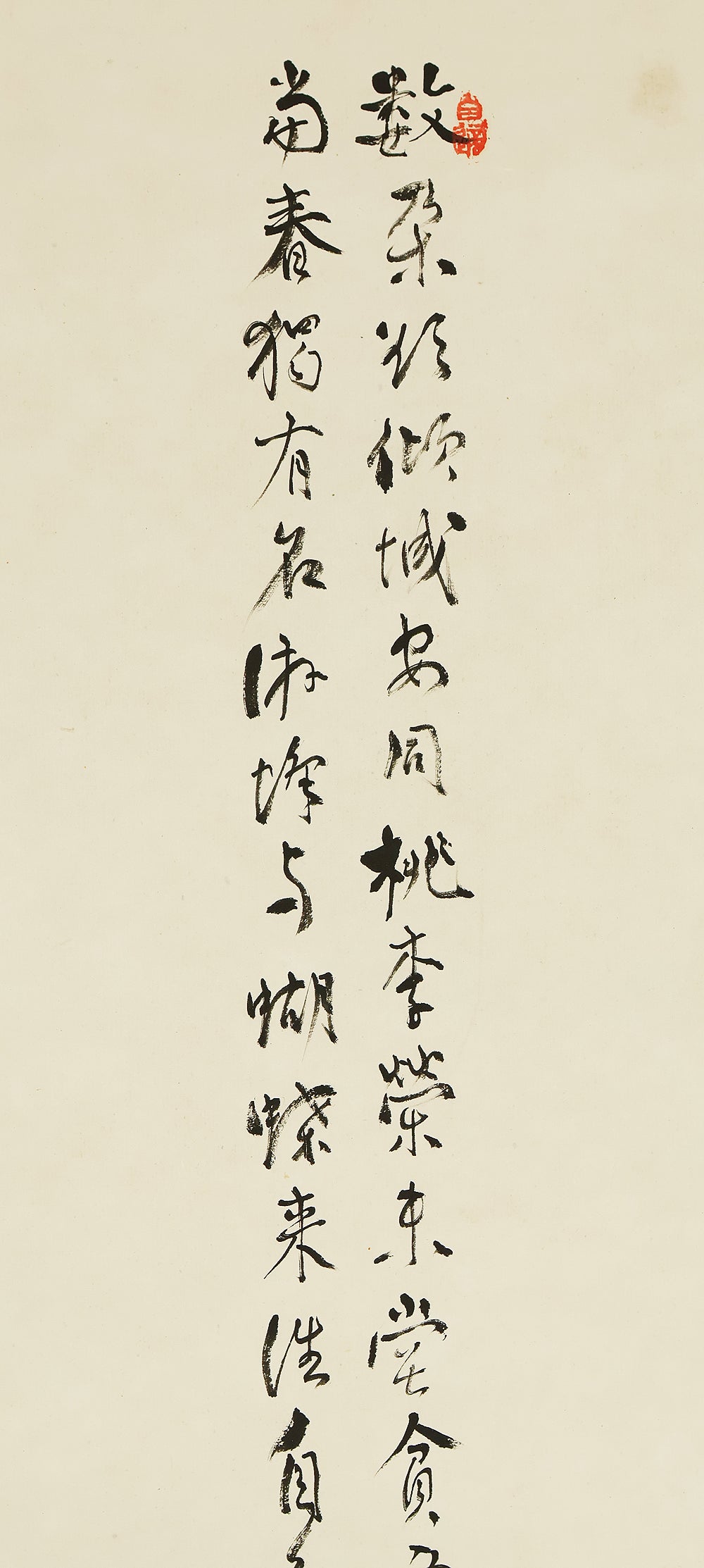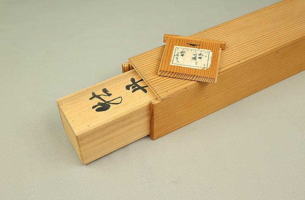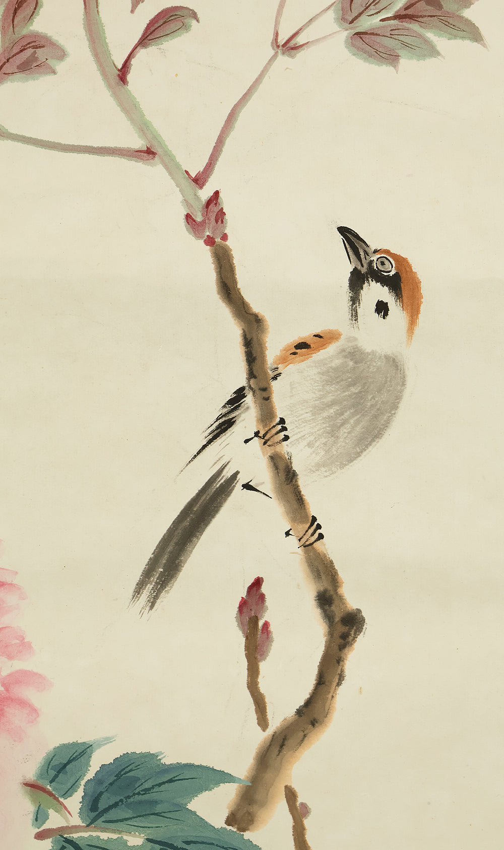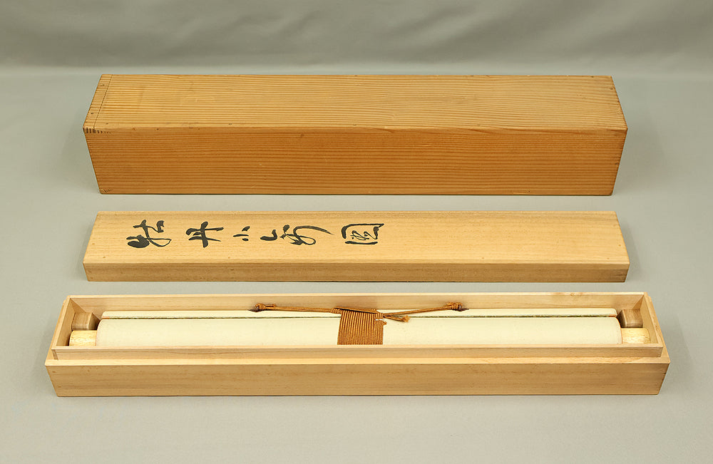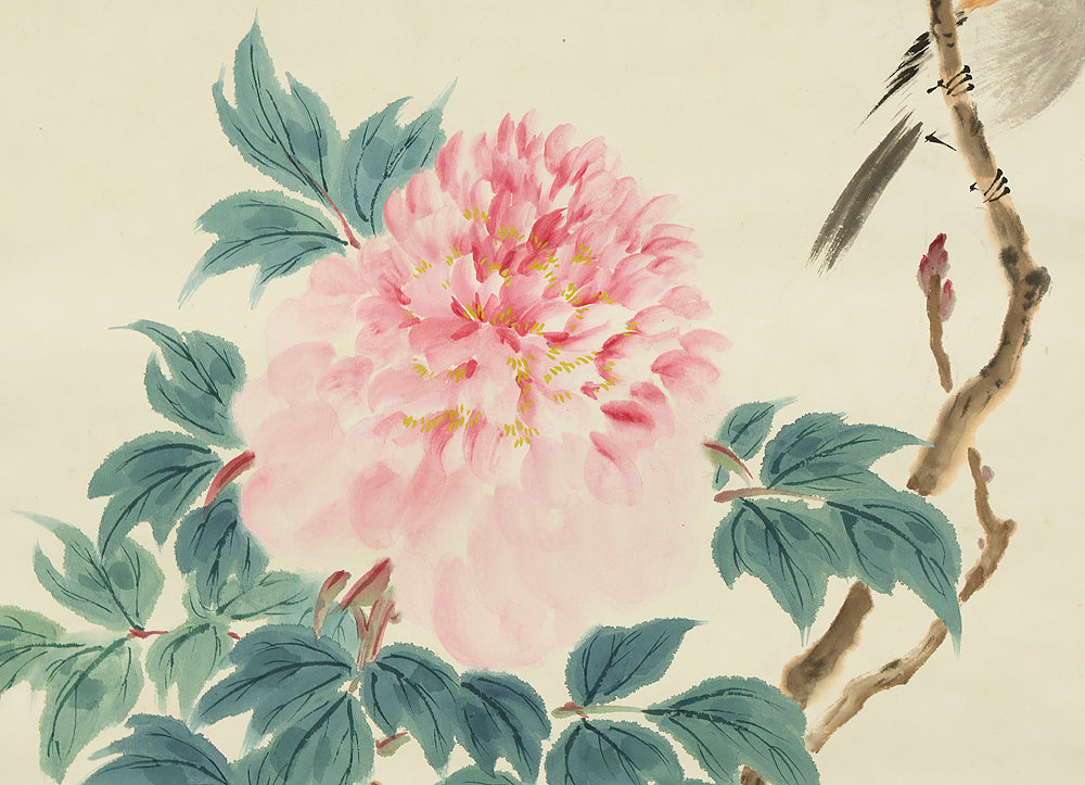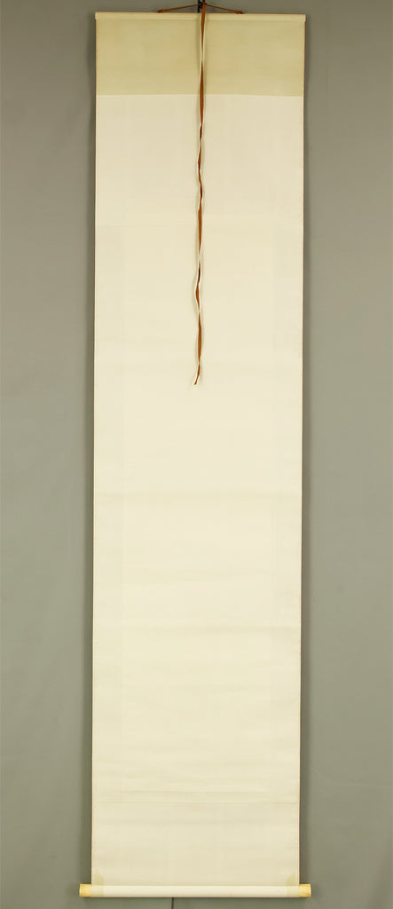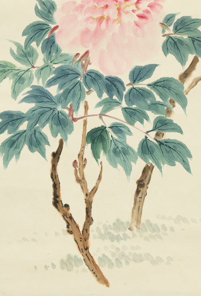 This elegant hanging scroll by Mizuta Chikuho (1883–1958) depicts a vibrant arrangement of peonies and sparrows, a classic theme in Japanese bird-and-flower painting. Chikuho was known for his refined brush technique and delicate color sense, both of which are beautifully expressed in this work. The large peony bloom is rendered with soft, layered pink tones, while the surrounding leaves show subtle variations of green and blue. A sparrow perched on the branch adds a lively and graceful presence to the composition. The accompanying calligraphy balances the image and enhances the scroll’s poetic atmosphere. Chikuho’s signature and seals are clearly visible, confirming the work as an authentic example of his style during the mid-Shōwa period. This piece comes with its original double storage box (tomobako and outer protective box), both bearing inscriptions that provide provenance and indicate careful preservation by its previous owner. The mounting shows minor age-related wear, while the painting surface remains clean and well preserved with bright, fresh colors. Overall, this is a refined and charming example of modern Japanese kachōga, combining technical finesse with a gentle, classical elegance.