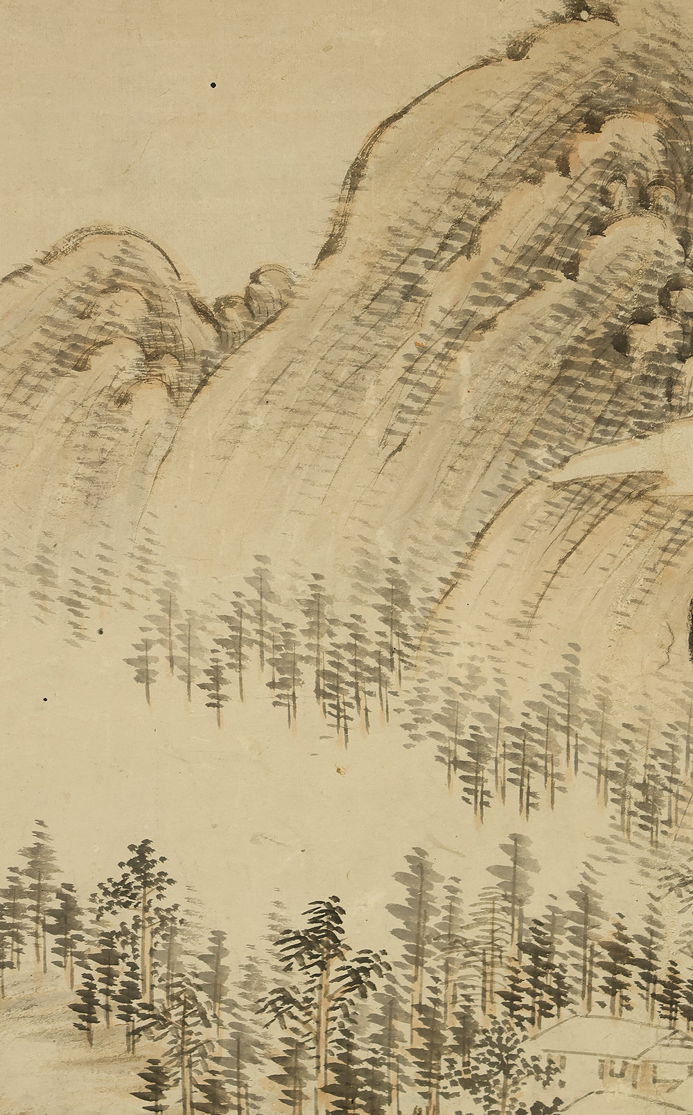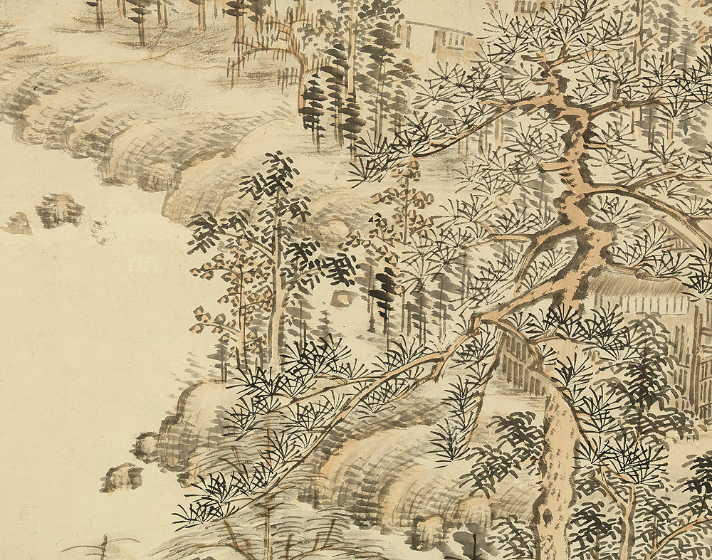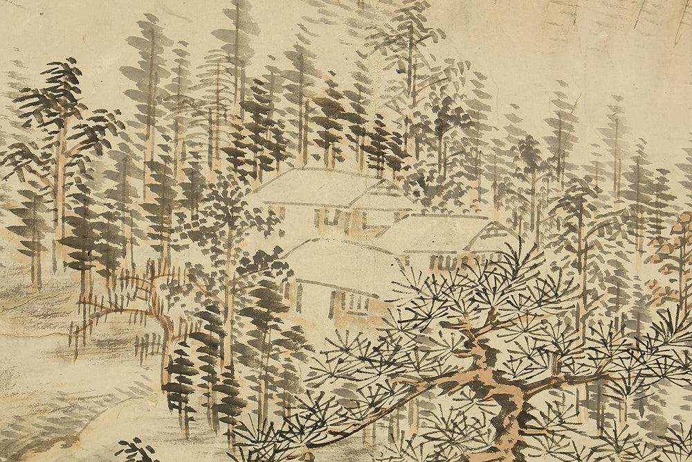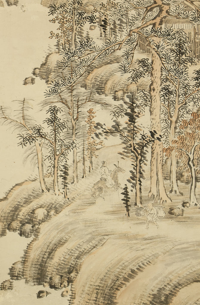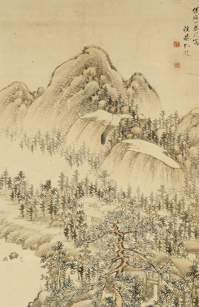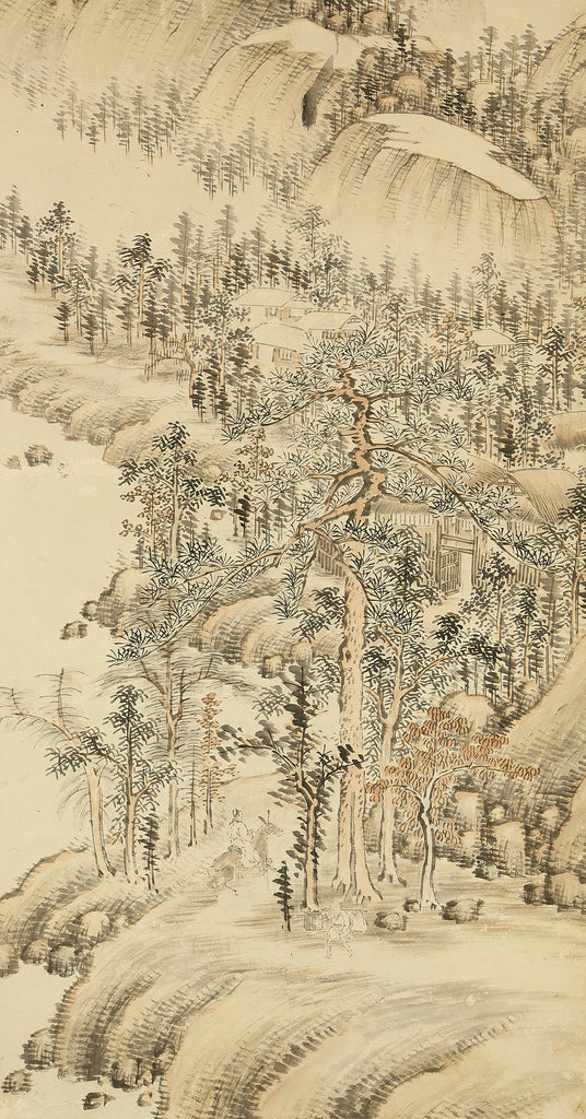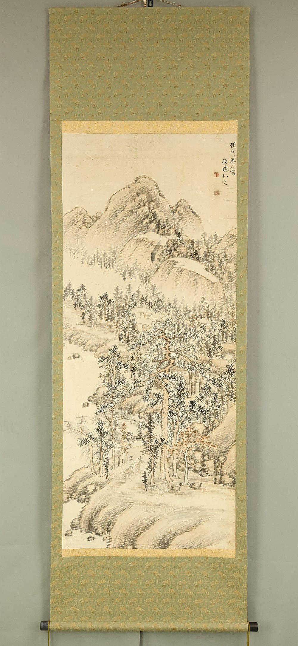 This finely detailed hanging scroll presents a tranquil sansui (mountain-water) landscape by Uragami Shunkin (1779–1846), a prominent literati painter and calligrapher of the late Edo period. A leading figure in the Nanga (Southern School) tradition, Shunkin was deeply influenced by Chinese literati ideals and known for his poetic sensitivity and refined brushwork. The composition depicts a riverside village nestled among pine trees and forested hills, with distant mountains rising in mist. Executed with exceptional precision and subtle tonal gradation, the painting reflects Shunkin’s mastery of ink landscape and his philosophical engagement with nature. In East Asian aesthetics, sansui landscapes are not merely scenic depictions — they embody contemplative ideals, solitude, and harmony between humanity and the natural world. The pine tree, a symbol of resilience and longevity, anchors the scene with quiet dignity.