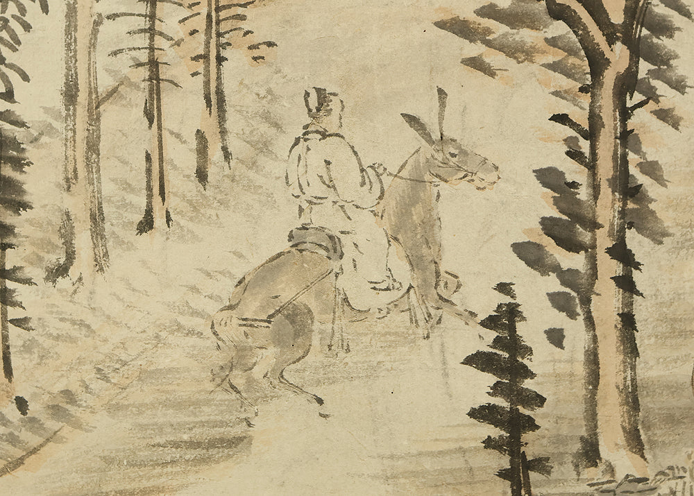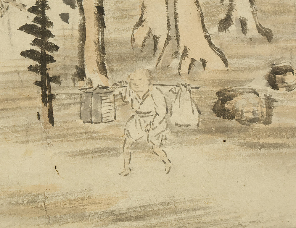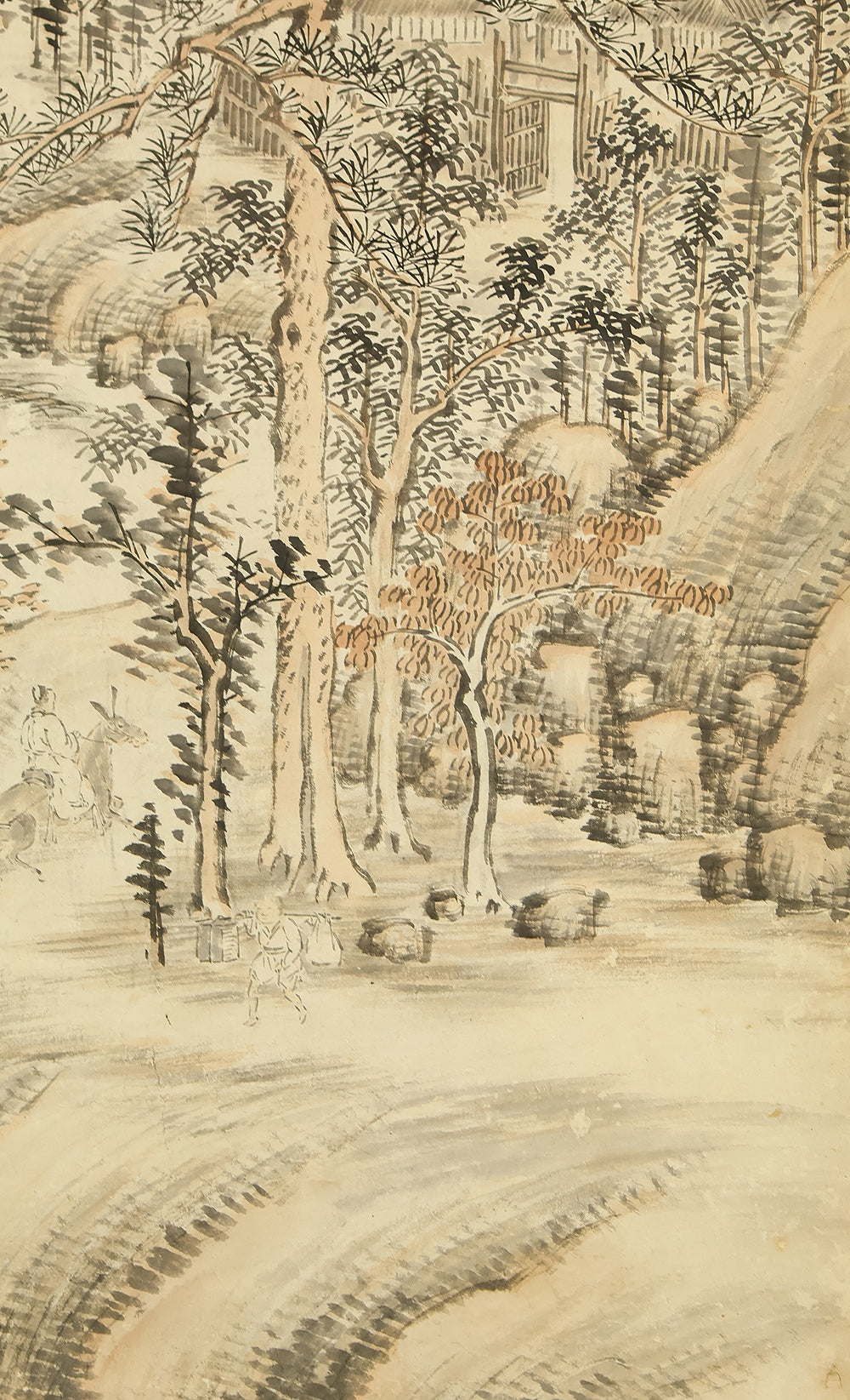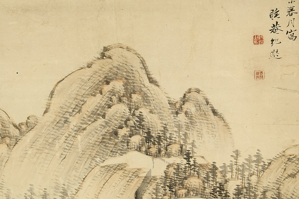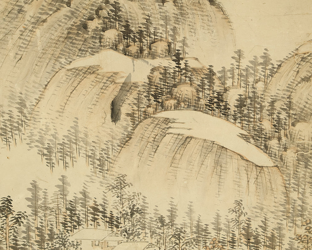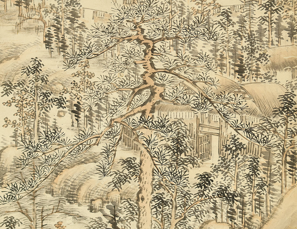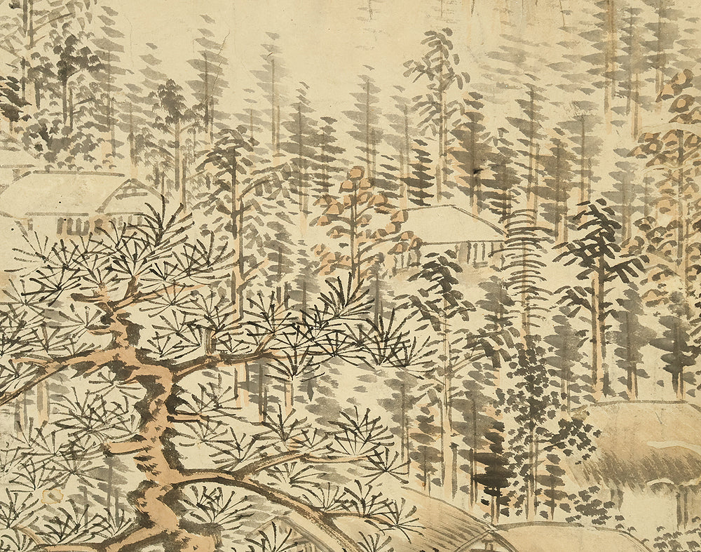This finely detailed hanging scroll presents a tranquil sansui (mountain-water) landscape by Uragami Shunkin (1779–1846), a prominent literati painter and calligrapher of the late Edo period. A leading figure in the Nanga (Southern School) tradition, Shunkin was deeply influenced by Chinese literati ideals and known for his poetic sensitivity and refined brushwork. The composition depicts a riverside village nestled among pine trees and forested hills, with distant mountains rising in mist. Executed with exceptional precision and subtle tonal gradation, the painting reflects Shunkin’s mastery of ink landscape and his philosophical engagement with nature. In East Asian aesthetics, sansui landscapes are not merely scenic depictions — they embody contemplative ideals, solitude, and harmony between humanity and the natural world. The pine tree, a symbol of resilience and longevity, anchors the scene with quiet dignity.