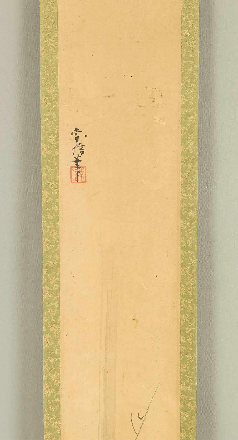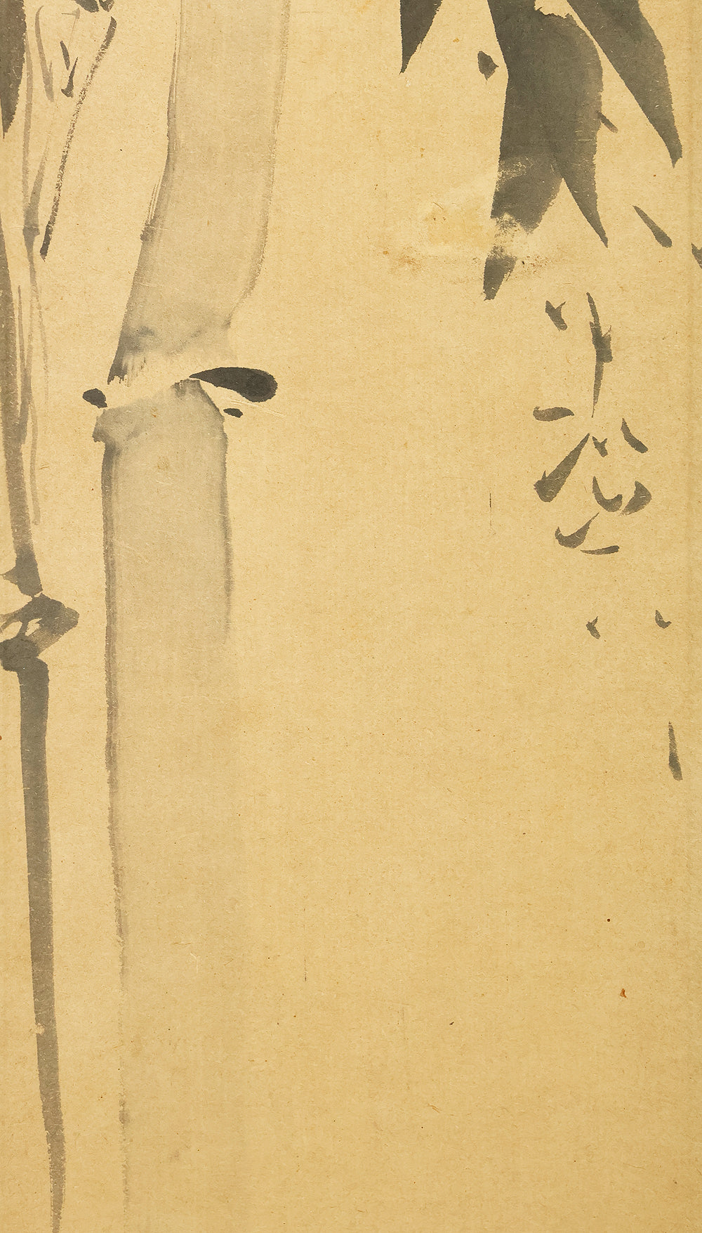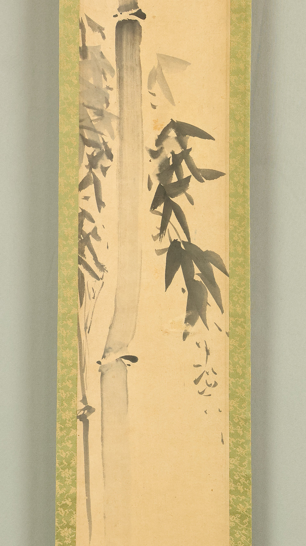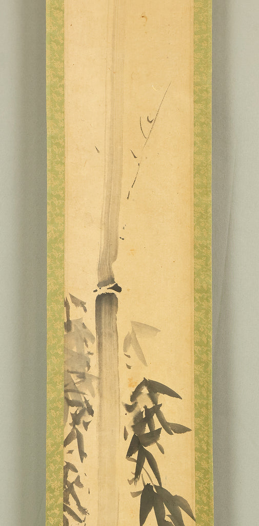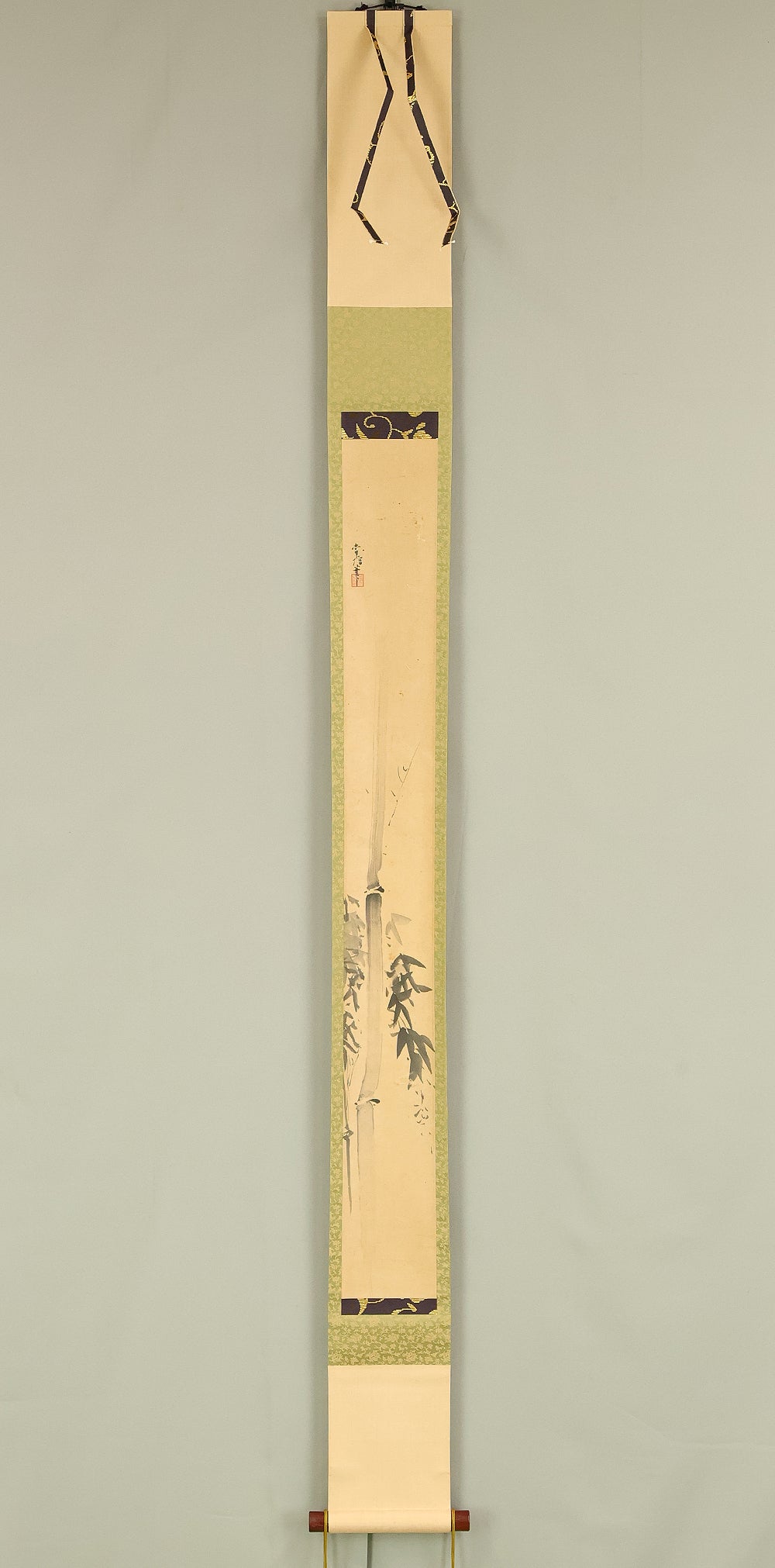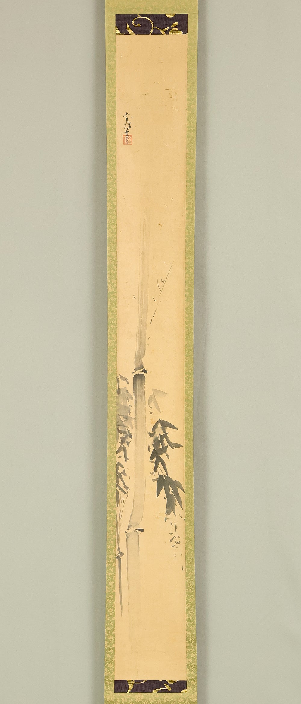 A rare and unusually slender hanging scroll attributed to Kano Tsunenobu (1636–1713), a prominent master of the Kano school. The work depicts a young bamboo stalk painted with superb economy of brushwork, capturing both the vitality and quiet dignity of the subject. The elongated vertical format enhances the sense of upward growth, making the bamboo appear elegant and weightless. Executed in soft ink tones typical of the Kano tradition, this scroll reflects the refined discipline and poetic sensitivity associated with court and shogunate painting of the Edo period. The brush handling is confident yet understated, allowing the natural beauty of the bamboo to speak for itself. Because of its extremely narrow proportions, this piece is particularly suitable for alcove display or intimate interior spaces, where its vertical rhythm adds a graceful architectural accent. A charming example of classical Japanese ink painting, and an appealing choice for collectors seeking works in rare and distinctive formats.